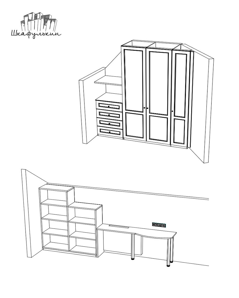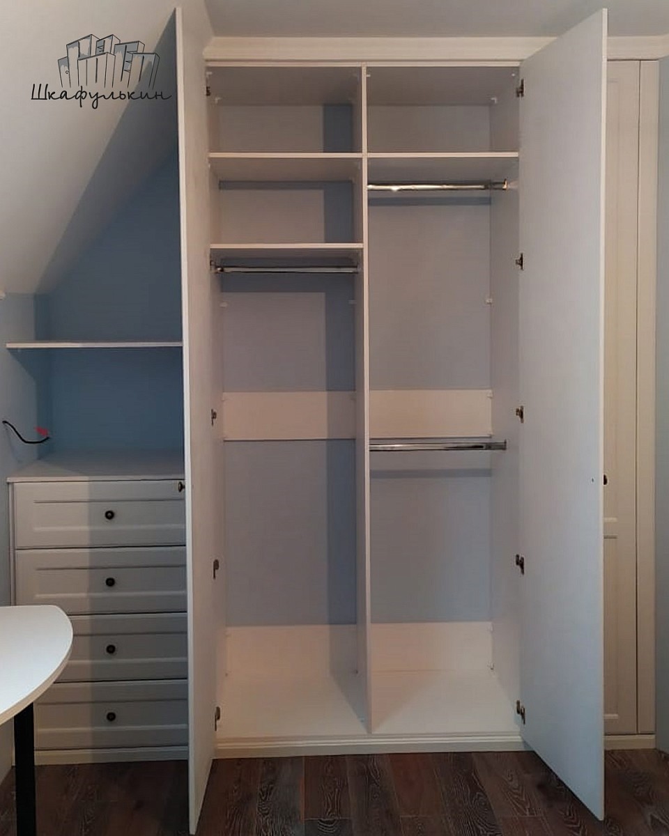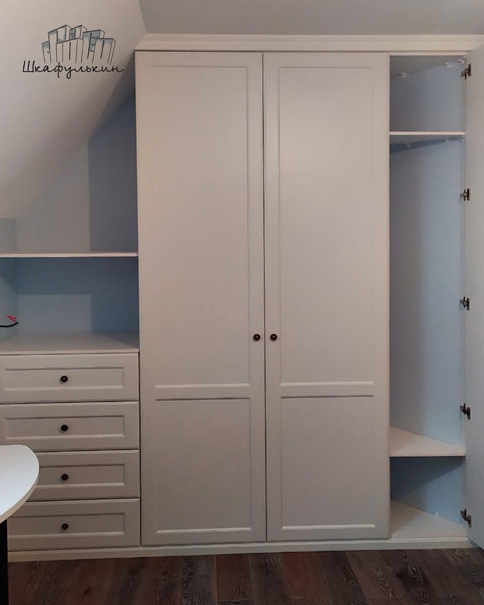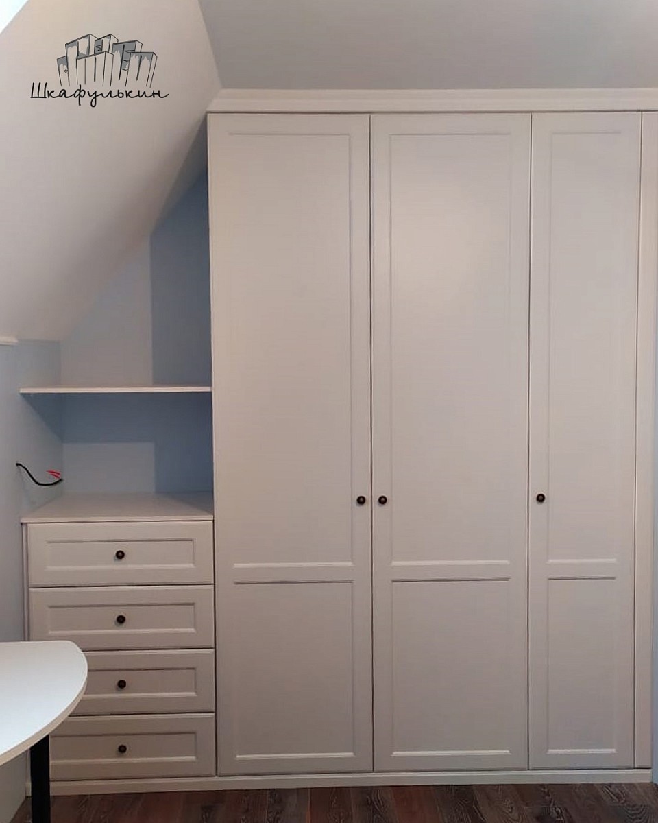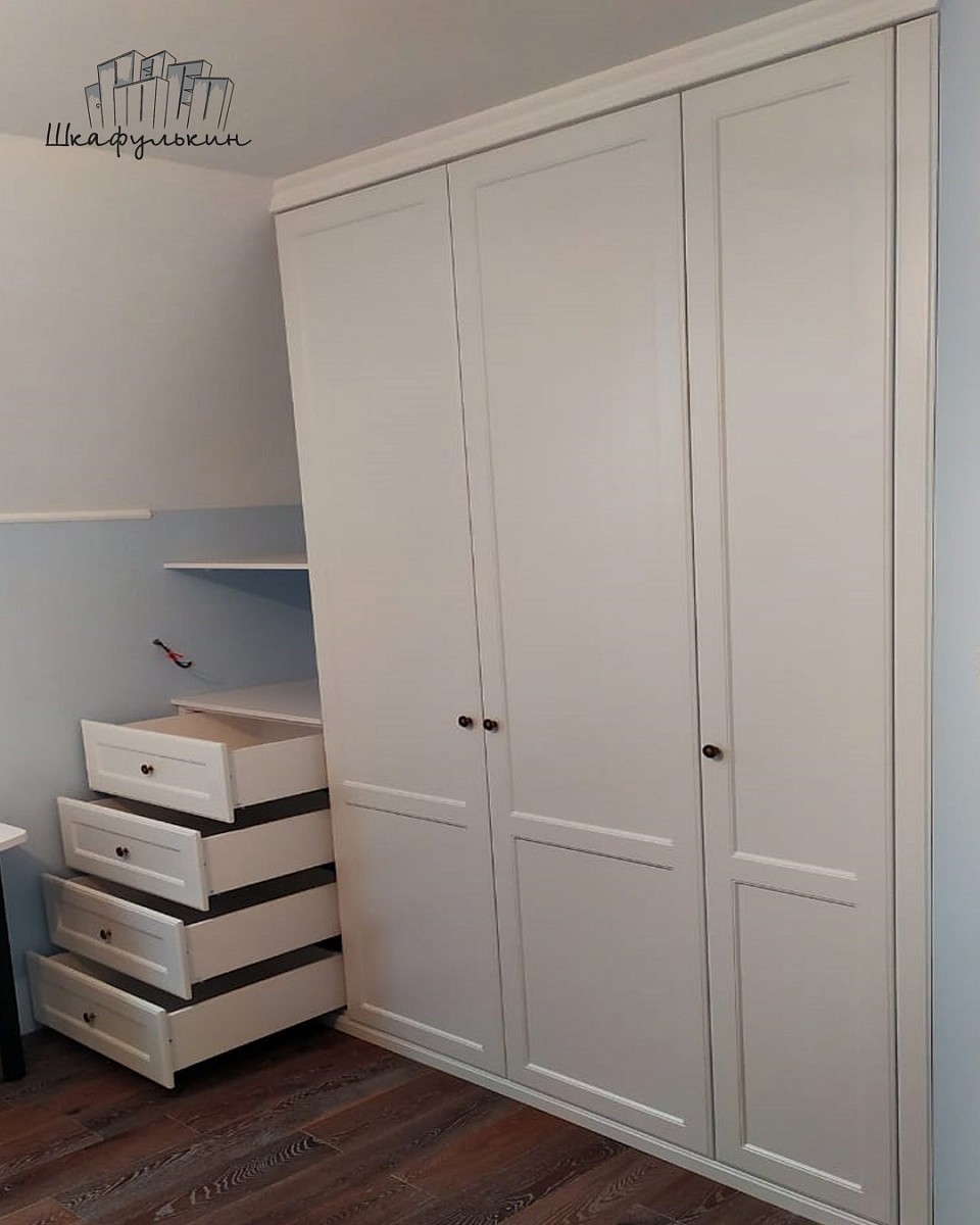 3 двери распашных, 4 фасада ящиков, 1 добор справа в МДФ 19 мм цвет - RAL 9003 матовый, фрезеровка Стандарт, петли.