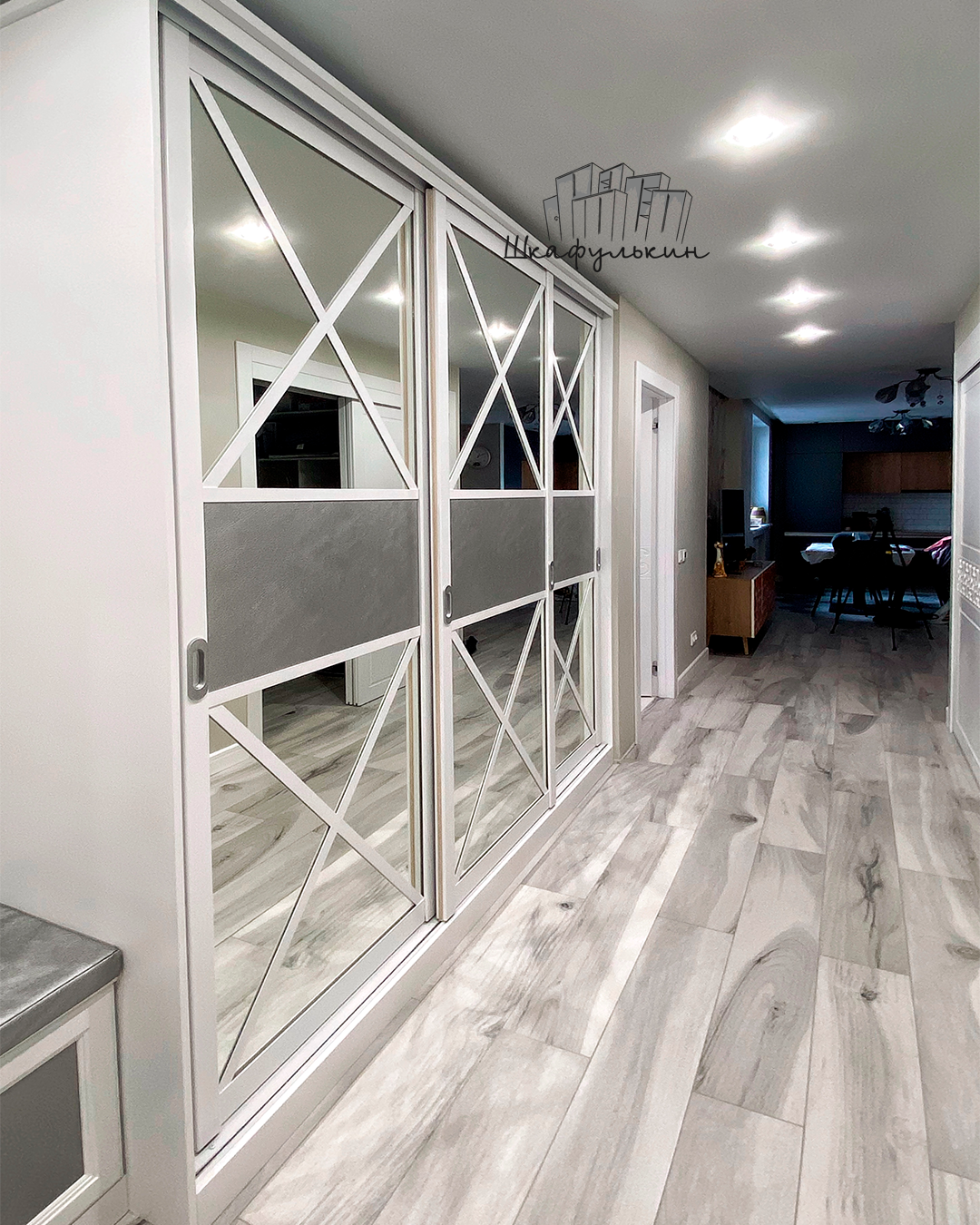Двери-купе: вставки зеркало/серебро + экокожа. Делители/окрас.
