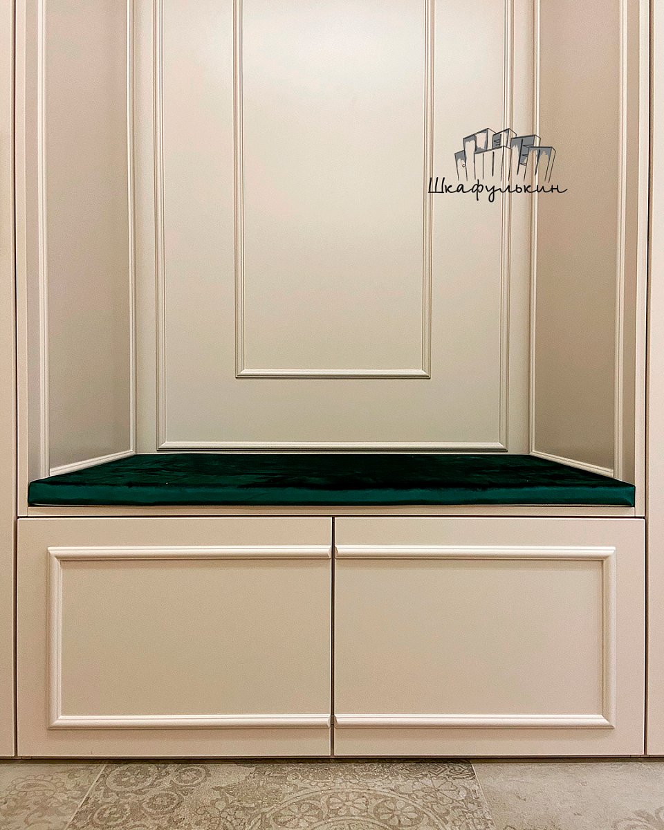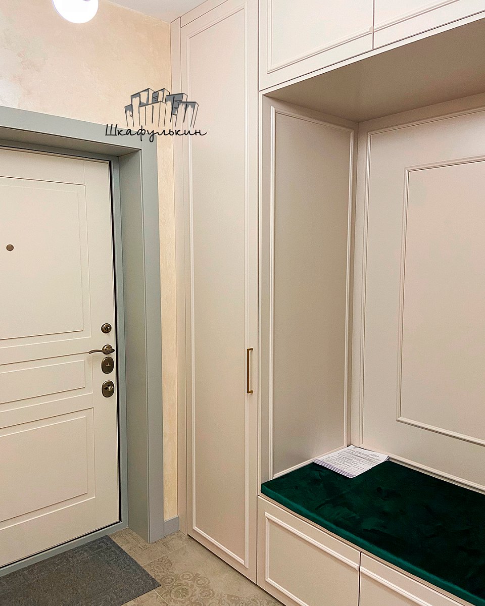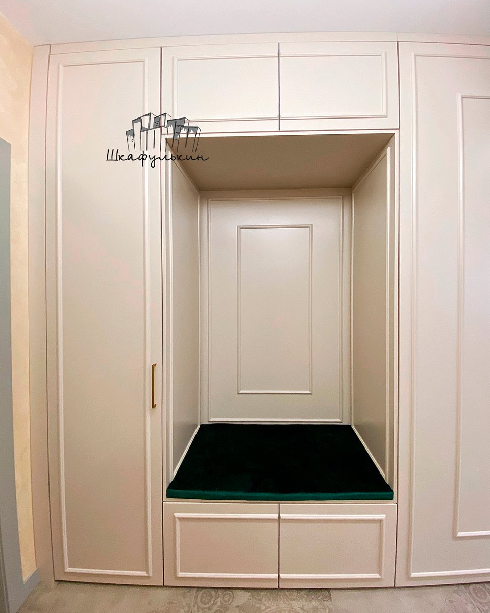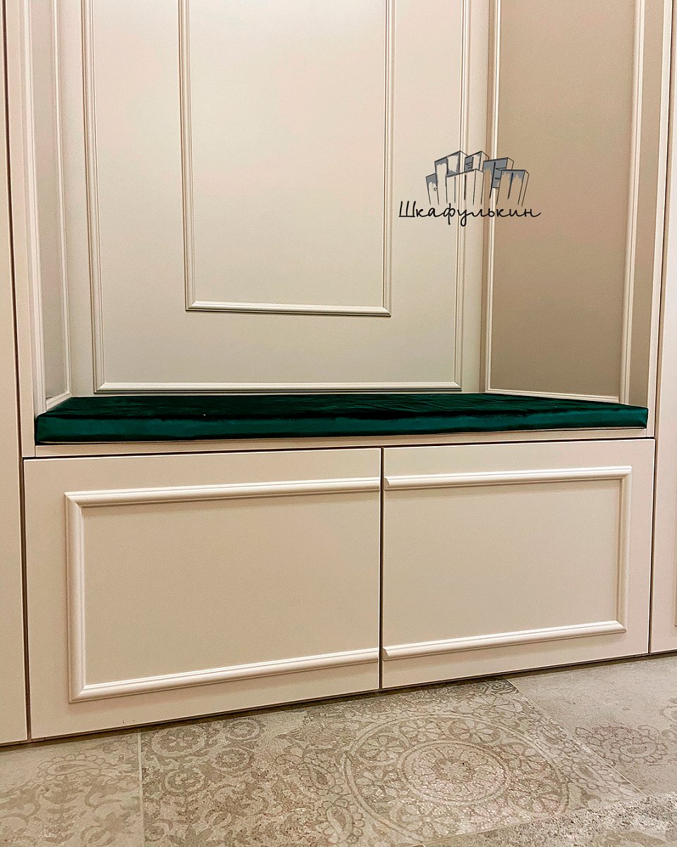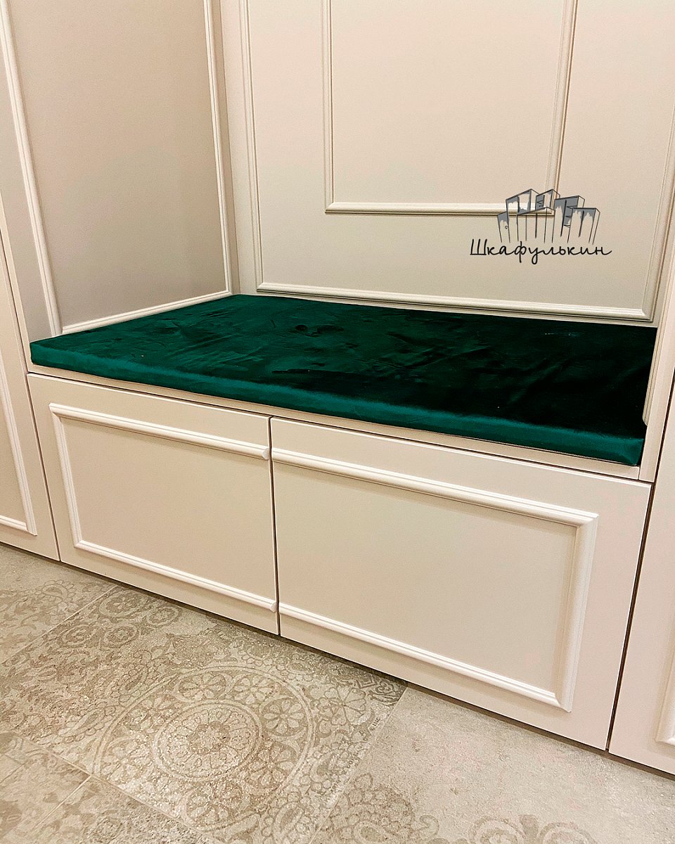 Крышка сидушки, накладные дно и боковины, задняя панель в прихожей в МДФ 16 мм. цвет - NCS S 1002-Y50R матовый.