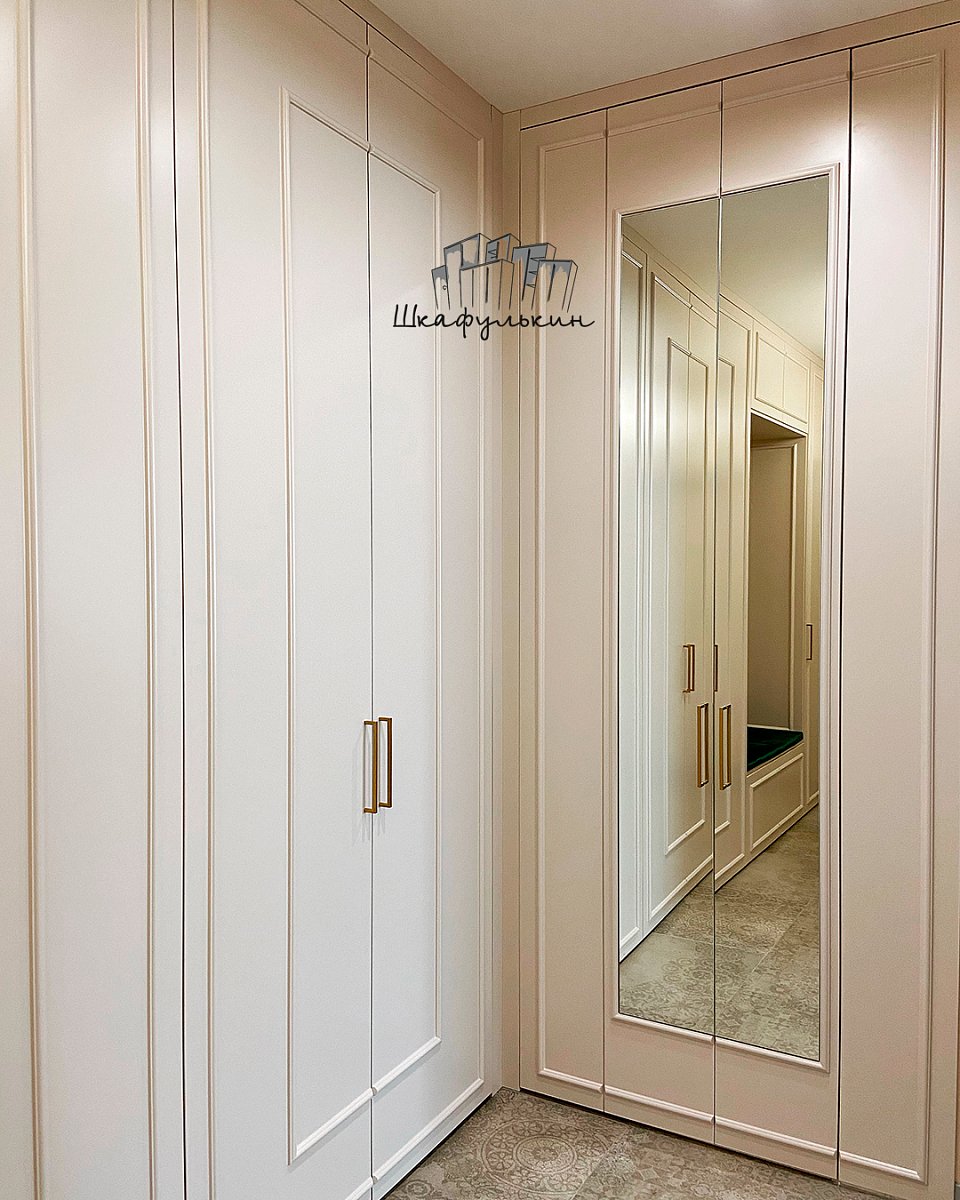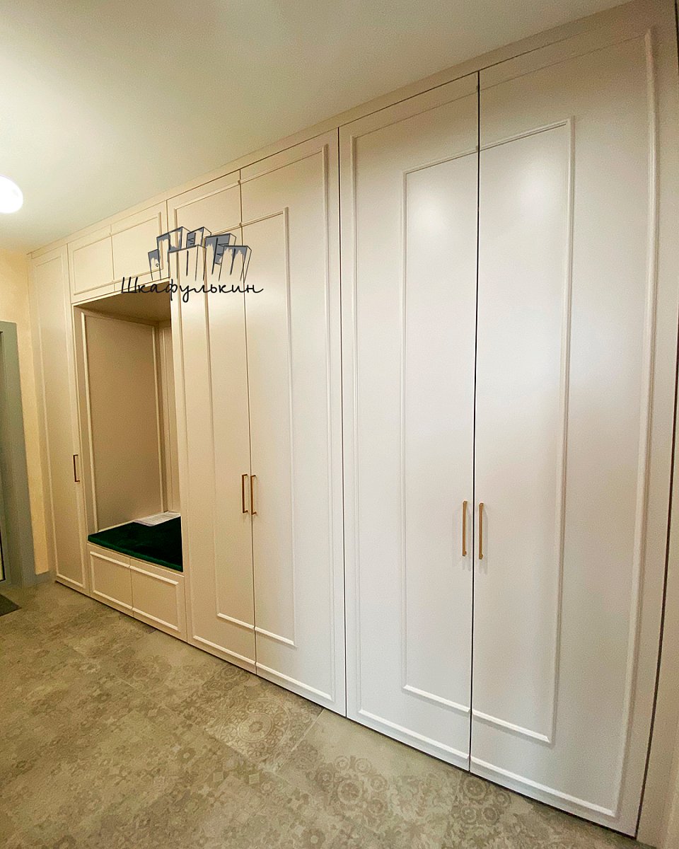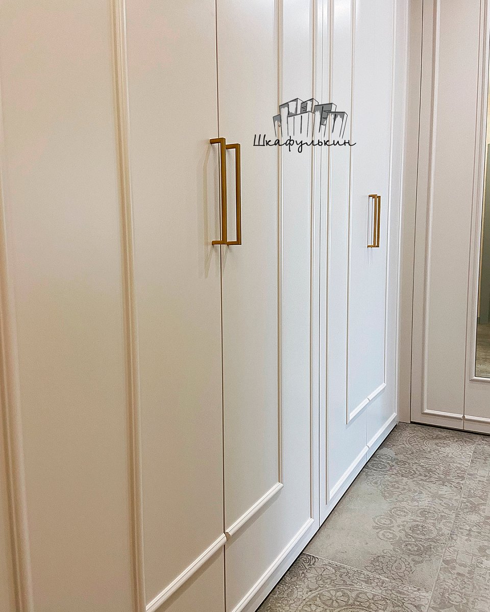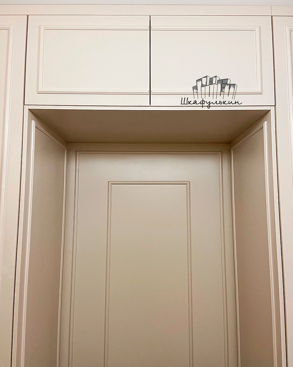 12 дверей распашных, доборы в МДФ 16 мм. цвет - NCS S 1002-Y50R матовый, фрезеровка R2 мм. на двери наклеен молдинг.