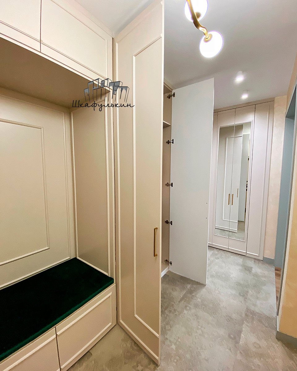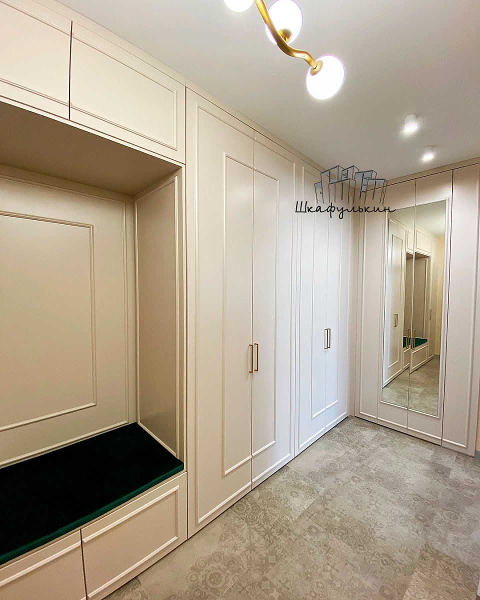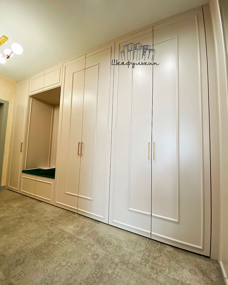 12 дверей распашных, доборы в МДФ 16 мм. цвет - NCS S 1002-Y50R матовый, фрезеровка R2 мм. на двери наклеен молдинг.