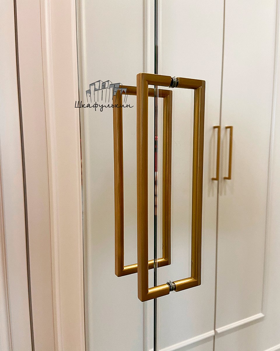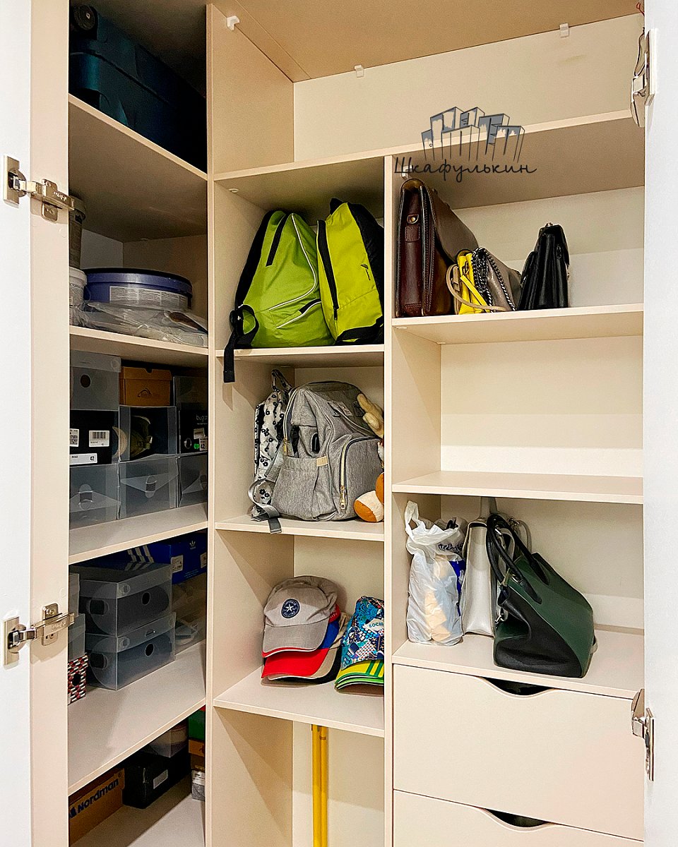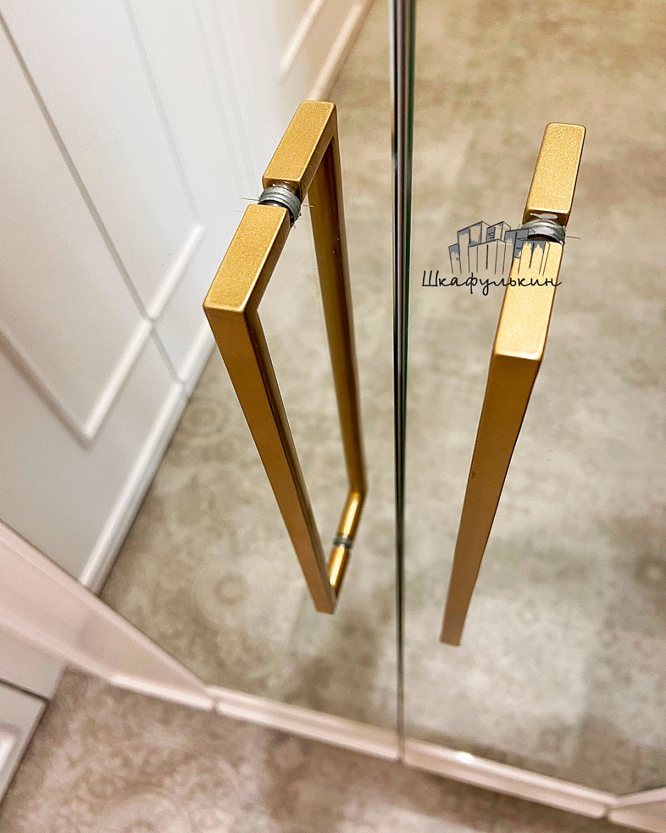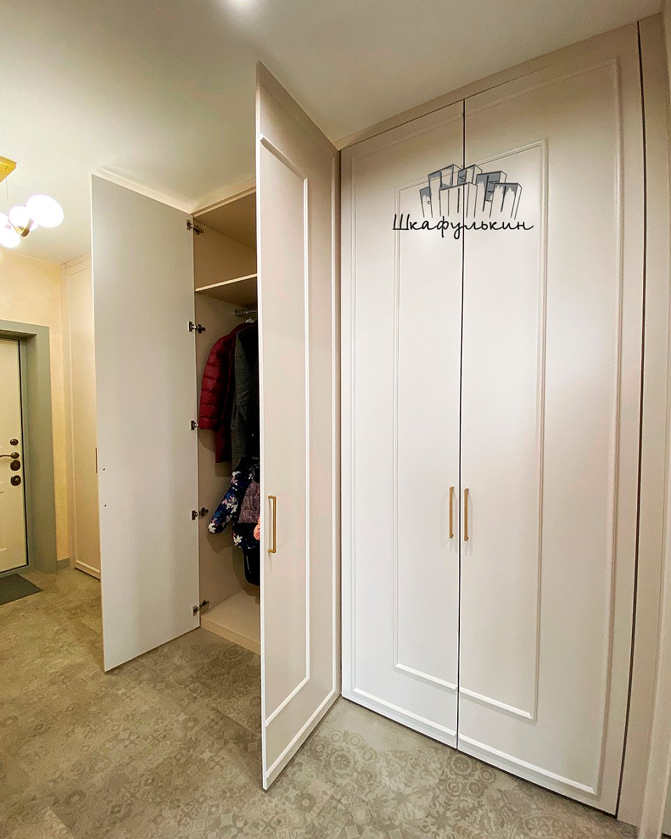 12 дверей распашных, доборы в МДФ 16 мм. цвет - NCS S 1002-Y50R матовый, фрезеровка R2 мм. на двери наклеен молдинг.