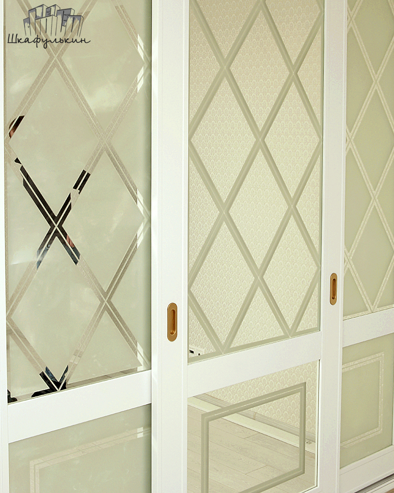Двери: ДСП EGEER, зеркало с пескоструйным рисунком, с пленкой безопасности, тихоходные ролики, шлегель, позиционер.