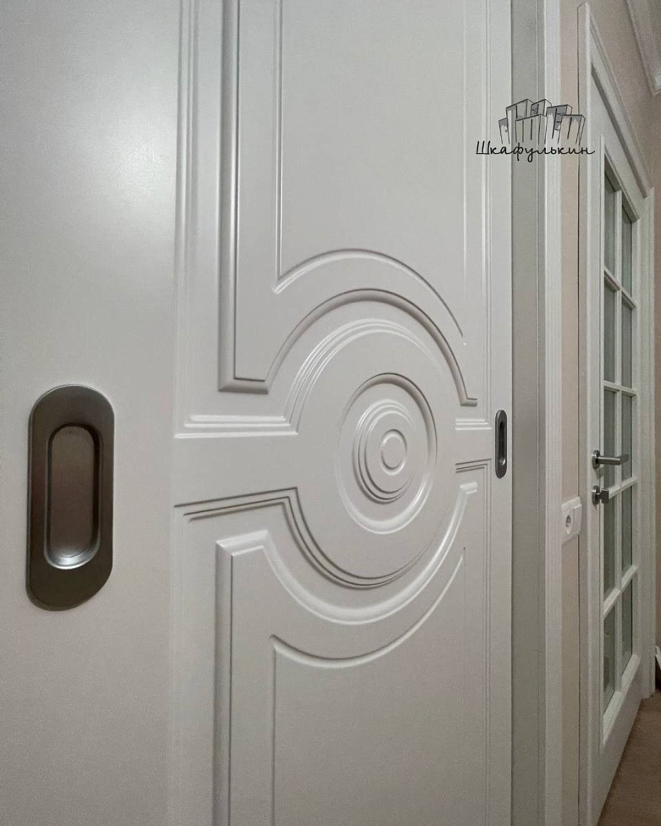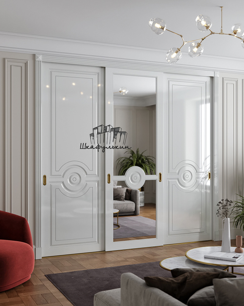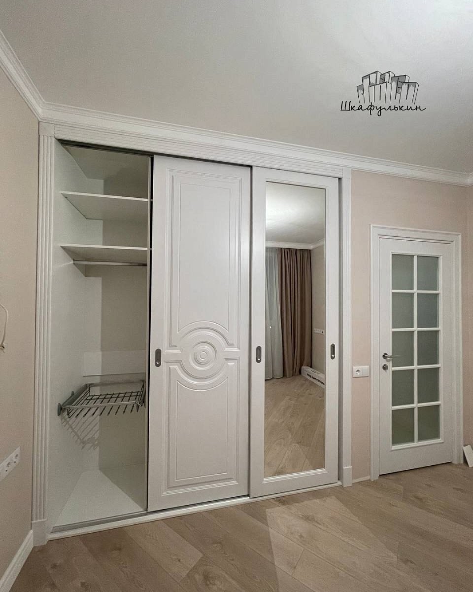 Фасады купе 3 шт: Профиль - МДФ 25 мм. С фрезеровкой как у шкафа №1 Монро, цвет - RAL 9003 матовый, треки - Серебро матовое. Ручки - Хром матовый - 4 шт.