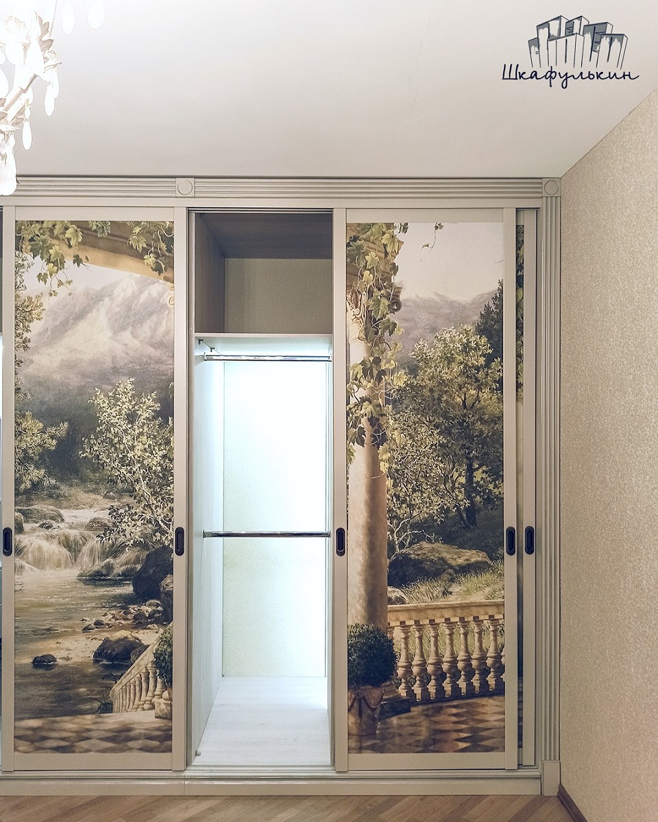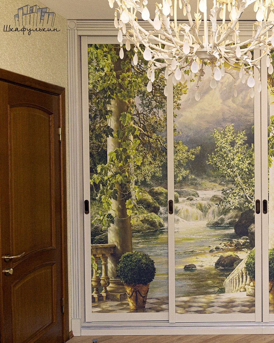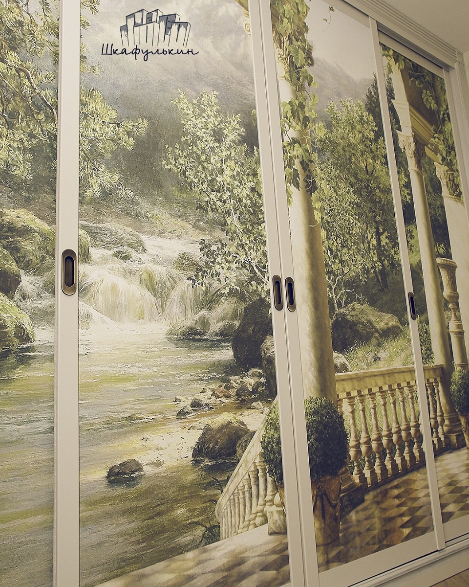 Наполнение дверей купе: ЛДСП 8мм (остатки производства) + фреска "Терраса у ручья с видом на природу", вид материала - песок.