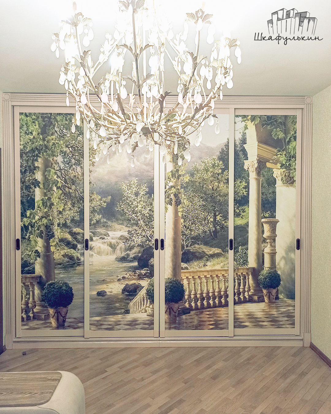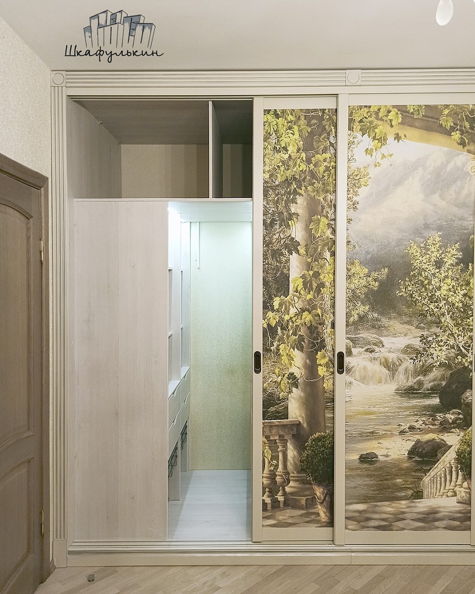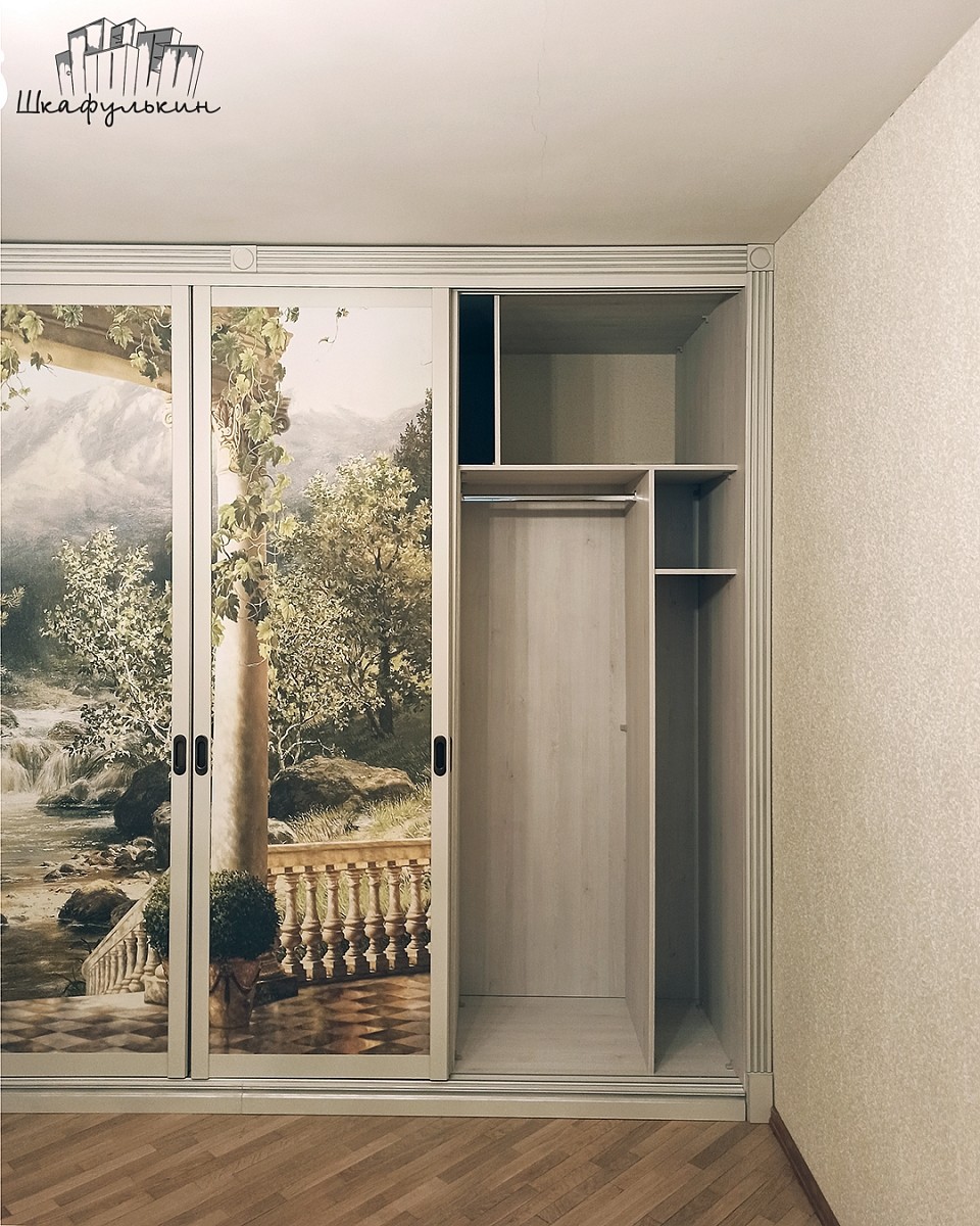 Наполнение дверей купе: ЛДСП 8мм (остатки производства) + фреска "Терраса у ручья с видом на природу", вид материала - песок.