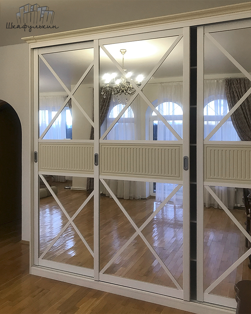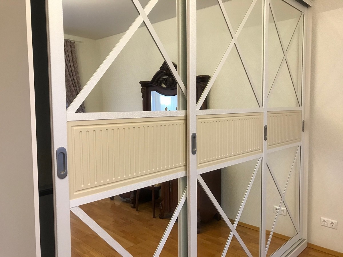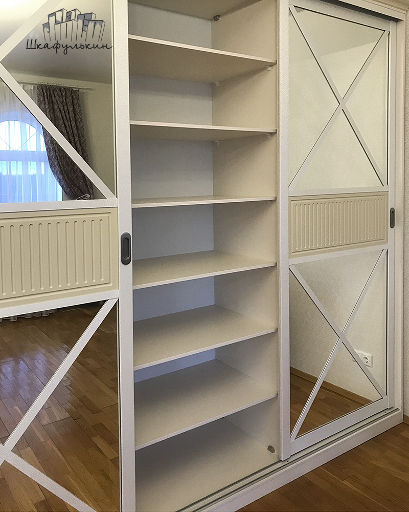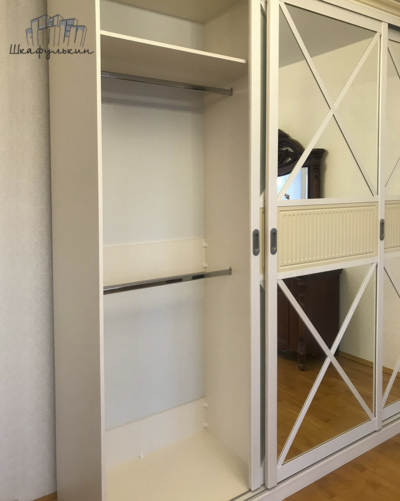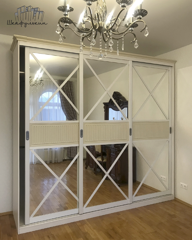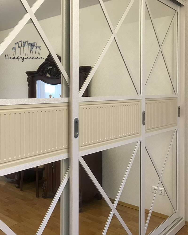 Двери: вставка МДФ, ДСП EGEER, зеркало с перекрестием, тихоходные ролики, шлегель, позиционер.