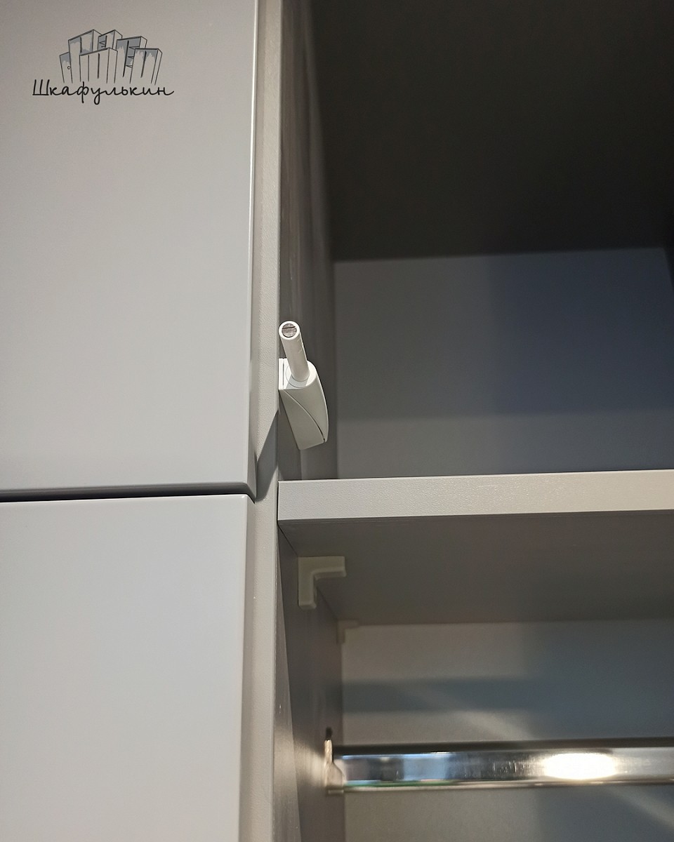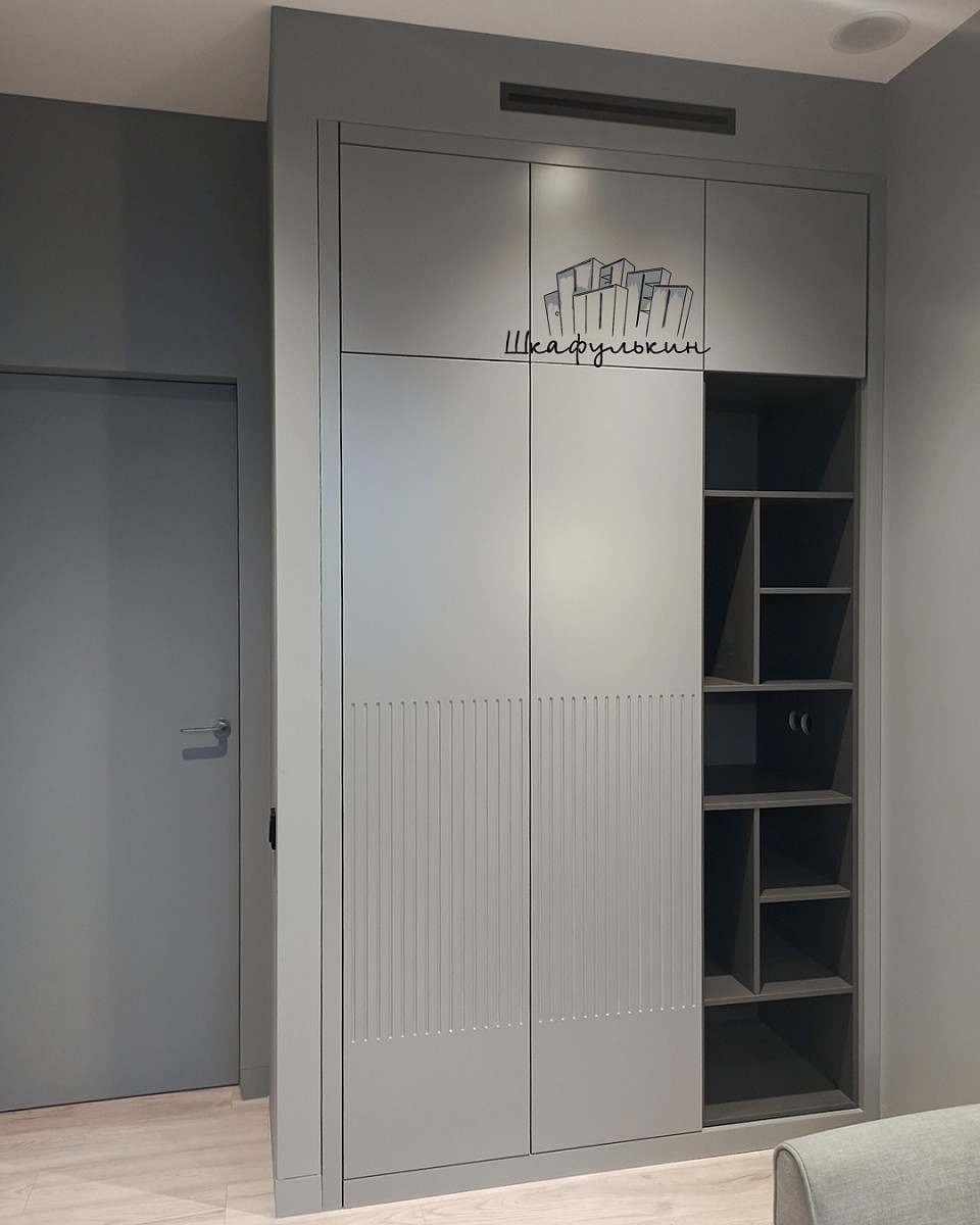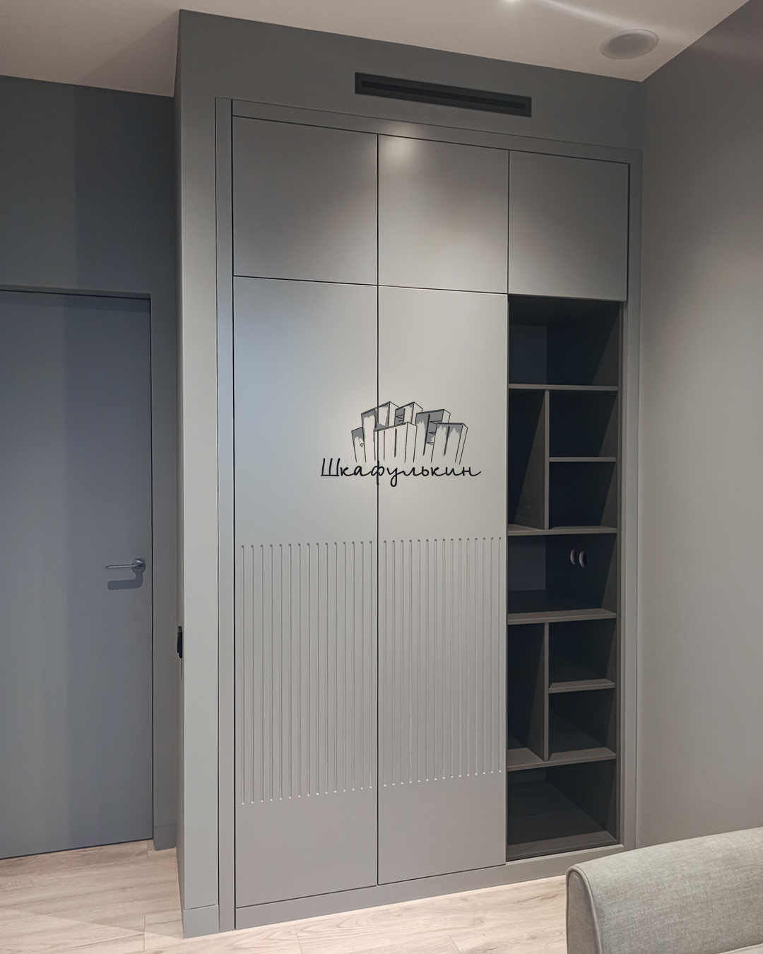 5 фасадов распашных: МДФ 19мм RAL7045 матовый двухсторонний. На нижних фасадах фрезеровка: вертикальные пазы.