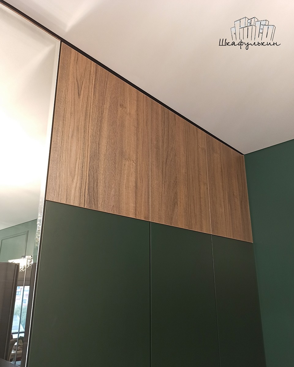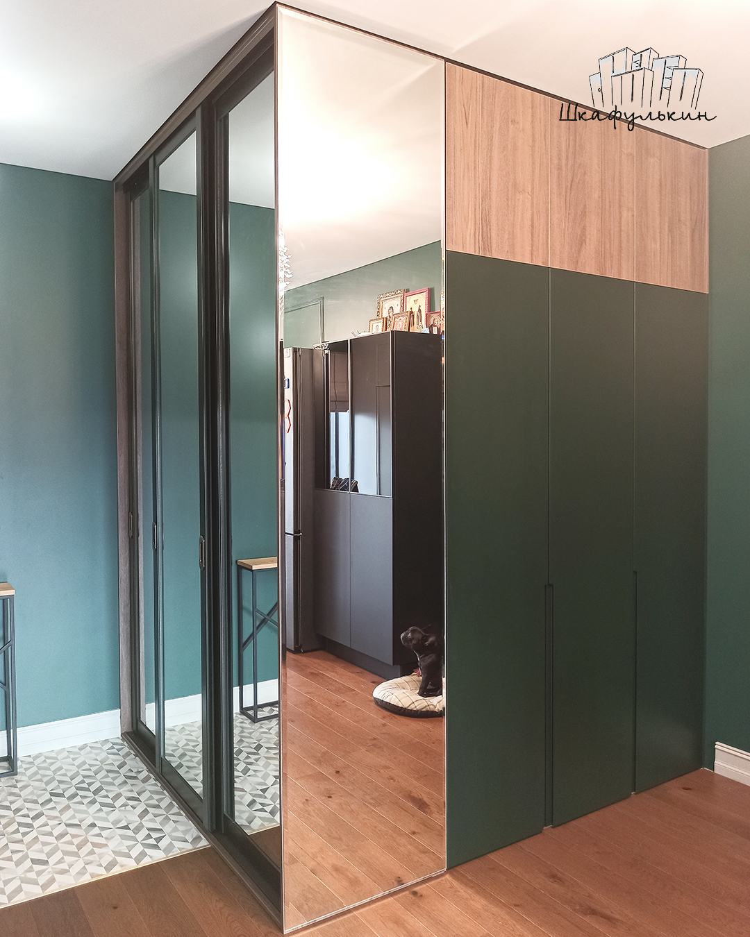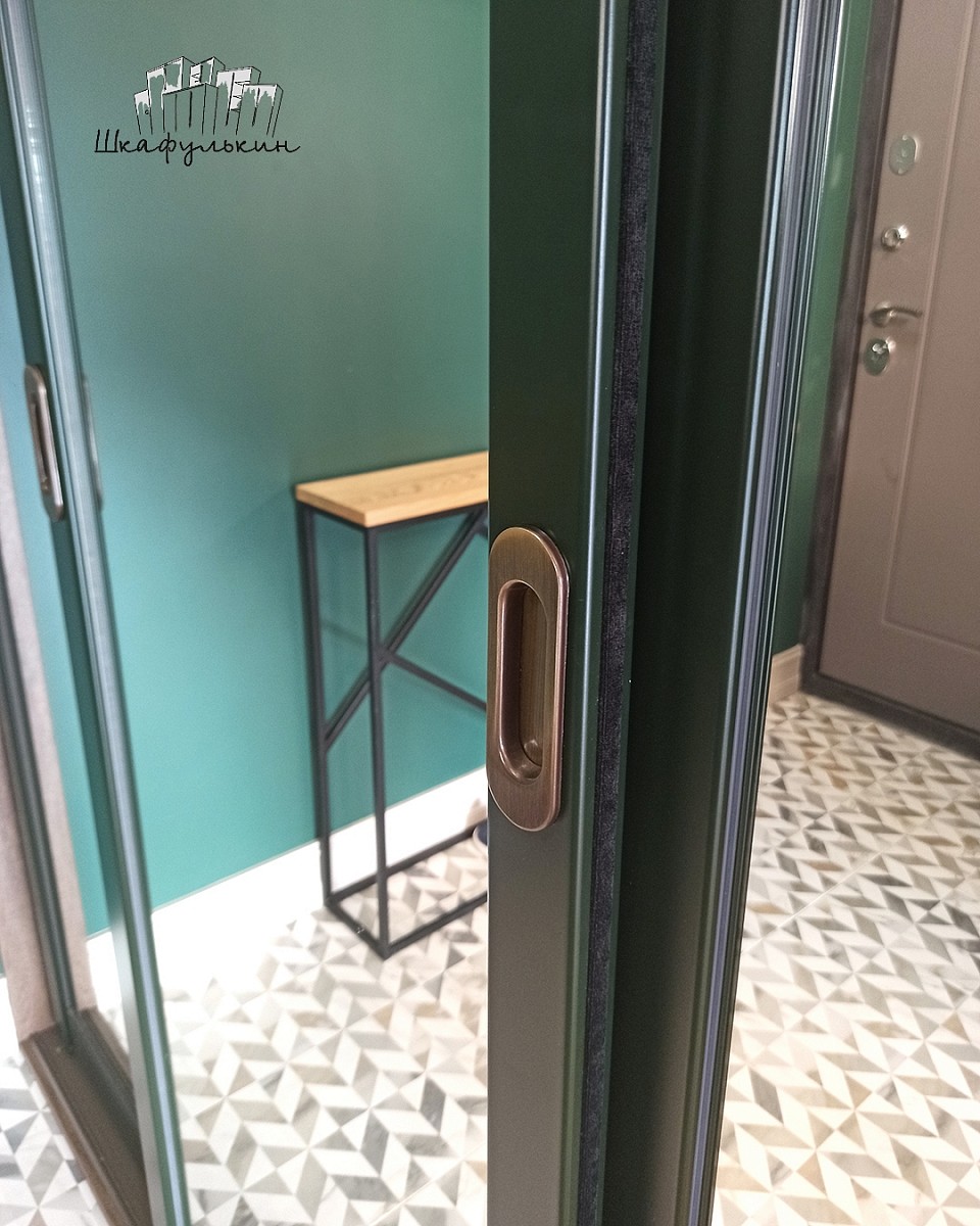 2) Двери -купе HOLZ 55, RAL 6009 мат., вставка зеркало, треки ШАМПАНЬ RAL 6009 мат., ручки овал бронза,