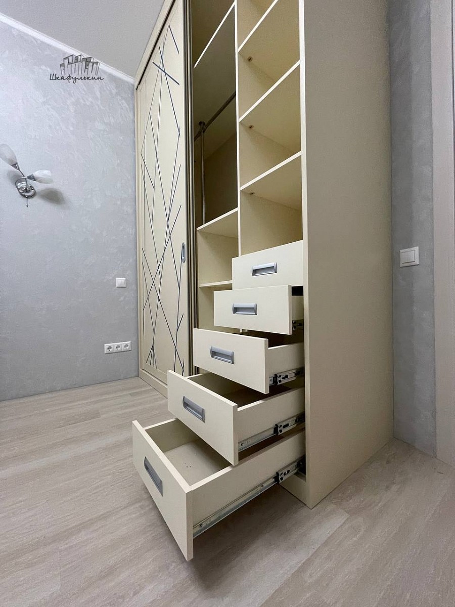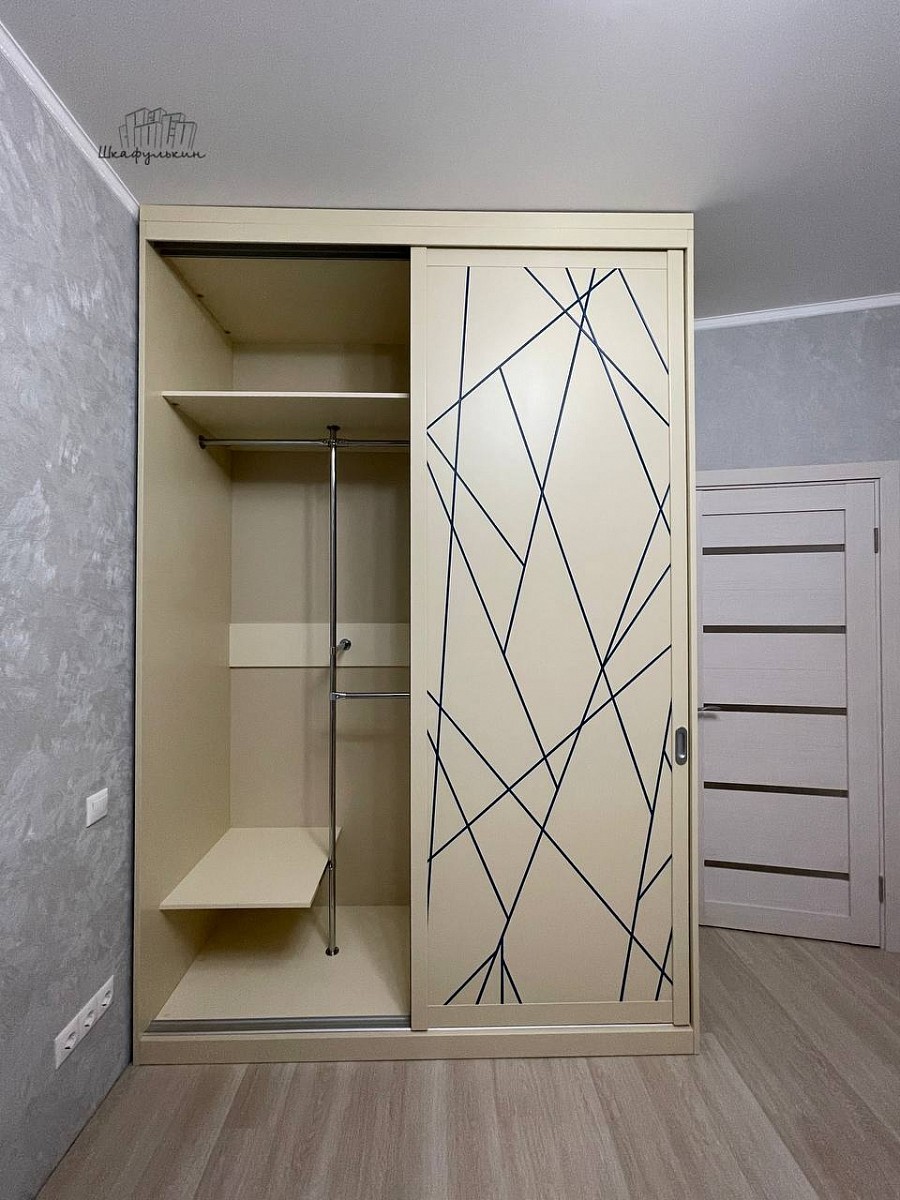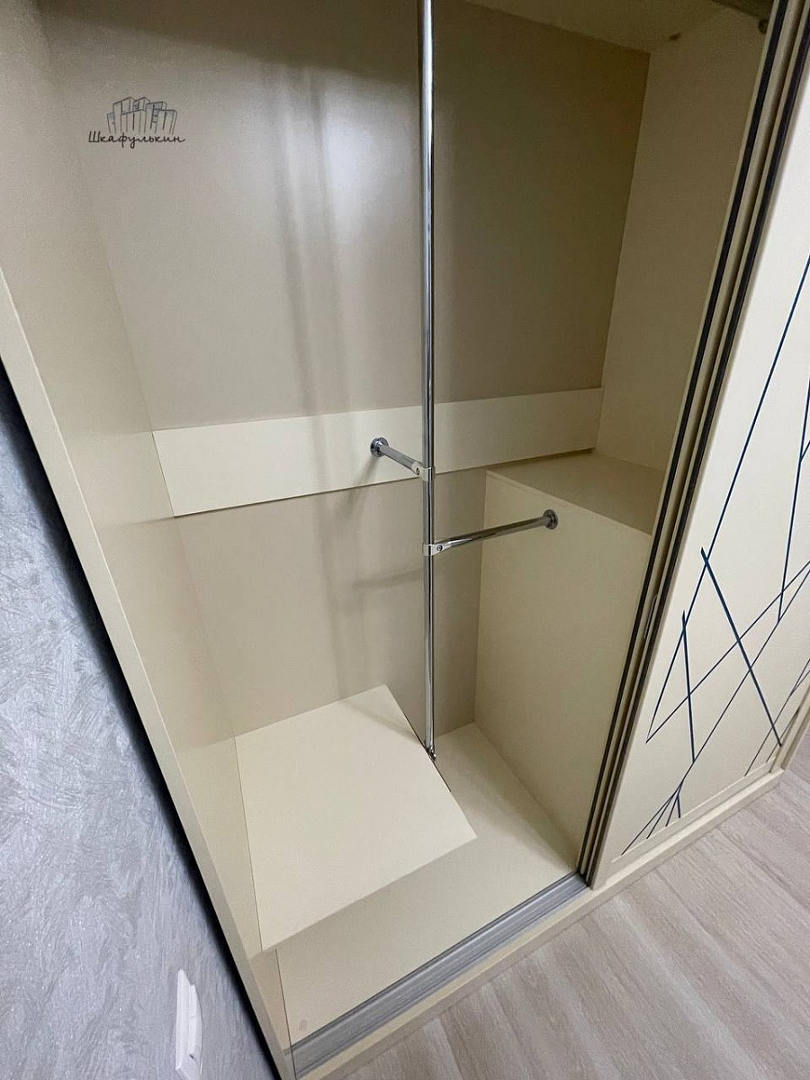Двери-купе: 2 шт. / HOLZ 55х30, покраска: RAL 1015 матовая / вставка: МДФ 08мм RAL 1015 односторонняя матовая / треки: Серебро / заливка в канавки RAL 5009.