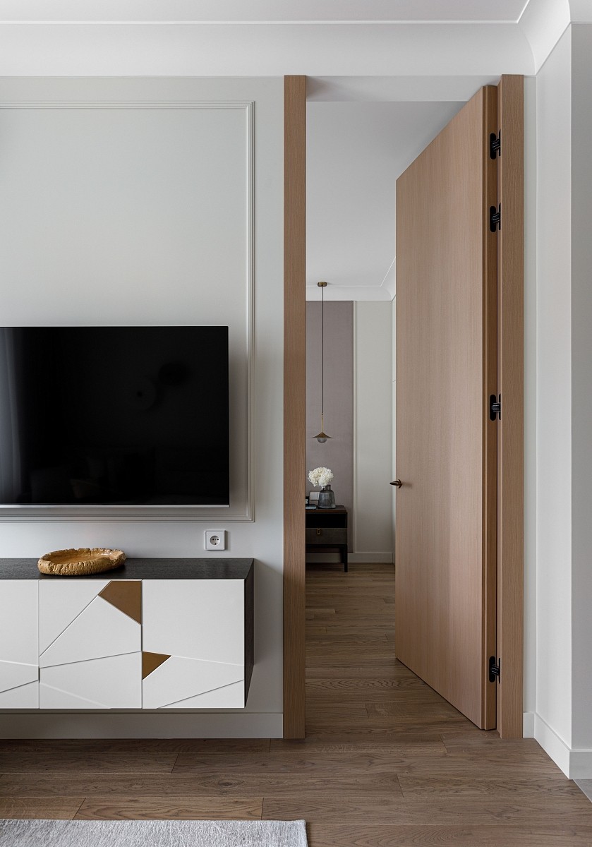 В ЖК Фили Сити воплотили мебельные идеи Ольги в современном интерьере, вся мебель в проекте выполнена в белоснежных оттенках с золотыми и древесными акцентами.