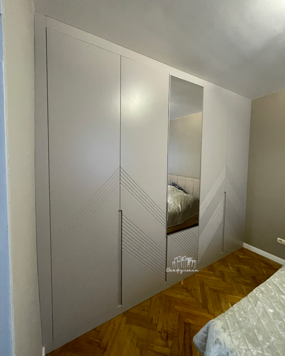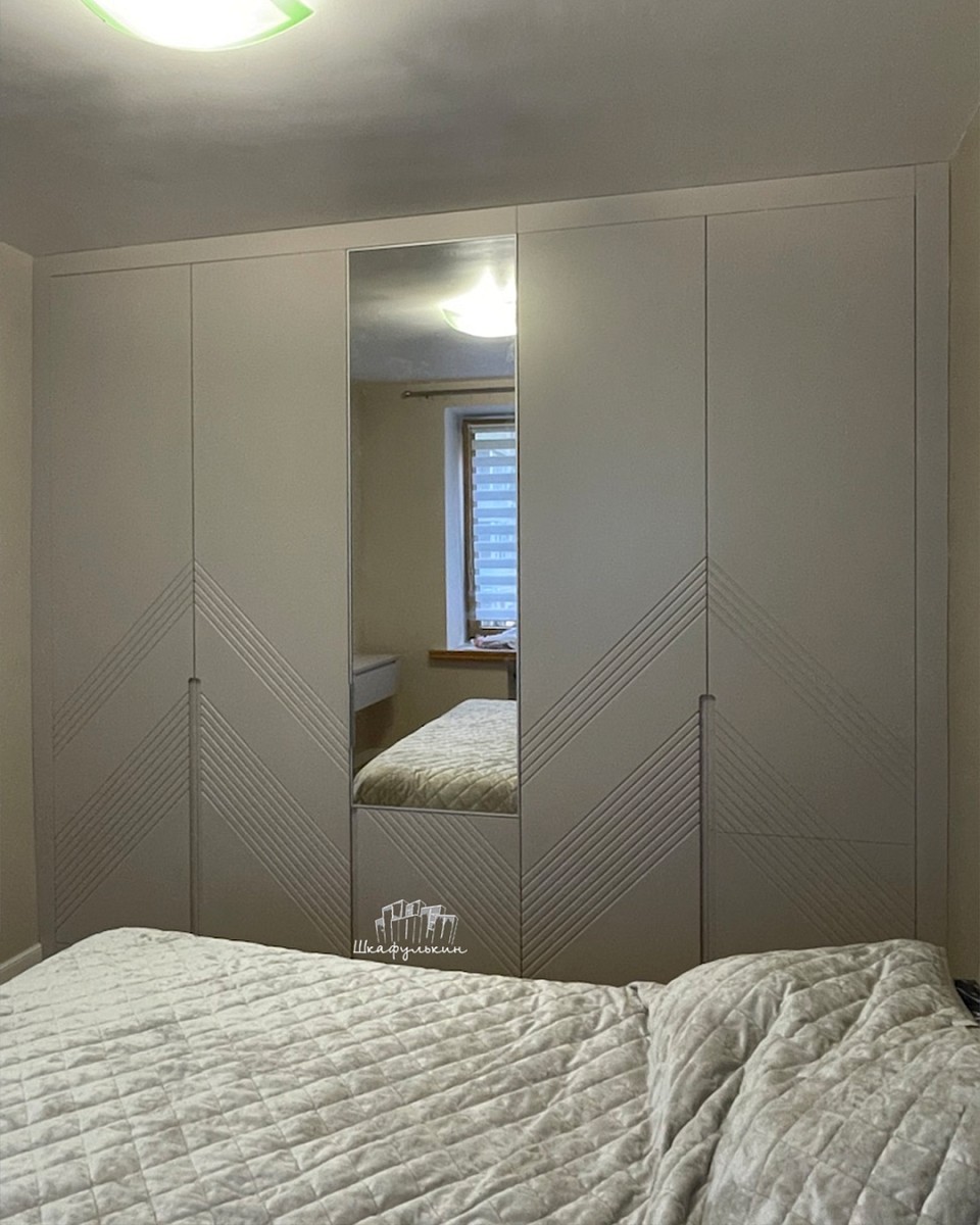 Фасады: МДФ 19мм/покраска: NCS S 2005 Y50R/рамочный AL профиль + зеркало серебро.