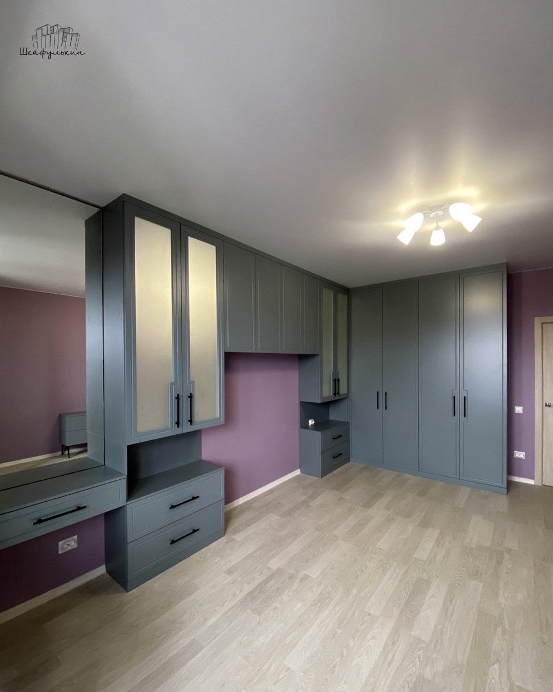 Фасады: МДФ 19мм/NCS S 5005 B20 G/AL профиль + зеркало серебро.