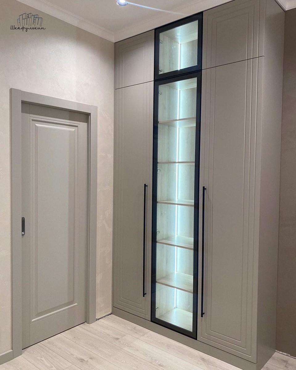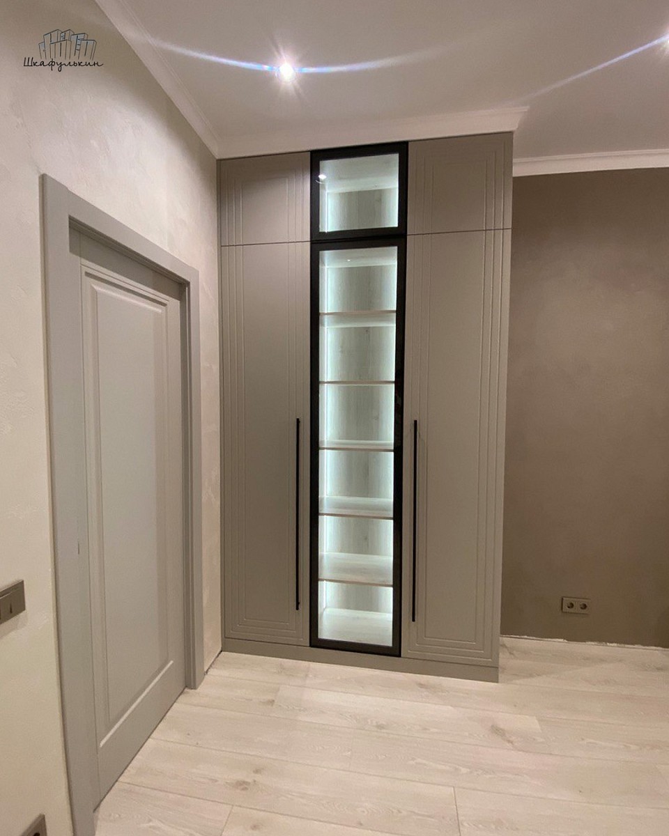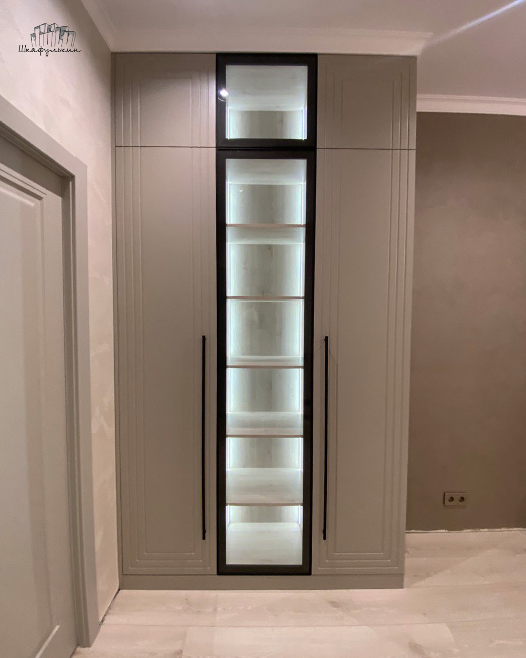 Фасады: МДФ 19 мм/RAL 7044/AL профиль со стеклом.
