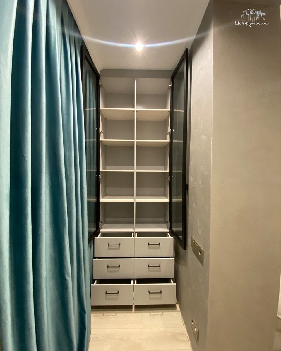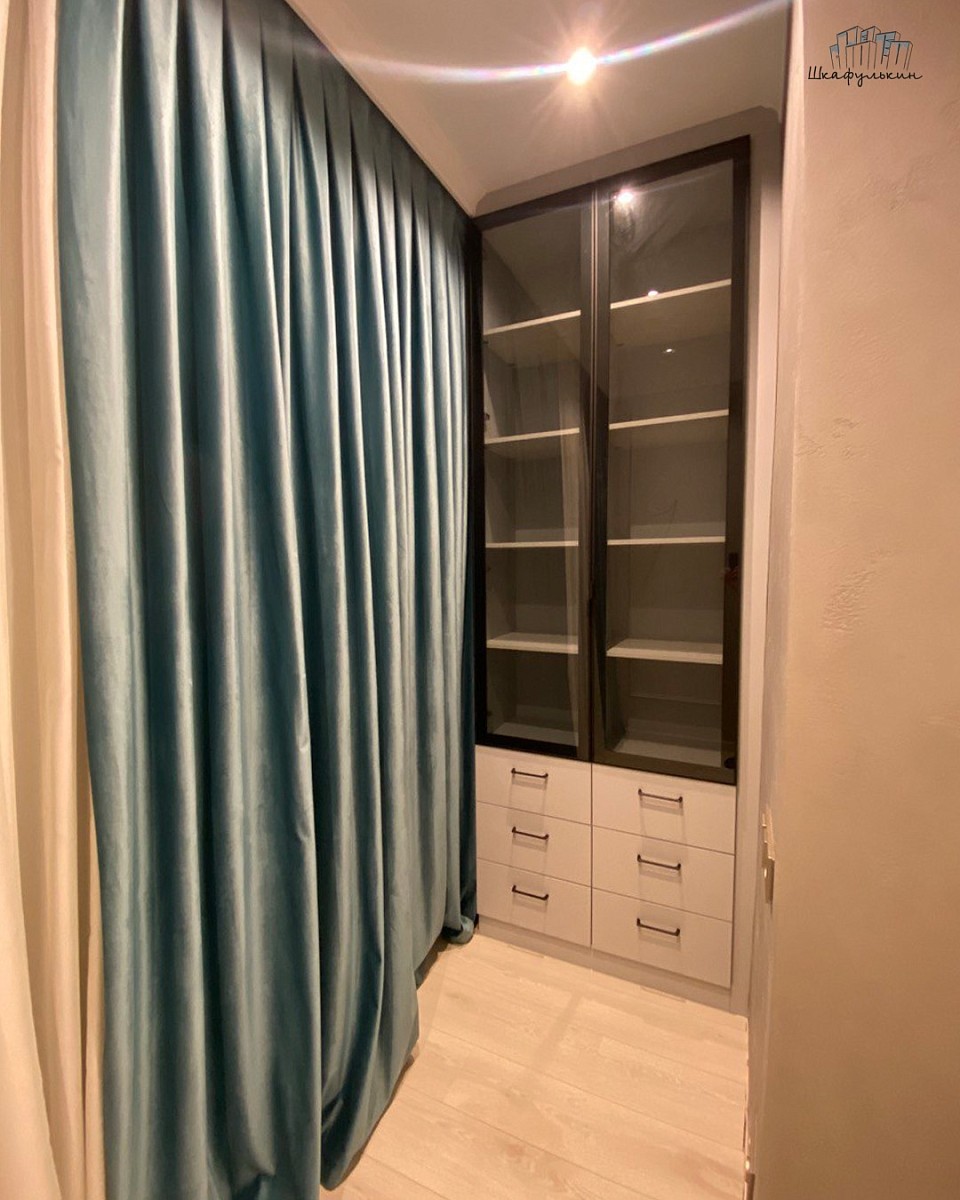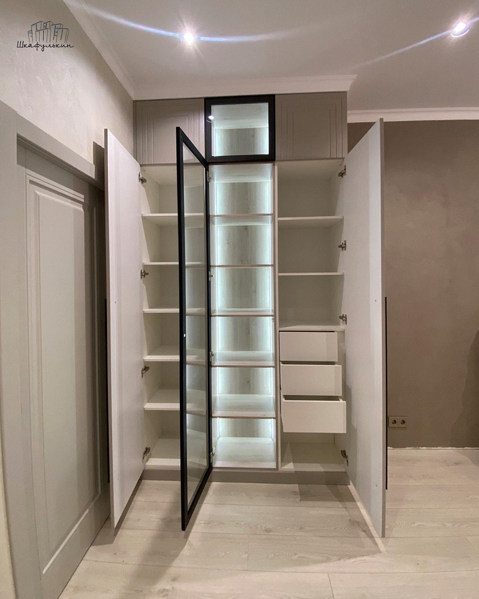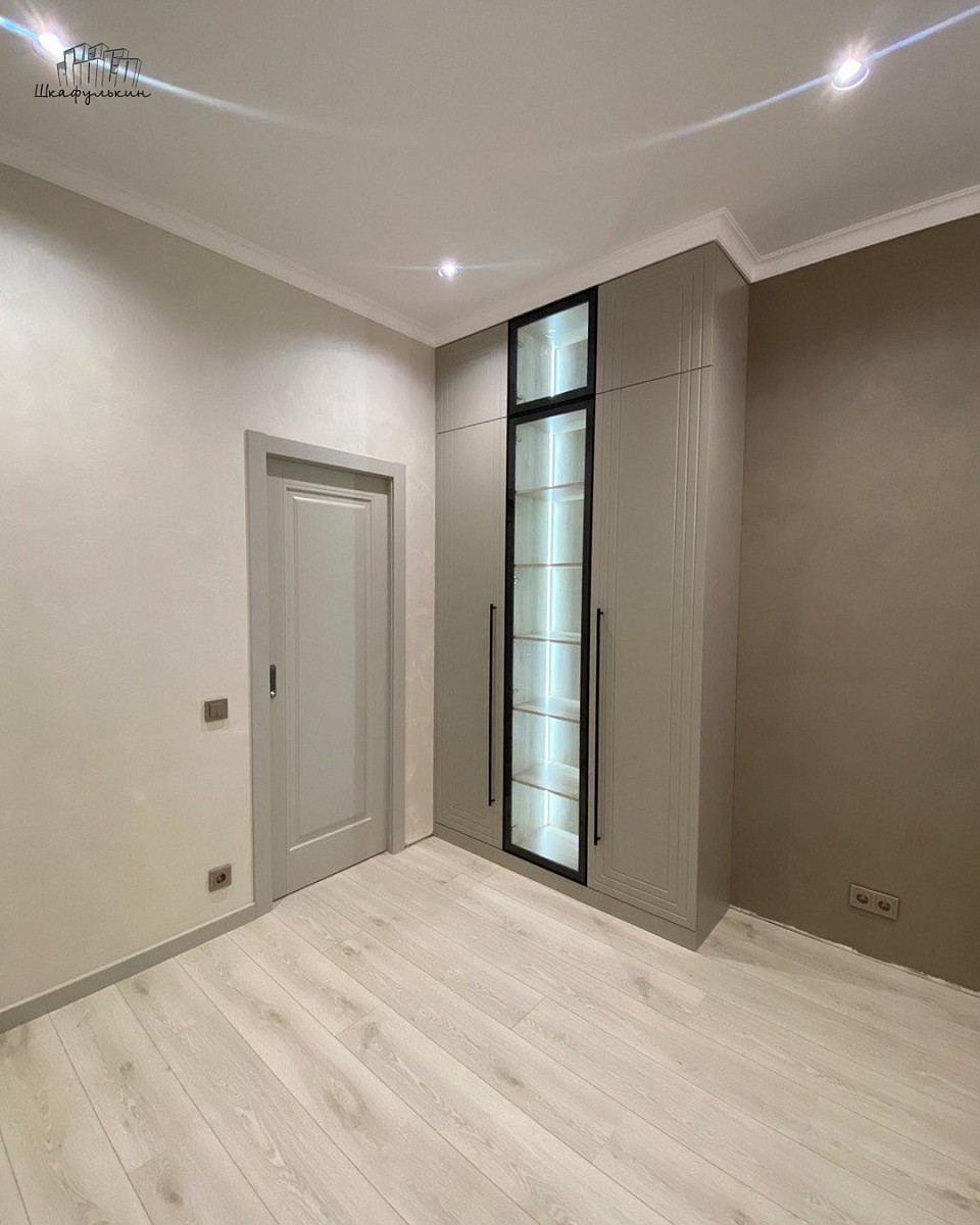 Фасады: МДФ 19 мм/RAL 7044/AL профиль со стеклом.