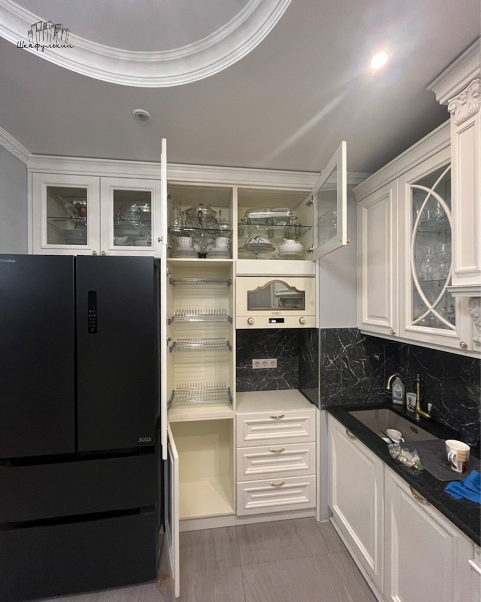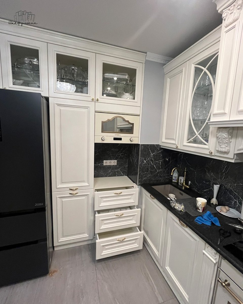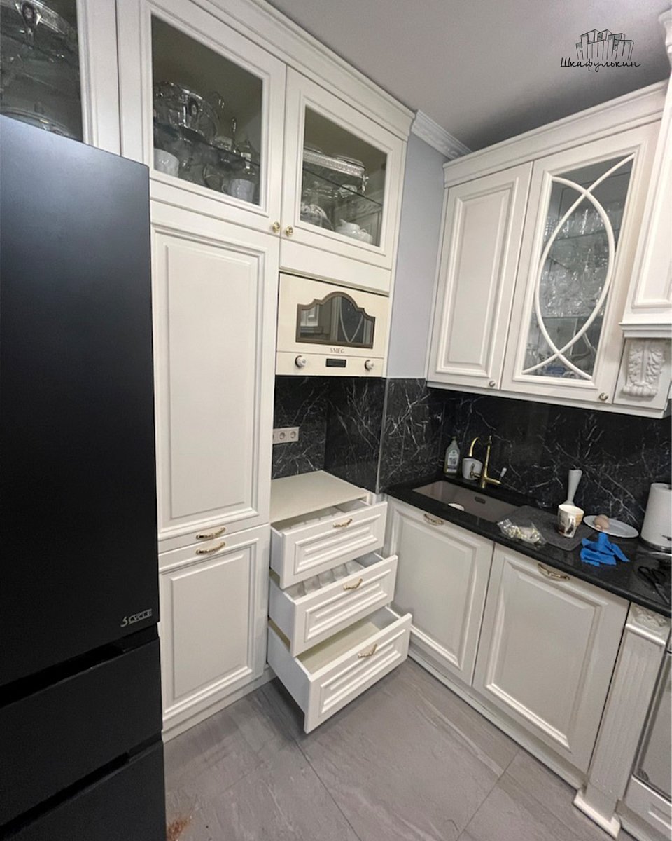 Фасады: МДФ 25 мм/RAL 9010, вставка стекло.