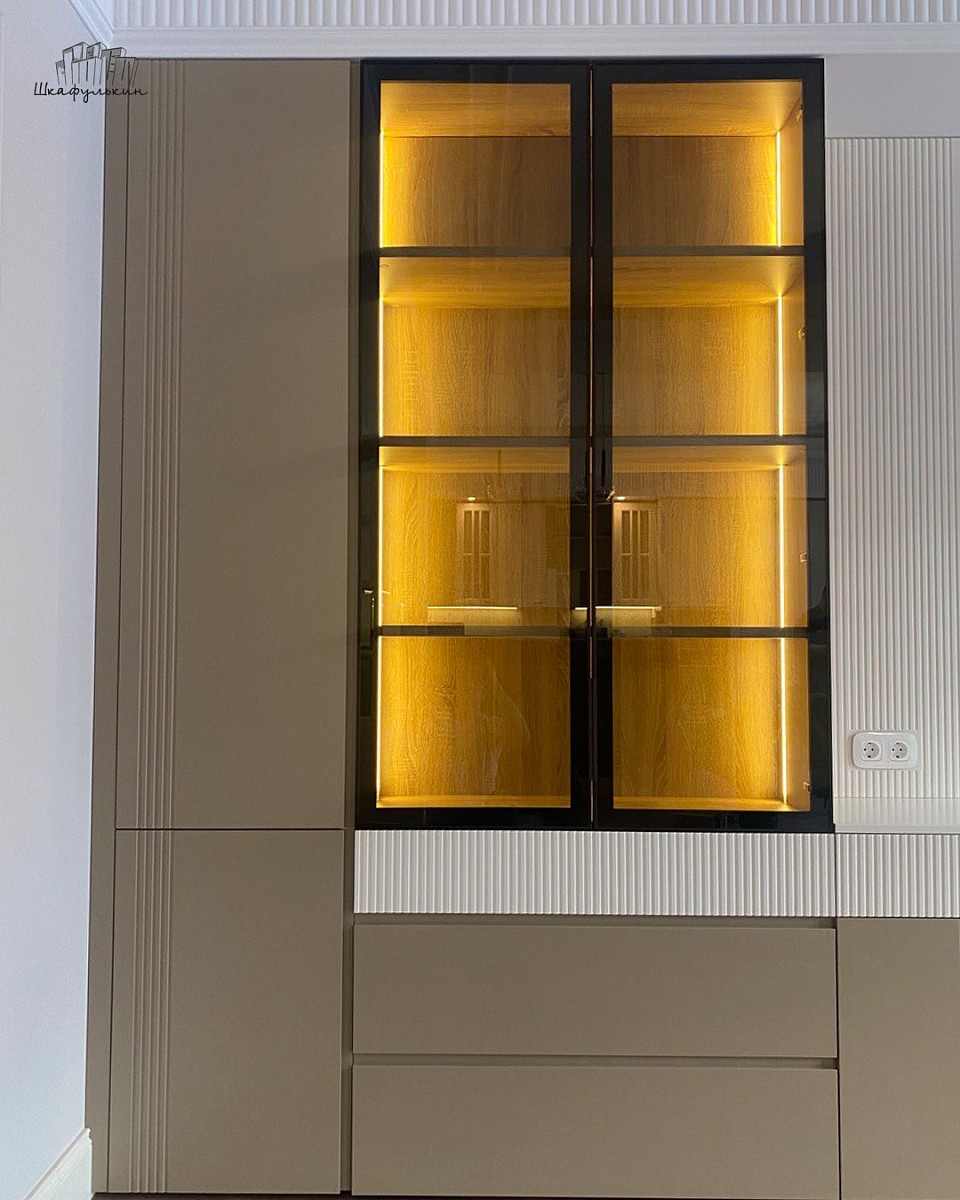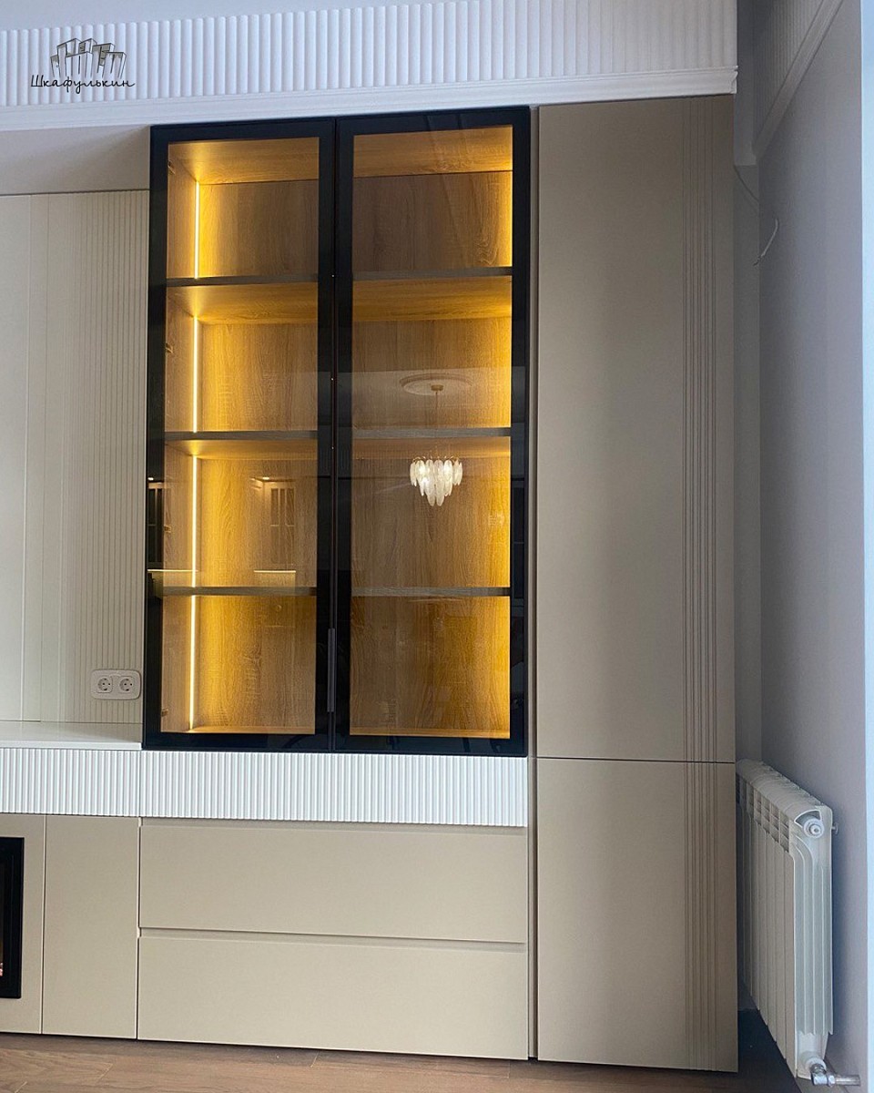 Фасады: МДФ 19 мм/RAL 9010/ AL профиль со стеклом Графит.