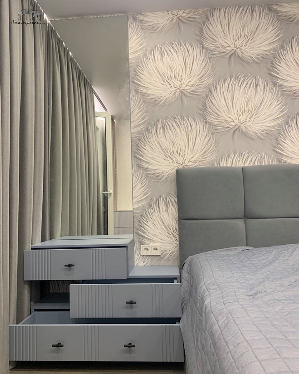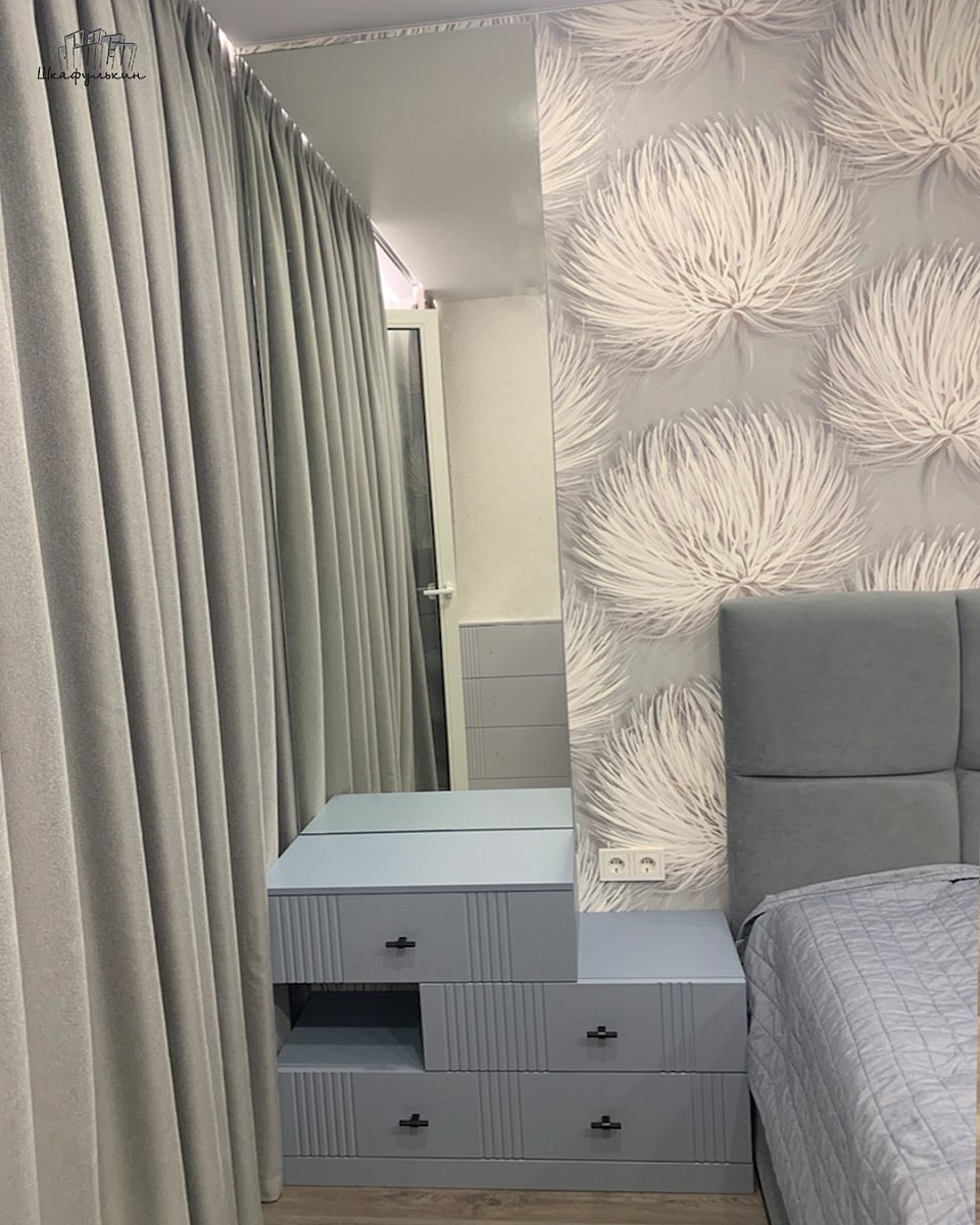 Фасады: МДФ 19 мм/NCS S 3010 R90B с тонированным стеклом.