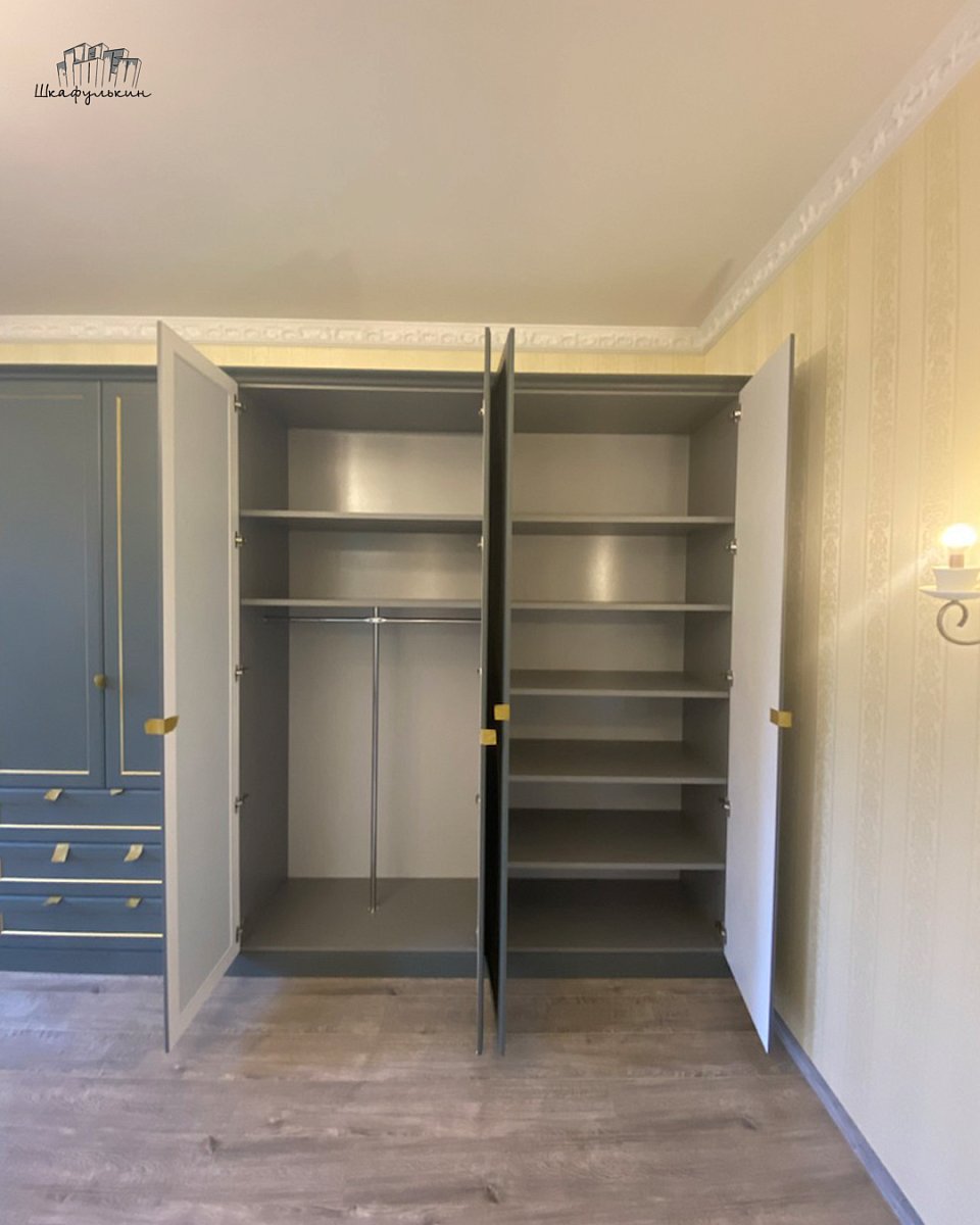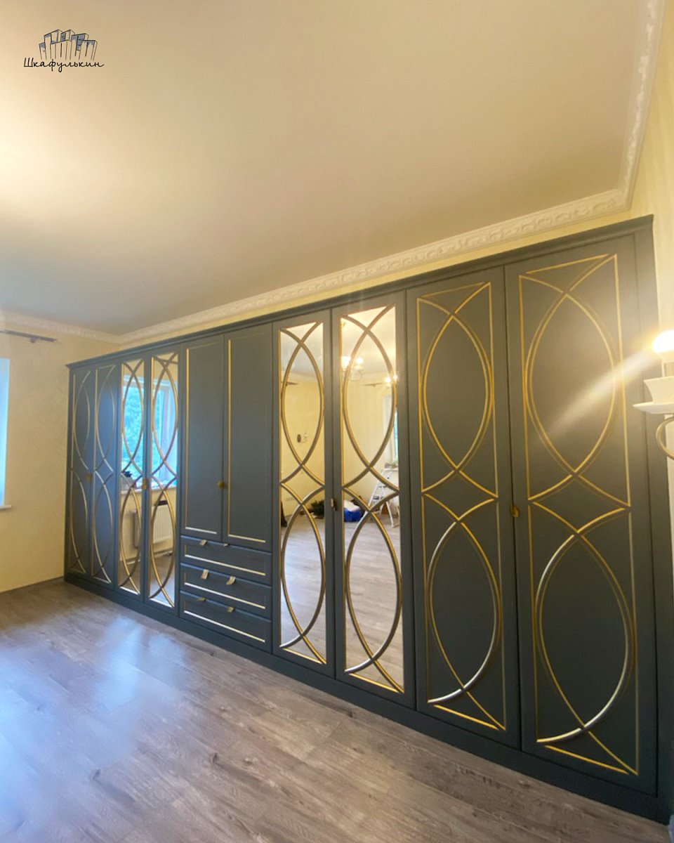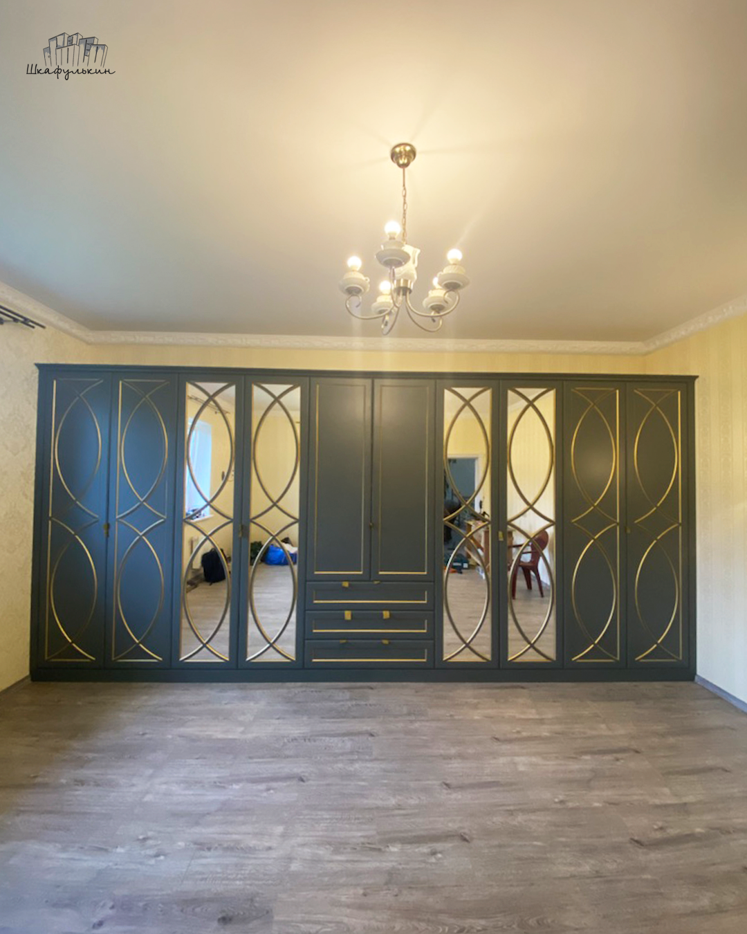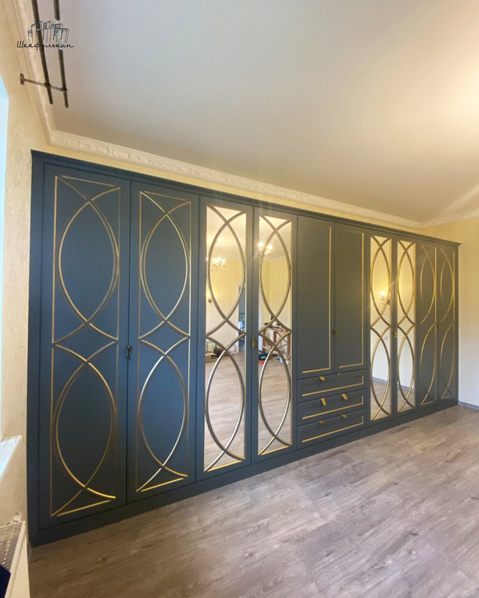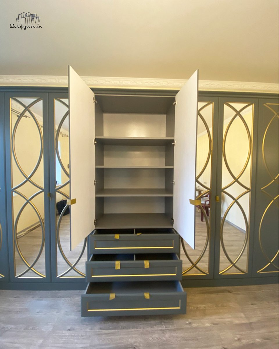 Фасады: МДФ 19 мм/NCS S 6502 G с патиной и зеркалом серебро.