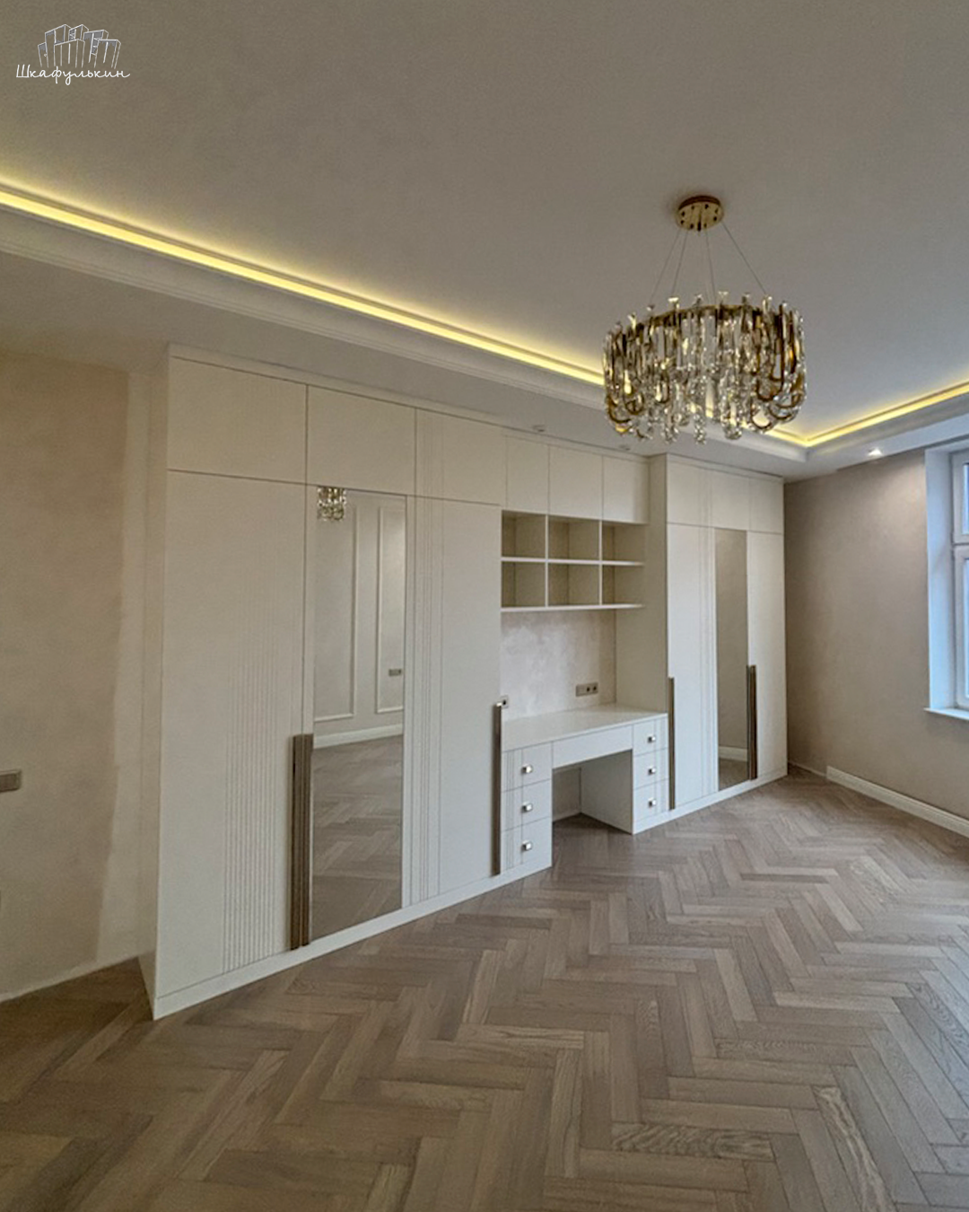 Фасады: МДФ 19 мм/RAL 9010 с вклеенным зеркалом.