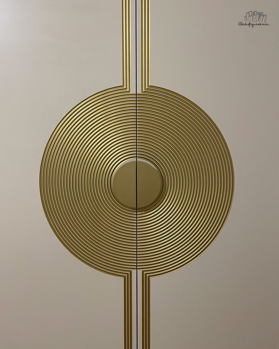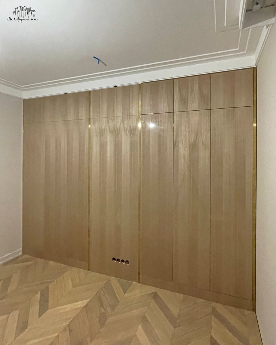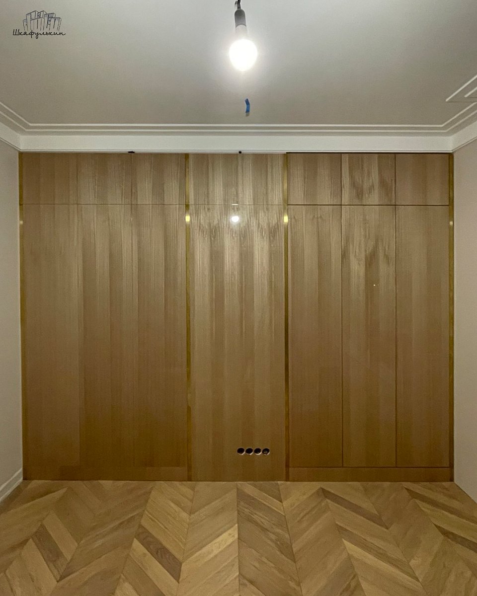 Стеновая панель: МДФ 17 мм Шпон эвкалипт глянец, вставка латунь.