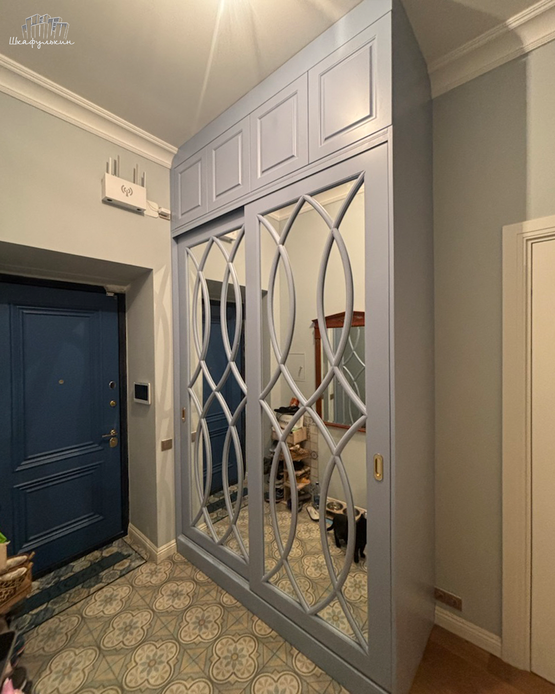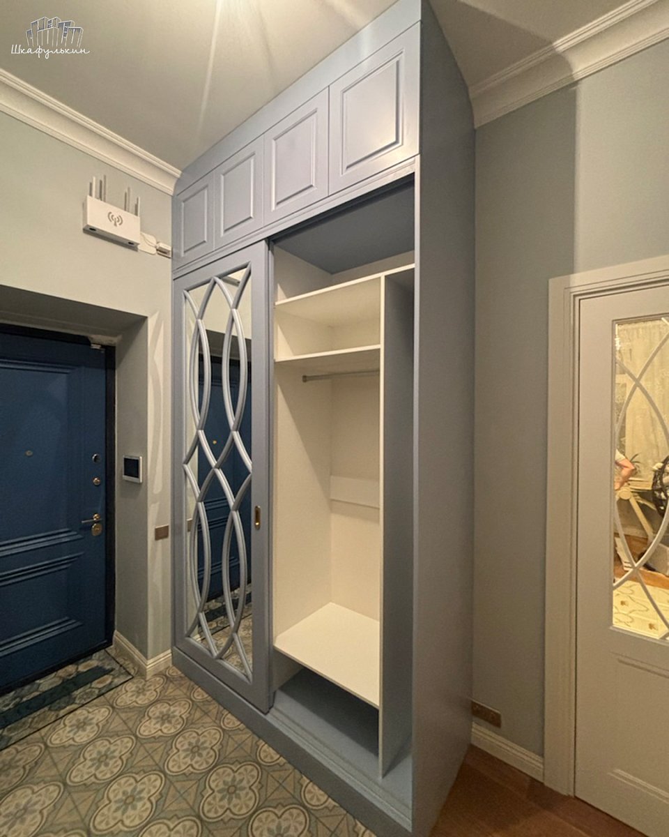 Двери-купе: МДФ 25 мм/NCS S 2020 R90B с зеркальной вставкой.