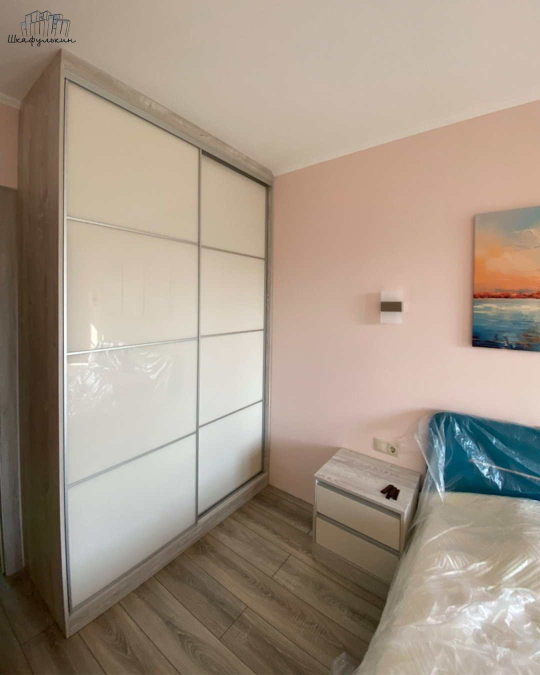 Двери-купе: алюминиевый профиль, декор серебро, вставка стекло/RAL 9001.