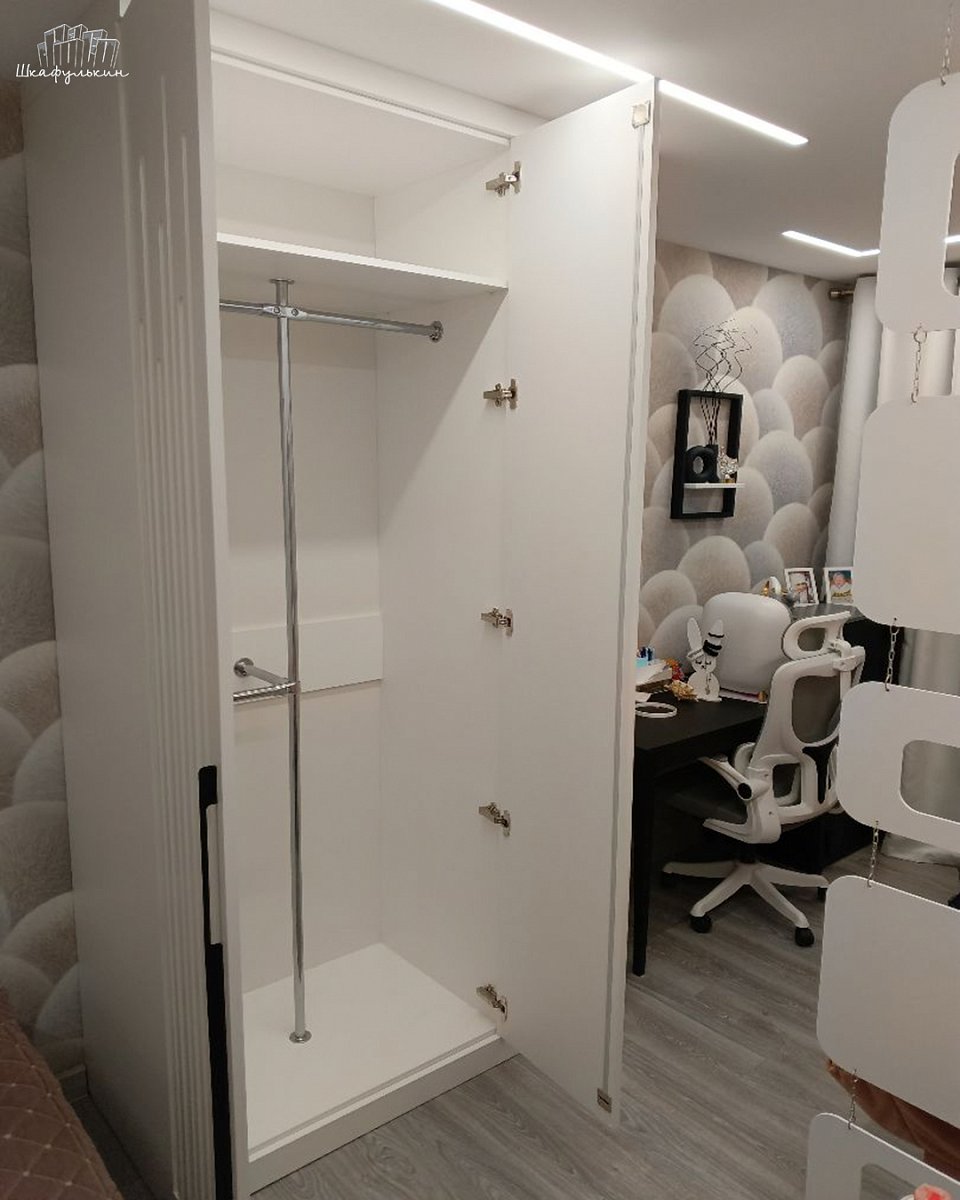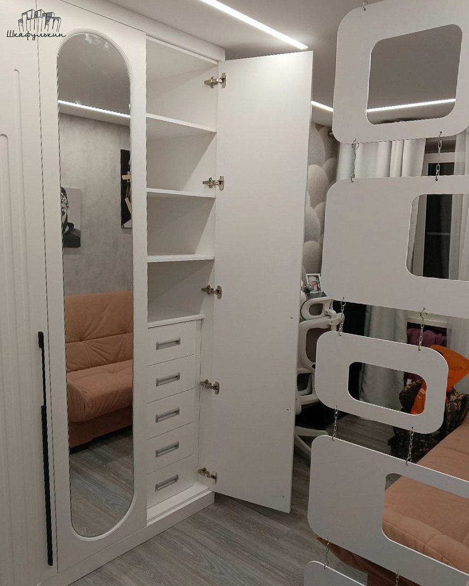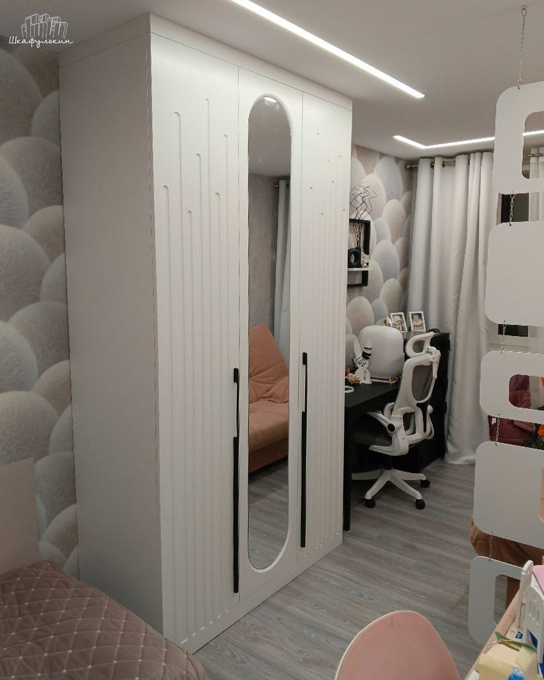 Фасады: МДФ 19 мм/RAL 9016 с зеркальной вставкой.