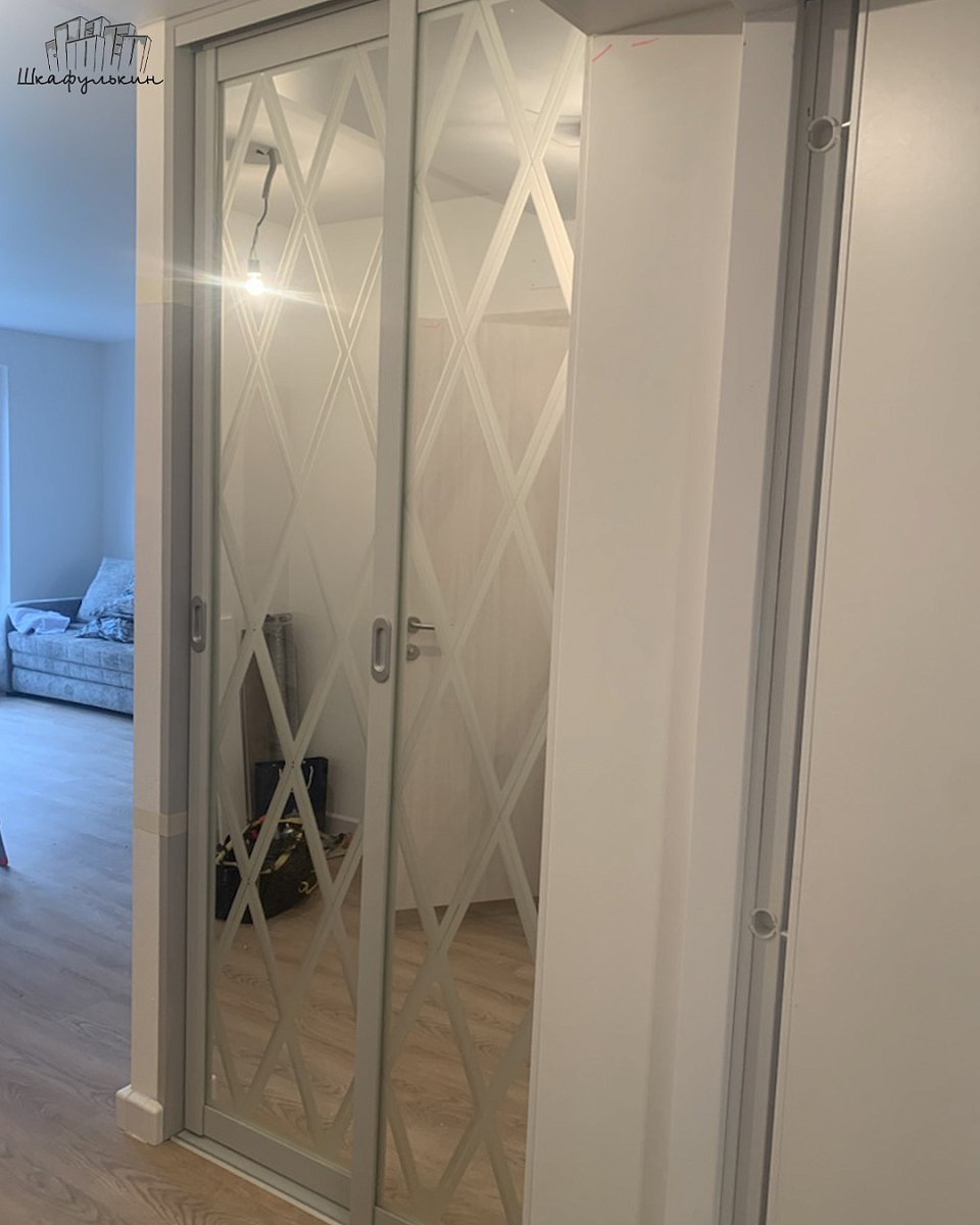 Двери-купе: HOLZ, вставка зеркало серебро, пескоструй.