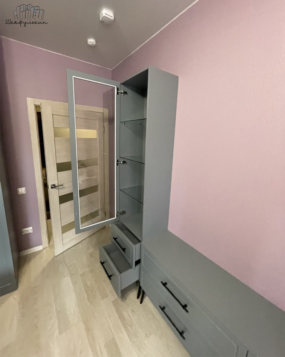 Фасады: МДФ 19 мм/NCS S 5005 B20G + стекло.