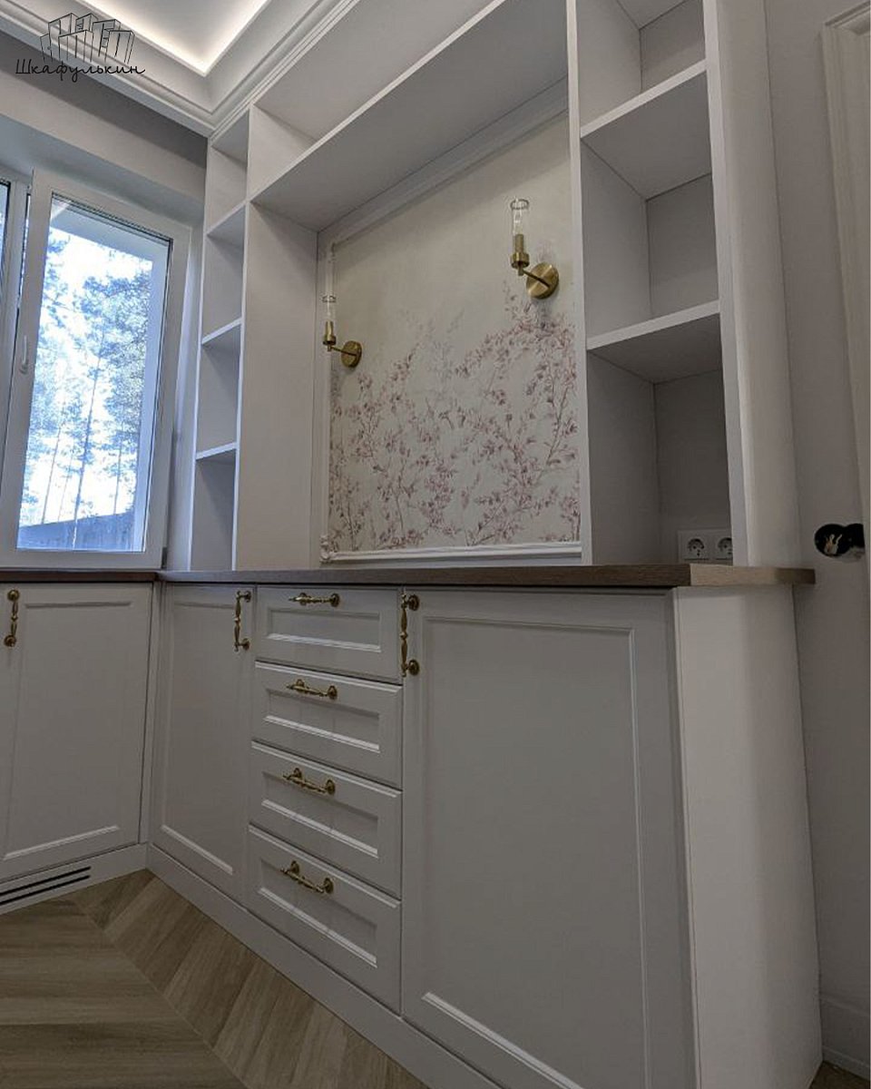 Фасады: МДФ 19 мм/RAL 9003 + вставка стекло.
