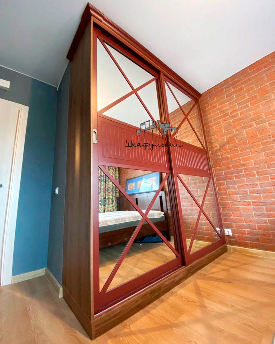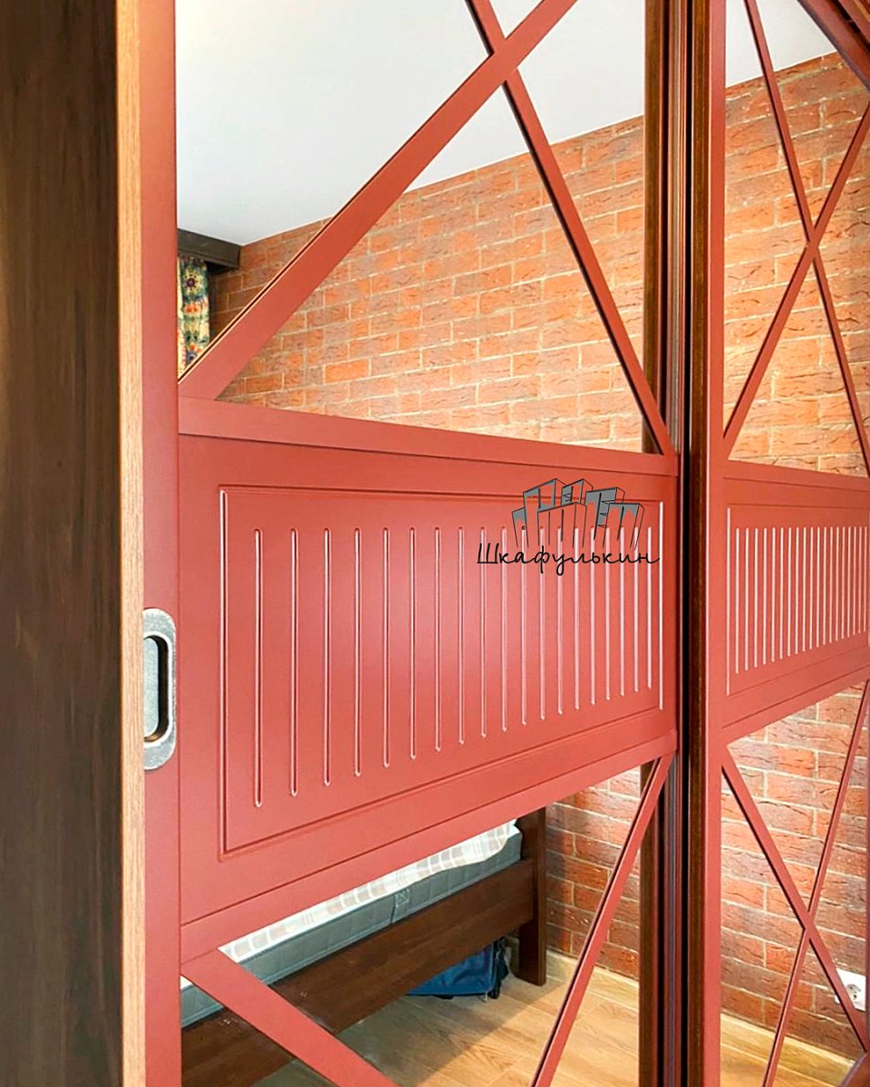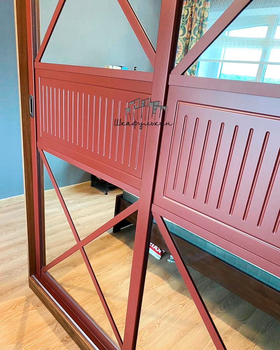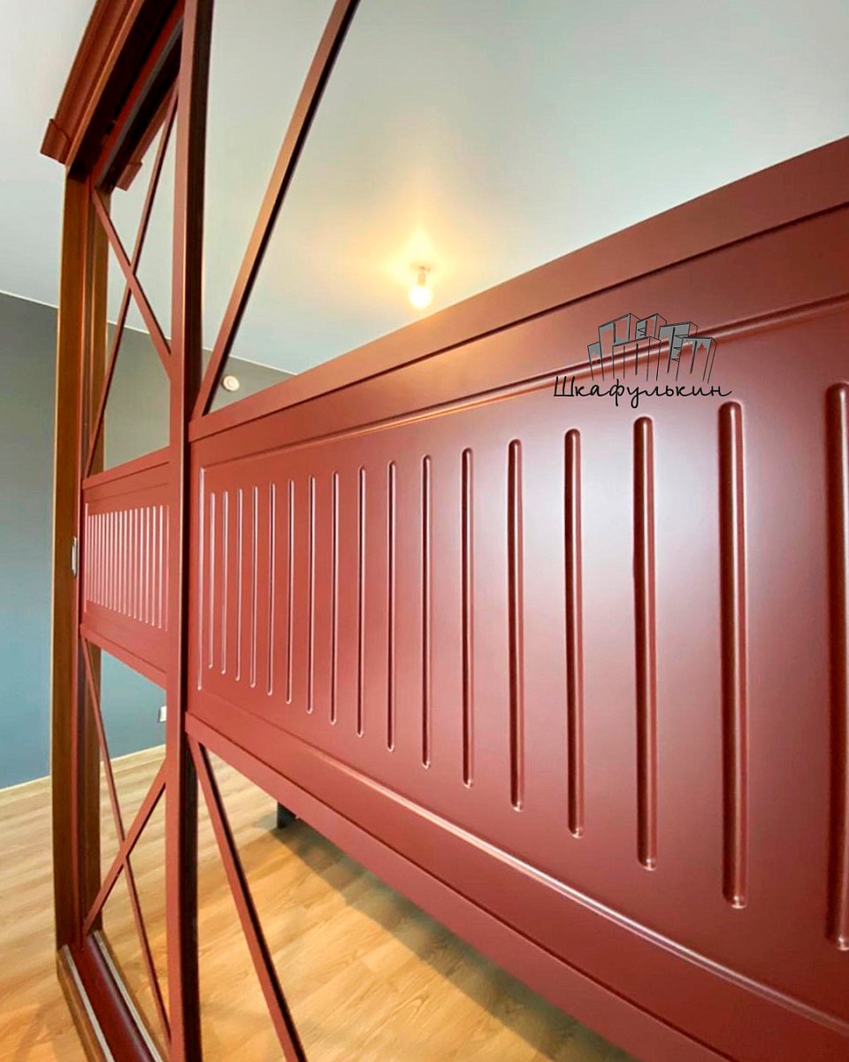 Наполнение дверей купе: Зеркало серебро, МДФ с фрезеровкой цвет - RAL 8015 матовый, делители;