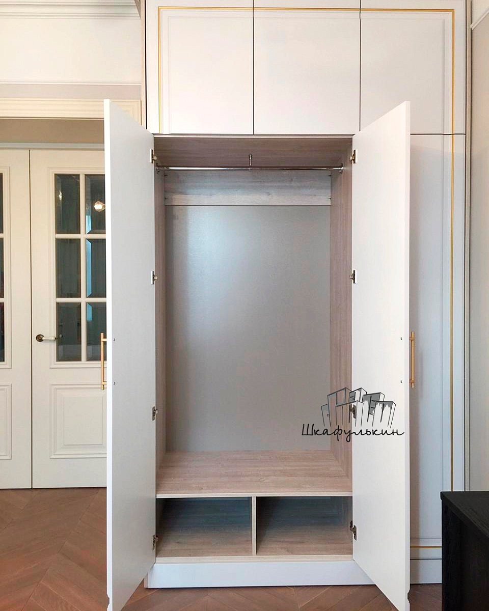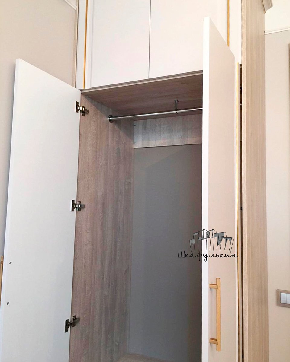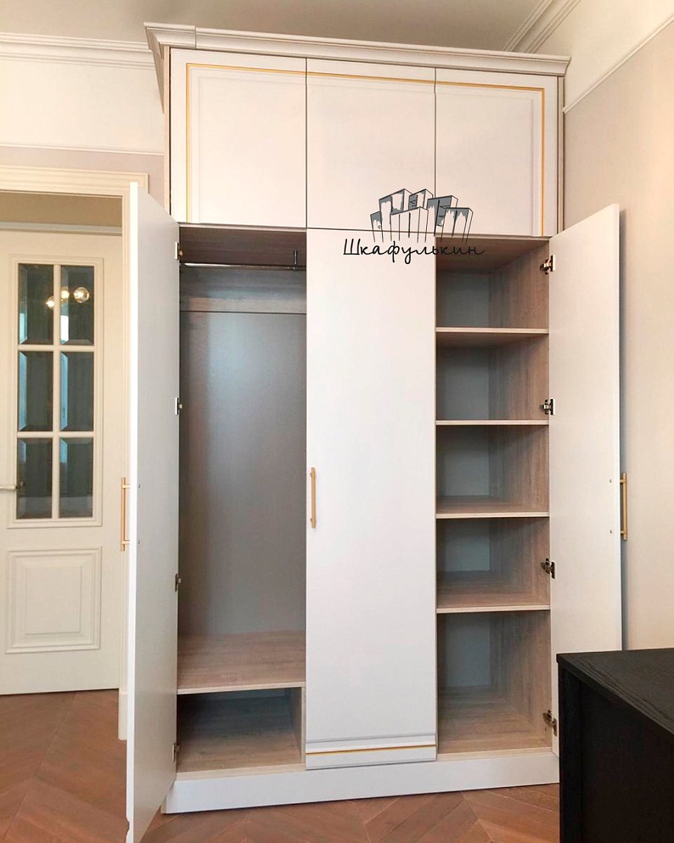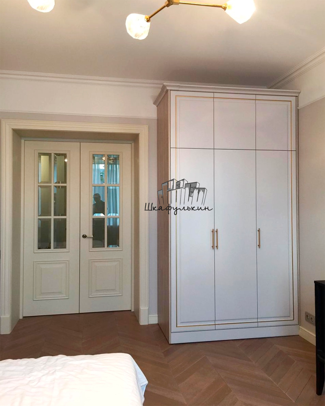 4 фасада распашных: МДФ 19мм; фрезеровка и патина - как в гарнитуре "Бонжур" (распашные шкафы, модель№61). Цвет - NCS S 1502-R матовый односторонний(внутренняя сторона-белый ламинат),патина - золото;