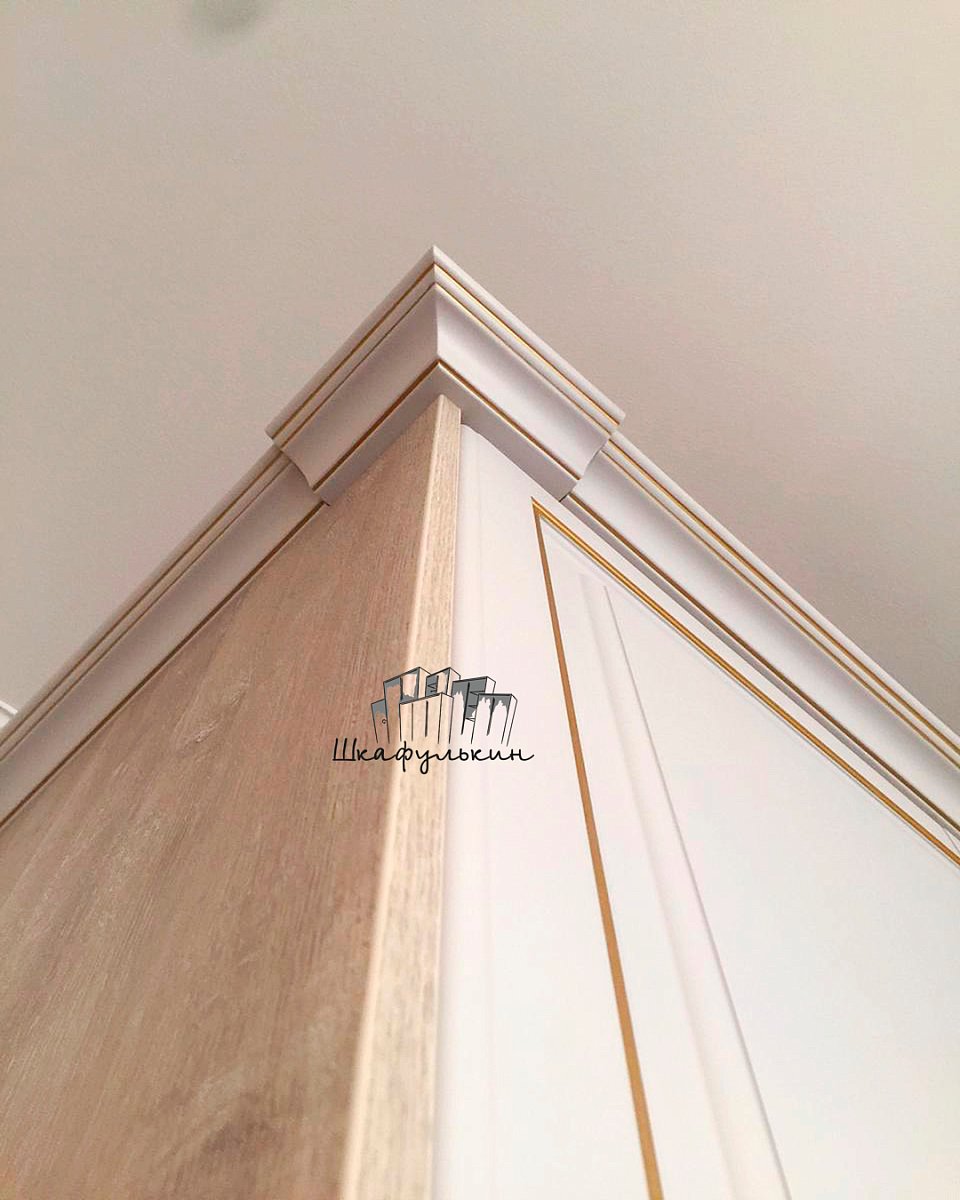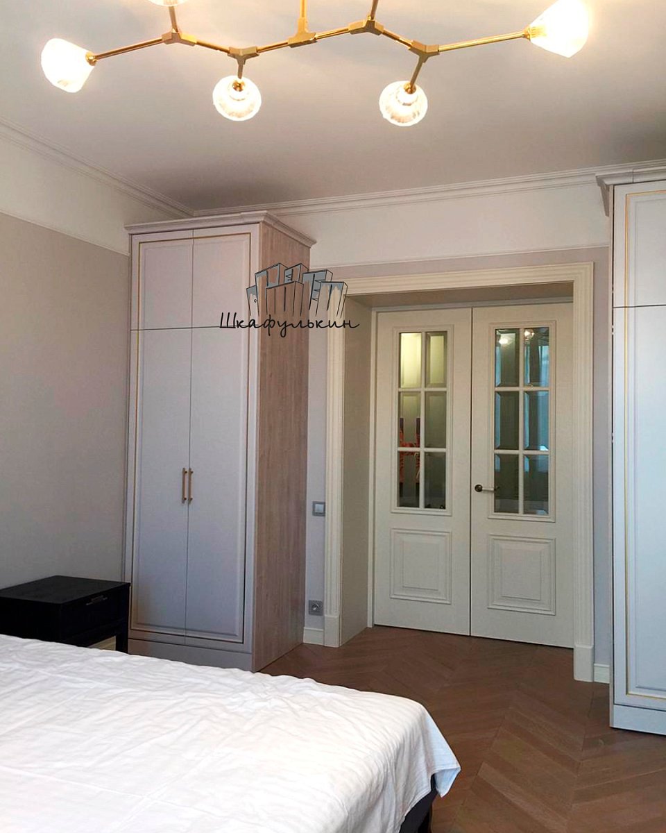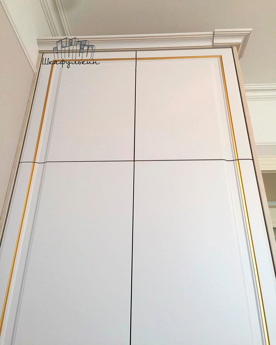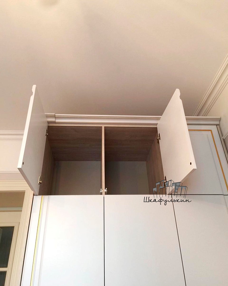 6 фасадов распашных: МДФ 19мм; фрезеровка и патина - как в гарнитуре "Бонжур" (распашные шкафы, модель№61). Цвет - NCS S 1502-R матовый односторонний(внутренняя сторона-белый ламинат), патина - золото;