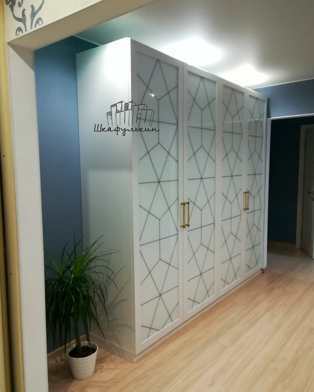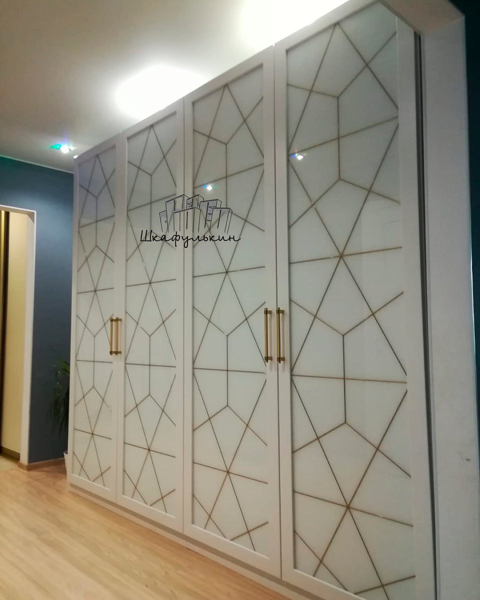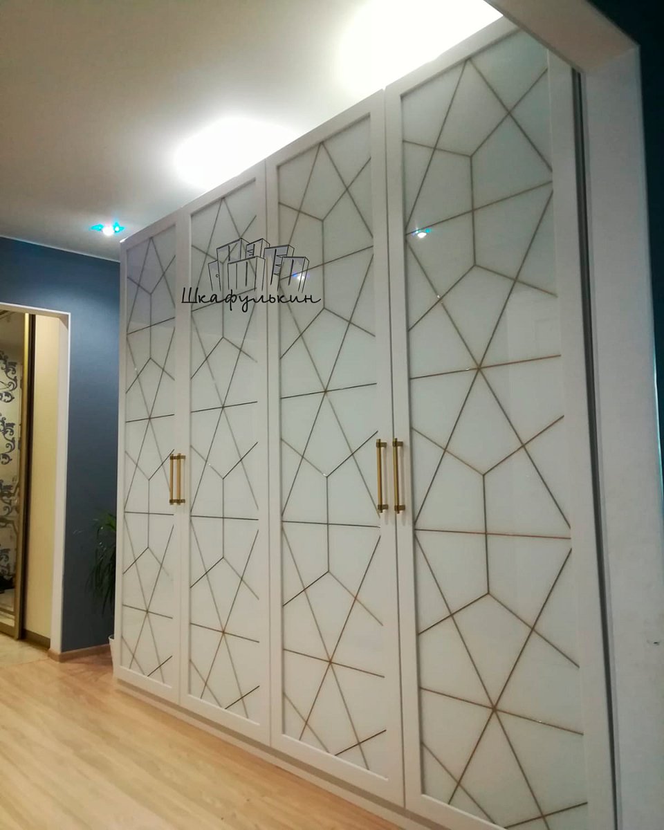 4 распашных фасада(модель Квадро): МДФ Italum плёнка А-1800 цвет-белый матовый; вставка - лакобель 9003 с витражным рисунком, рисунок золото(с внутренней стороны - белый ОРАКАЛ); Петли GTV с доводчиком 20шт;