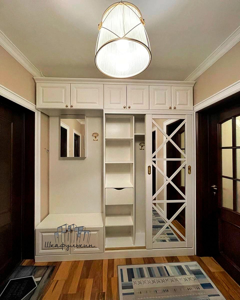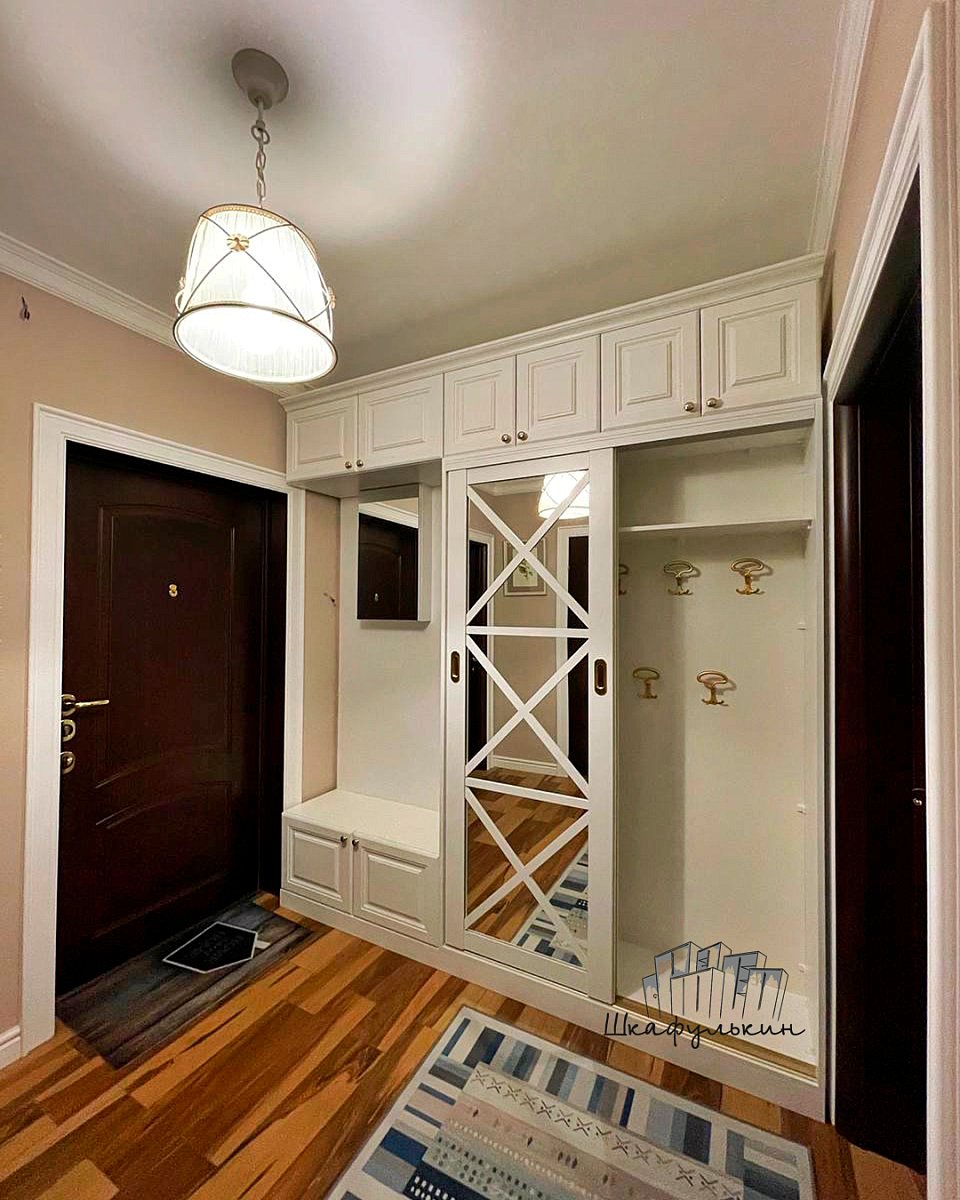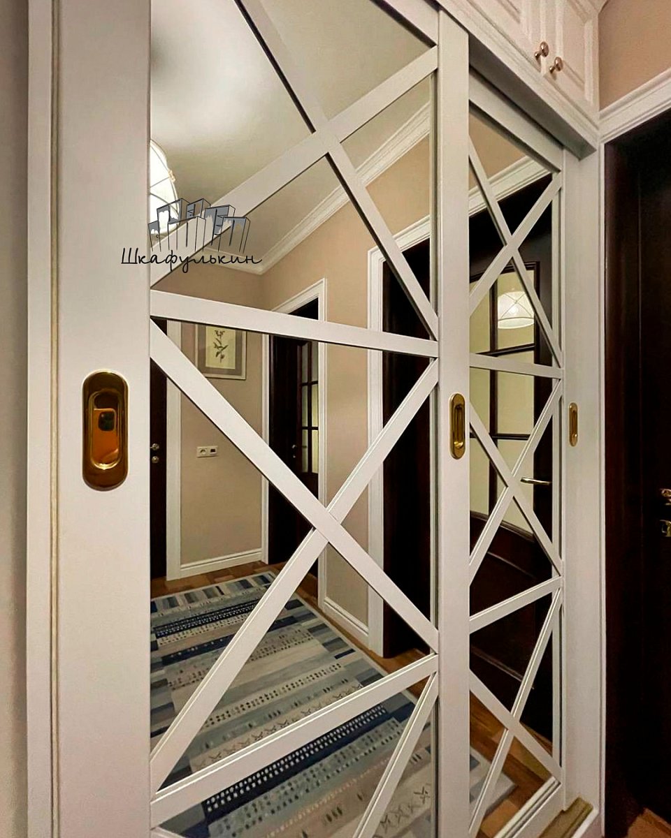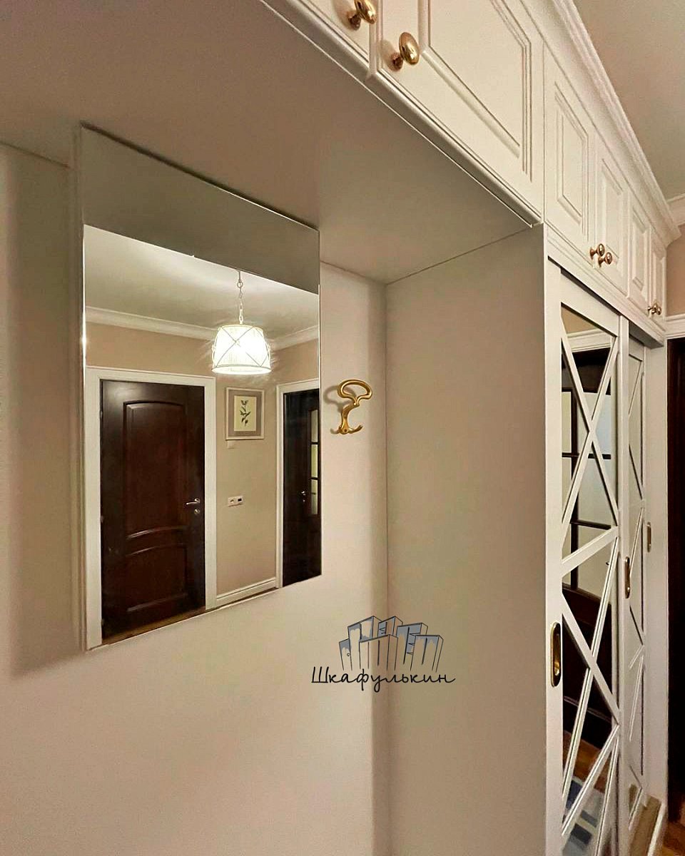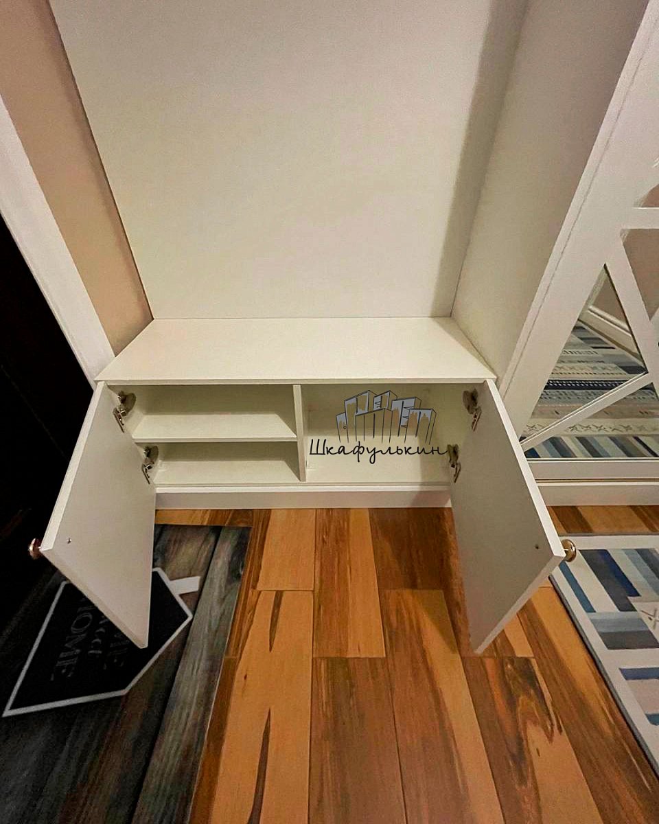 Фасады: 1) Двери-купе - 2 шт. Профиль HOLZ 80 мм. RAL 9003 матовый. Вставка зеркало серебро 4 мм;