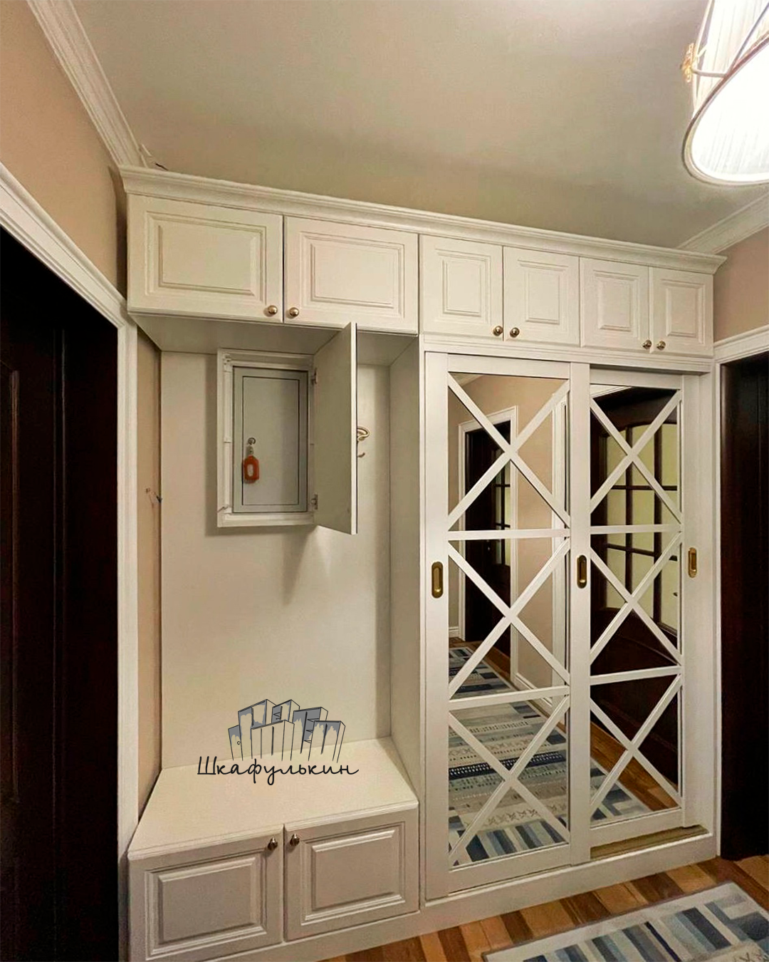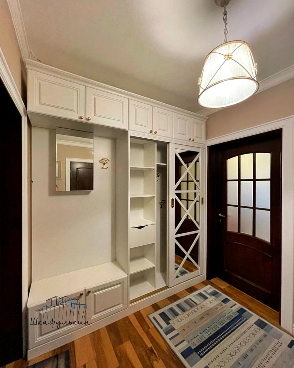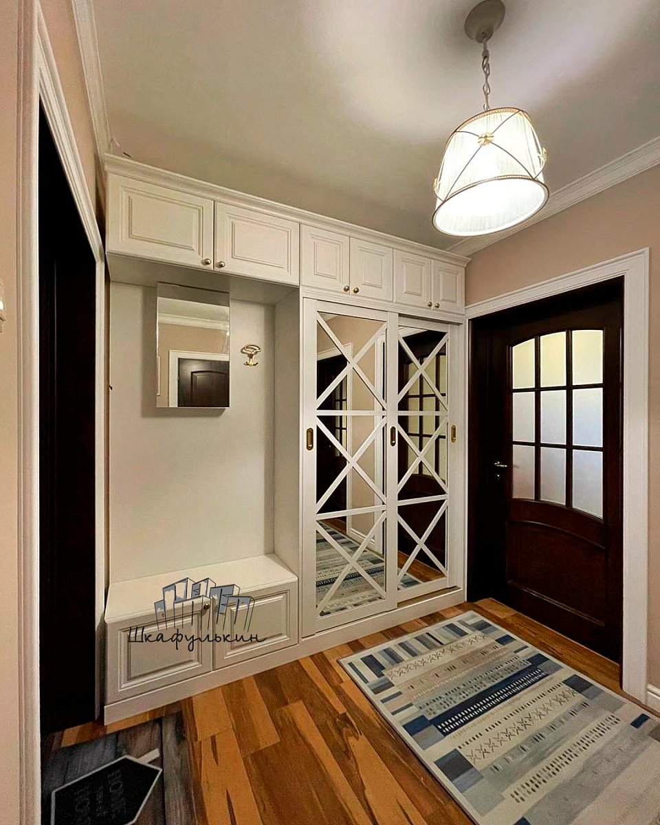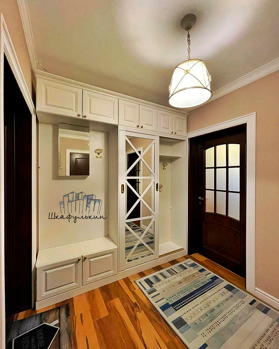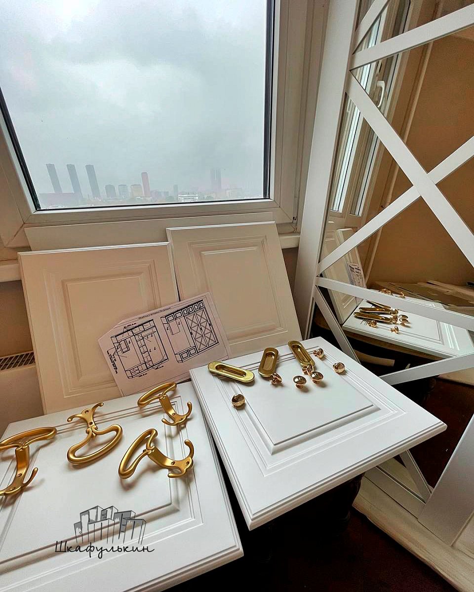 Фасады: 1) Двери-купе - 2 шт. Профиль HOLZ 80 мм. RAL 9003 матовый. Вставка зеркало серебро 4 мм;