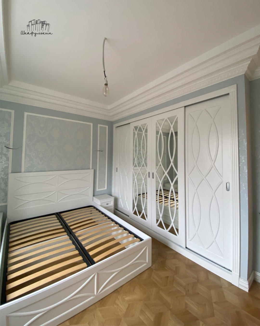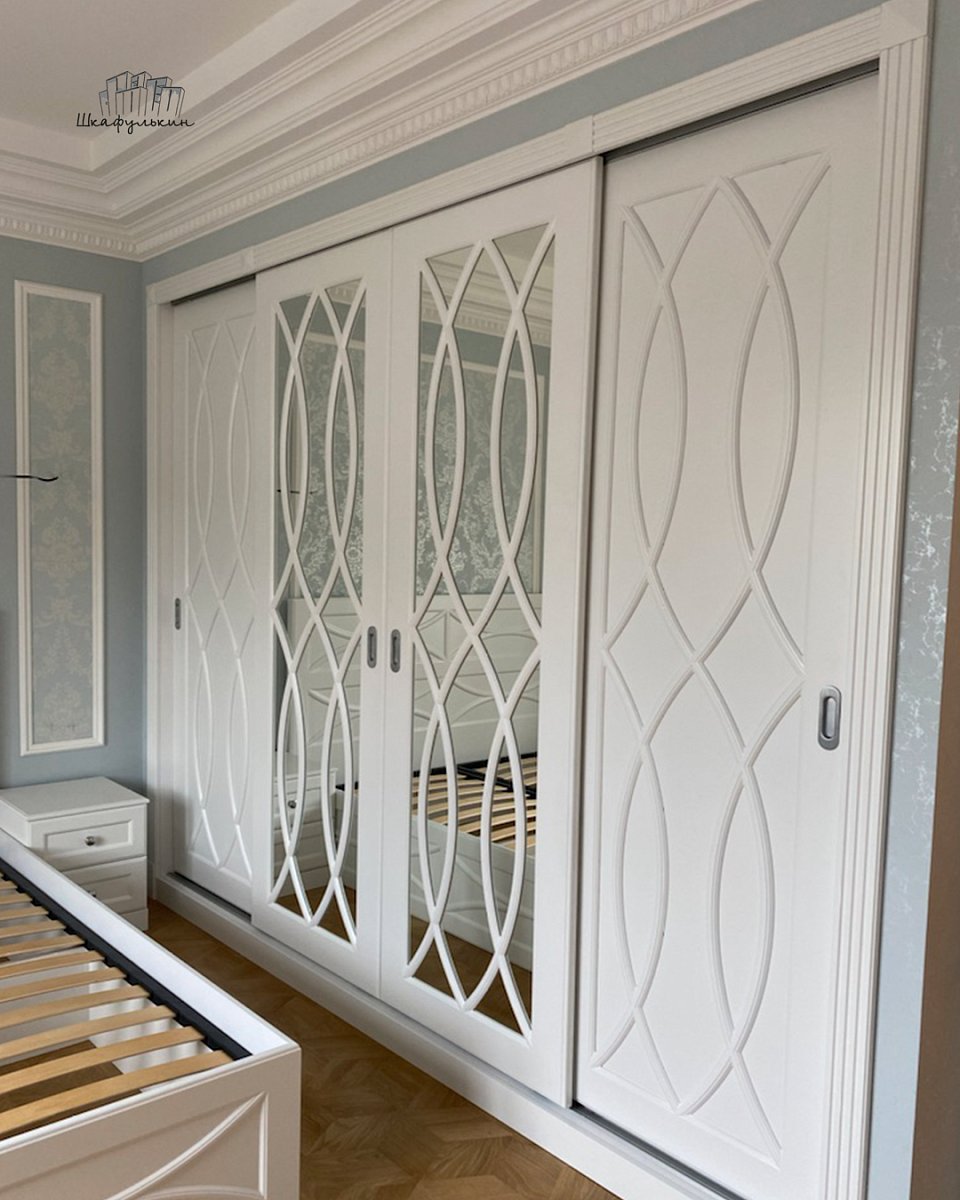 Двери-купе: 2 шт. / МДФ 25 витрина с раскладкой / покраска: RAL 9003 матовая / вставка : зеркало серебро / треки: RAL 9003 матовая.