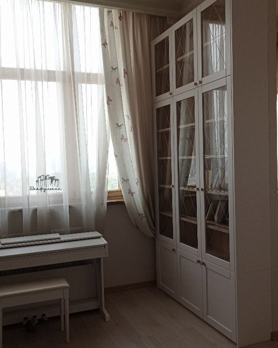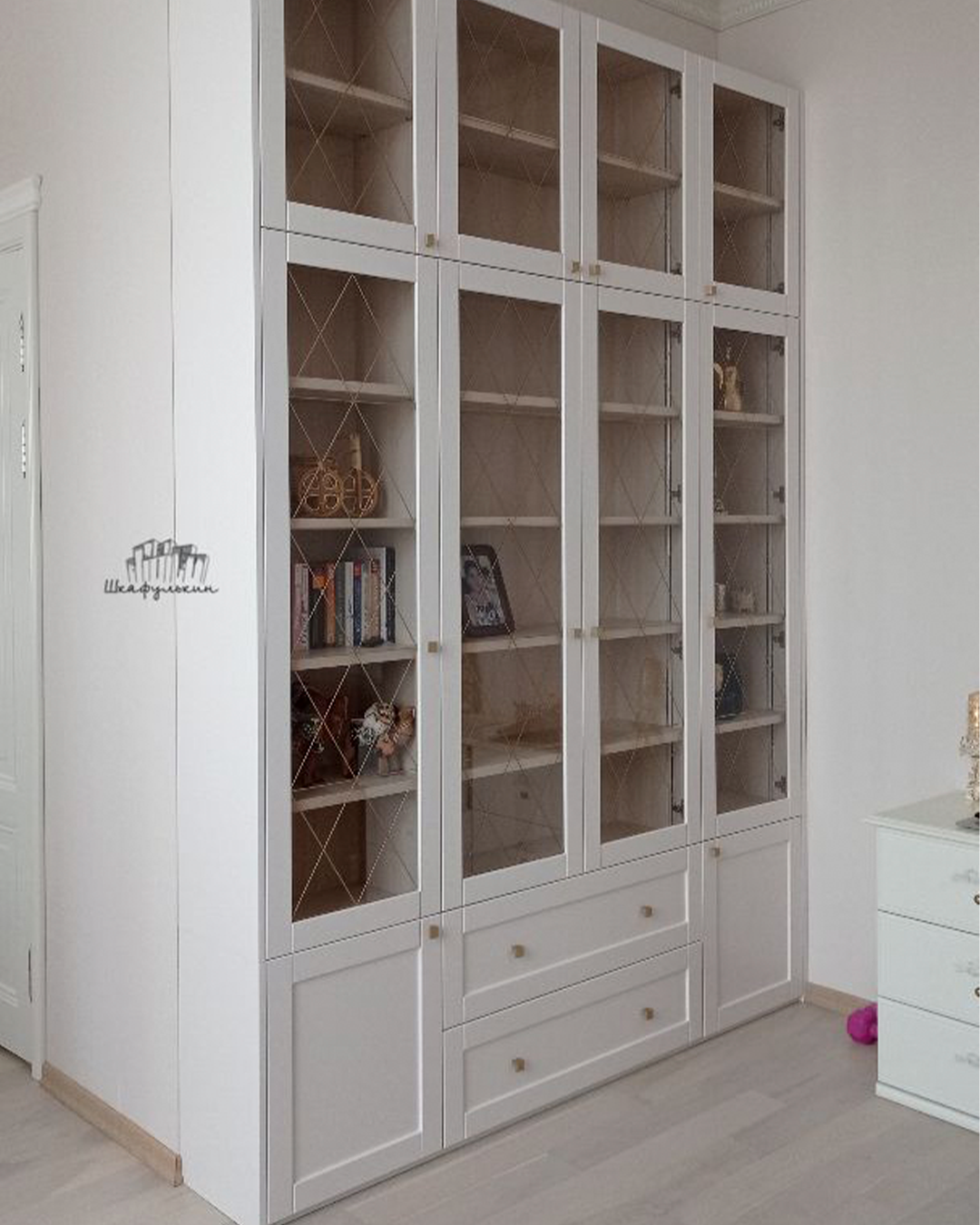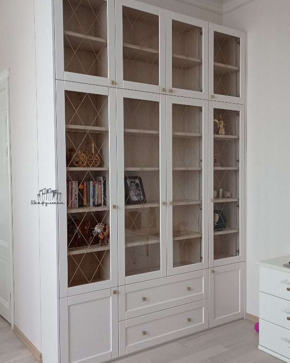 Фасад распашной: 14 шт./МДФ 19 мм / витрина / стекло с витражным контуром / покраска:NCS S 0502-R двухсторонняя матовая/ / вставка: стекло OPTIWHITE прозрачное / витражный контур цвет золото.