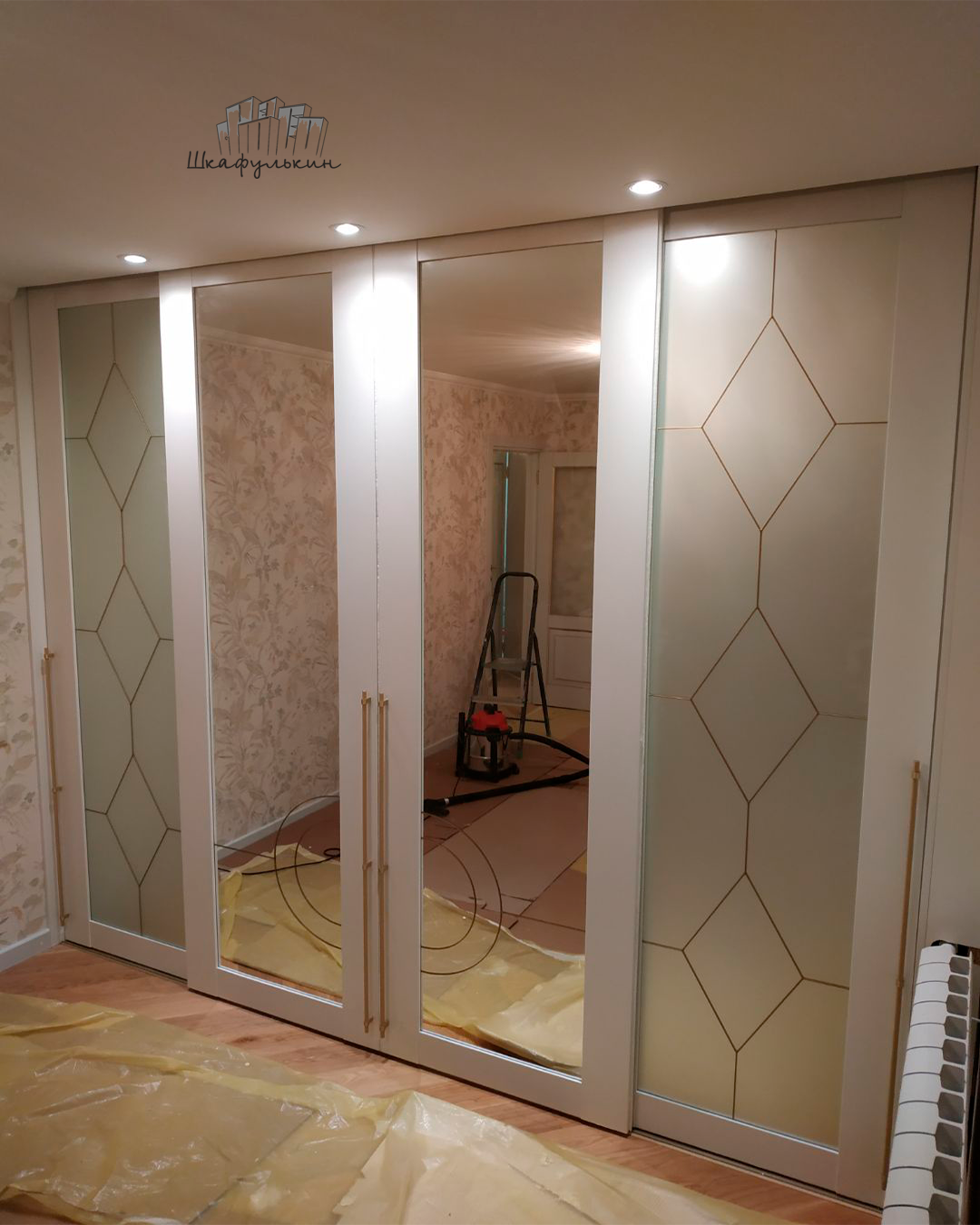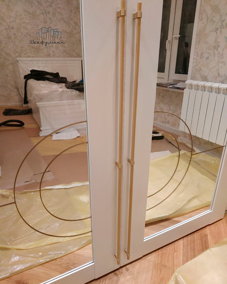 Двери-купе: 2шт. / МДФ 25 мм Lux / покраска: RAL 9016 матовая / вставка: зеркало серебро сатин / треки: RAL 9016 матовая / нижний трек: матовое золото / витражный контур/цвет золото.