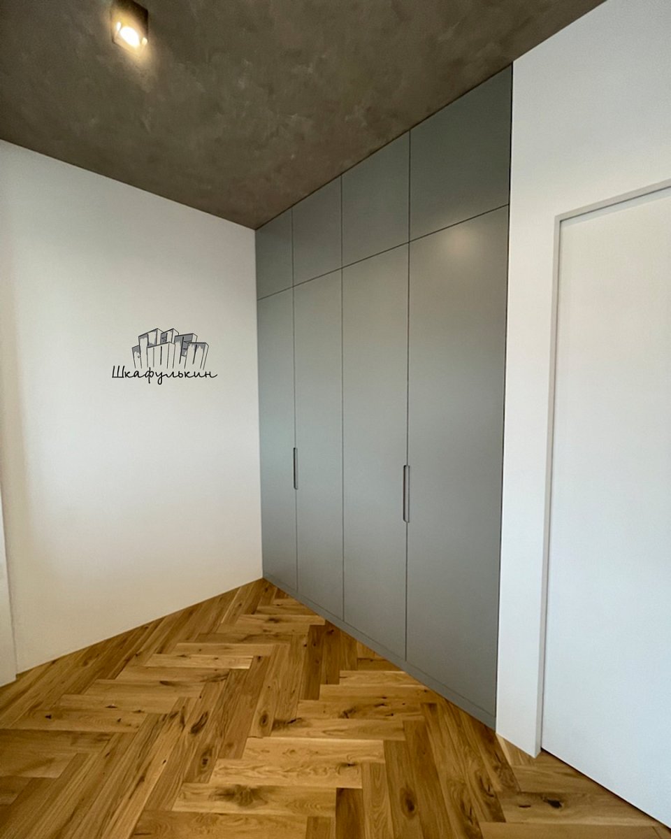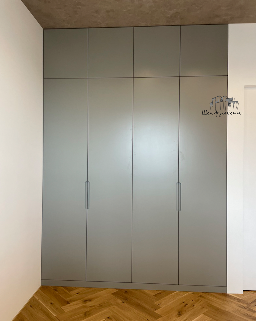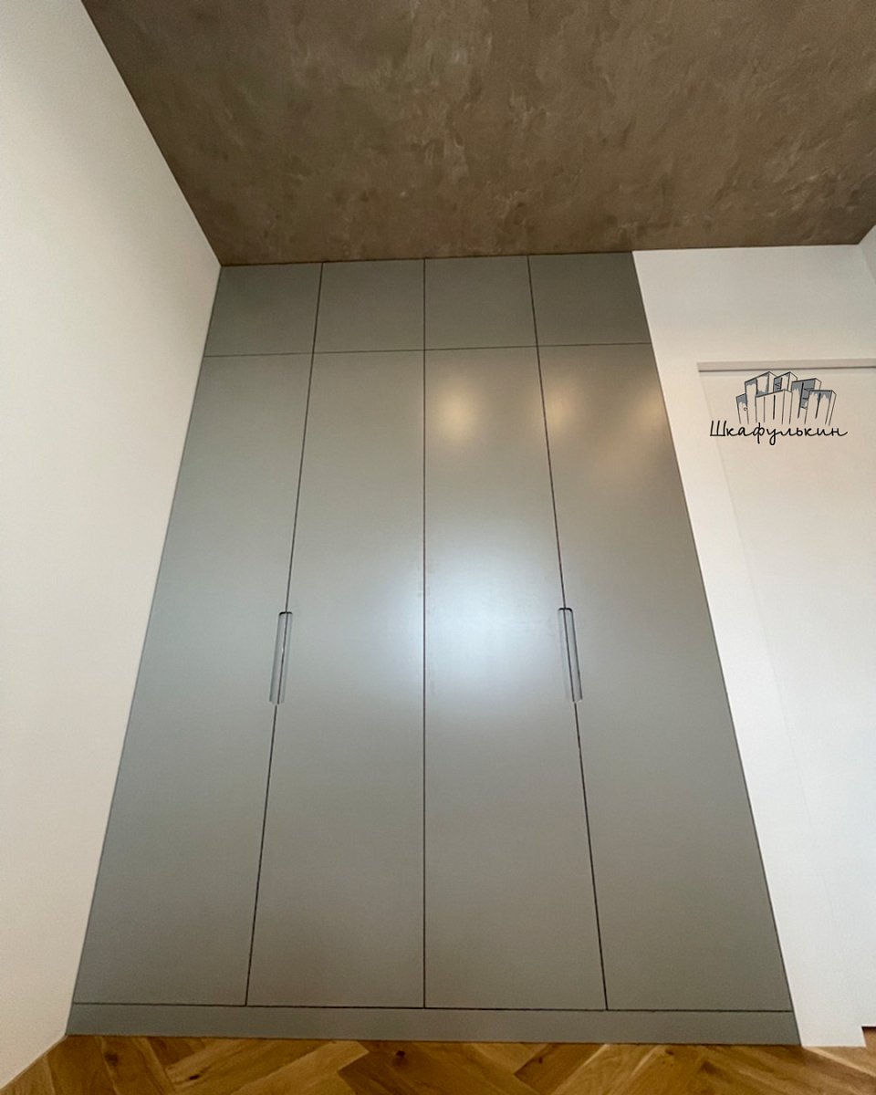 Фасад распашной: 4 шт. / МДФ 19мм / покраска: RAL 7030 / ручка интегрированная: RAL 7030.