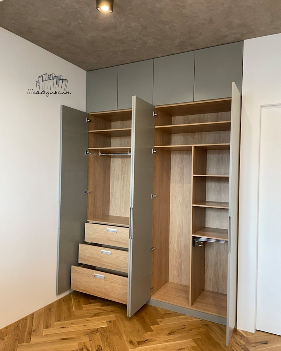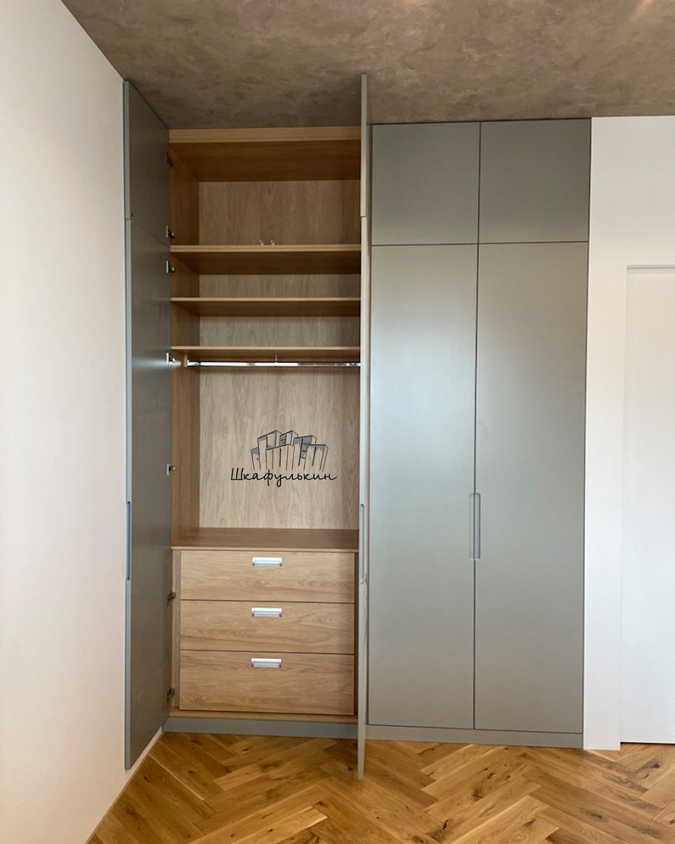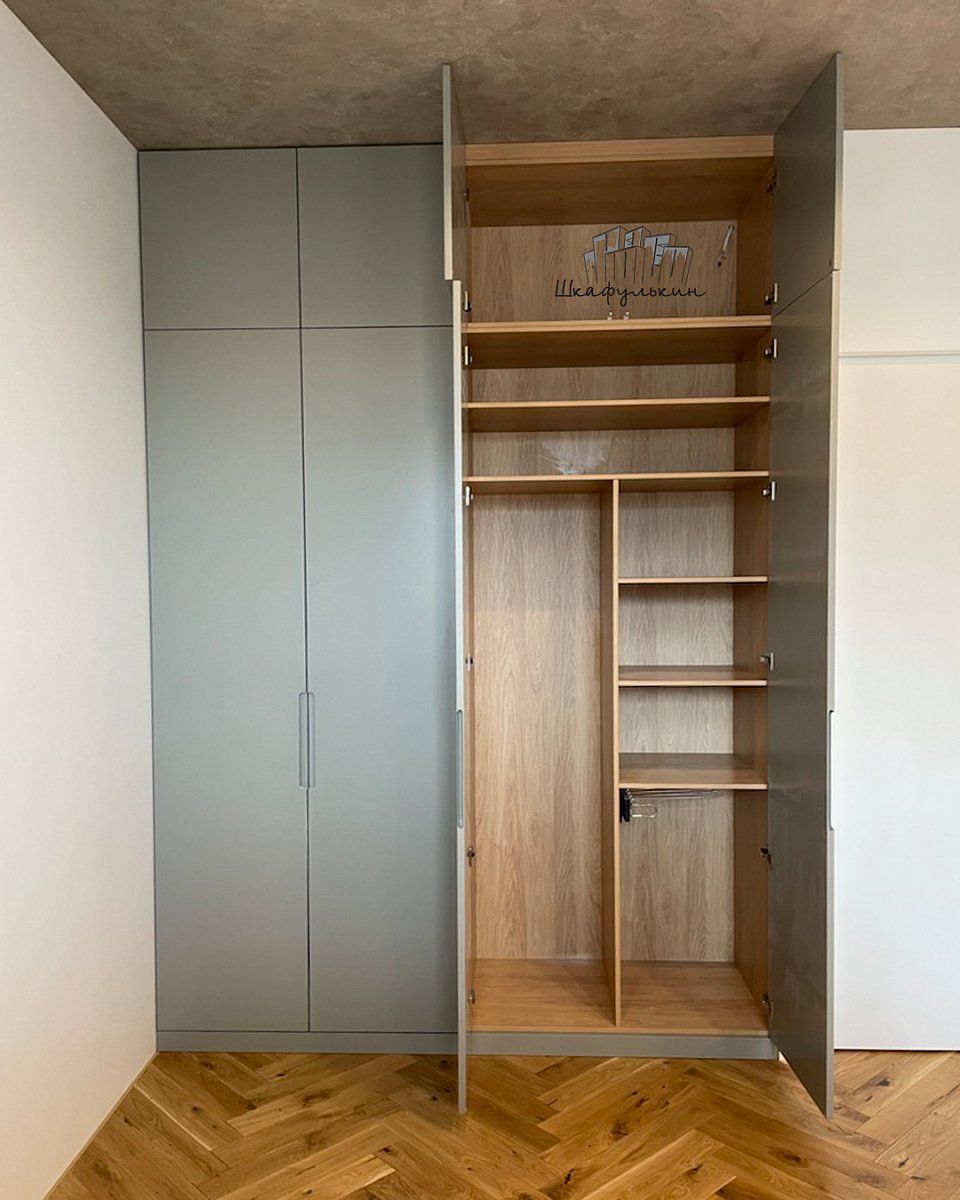 Фасад распашной: 4 шт. / МДФ 19мм / покраска: RAL 7030 / ручка интегрированная: RAL 7030.