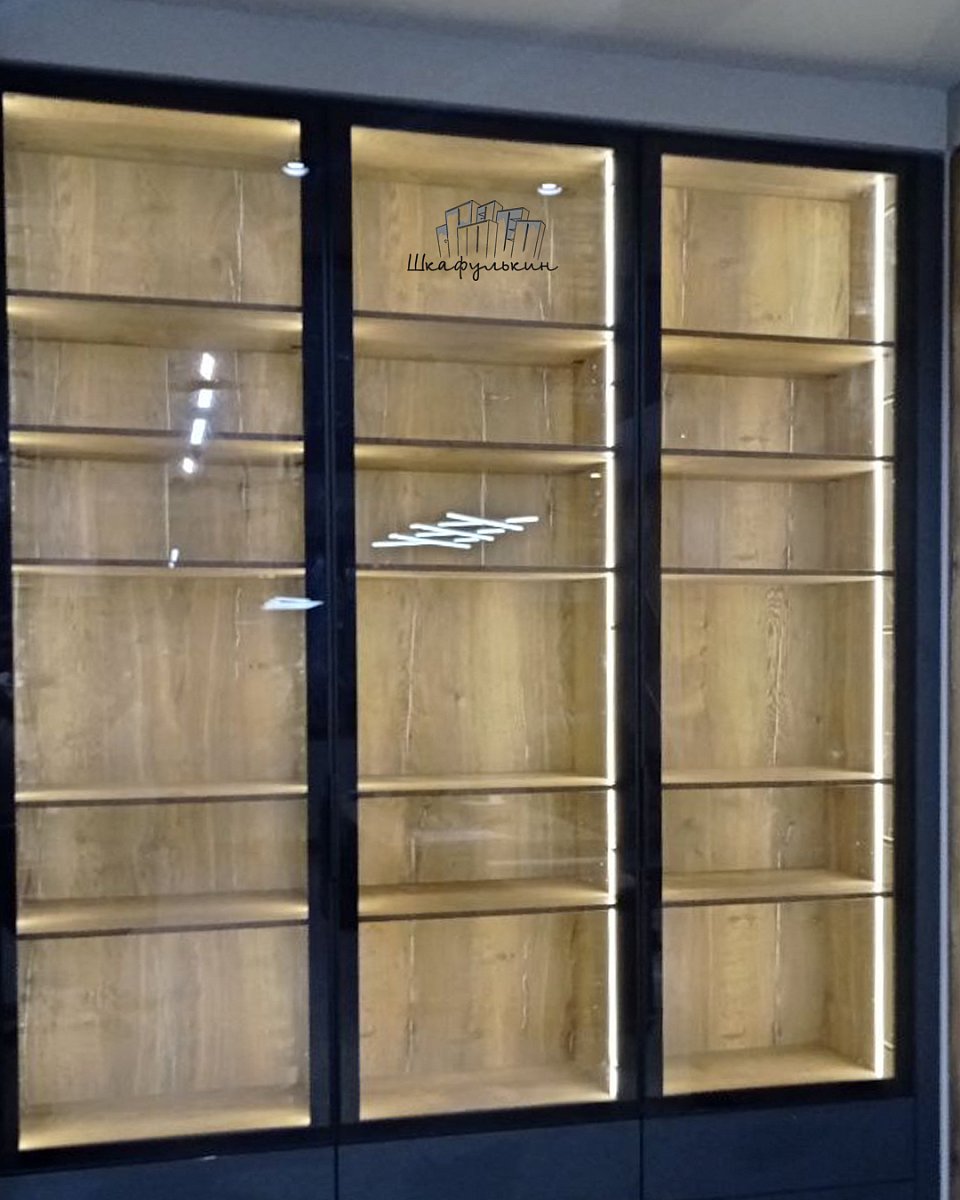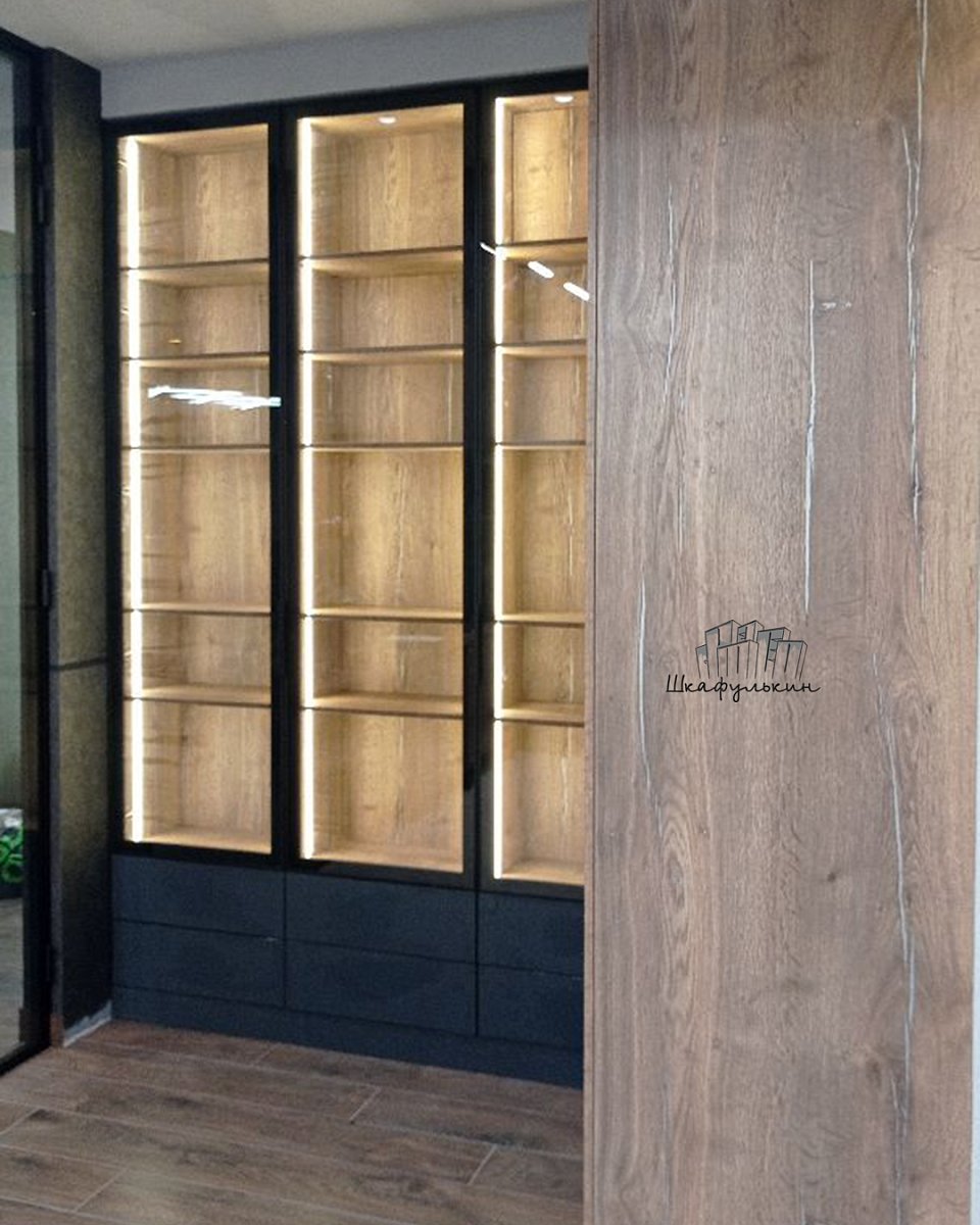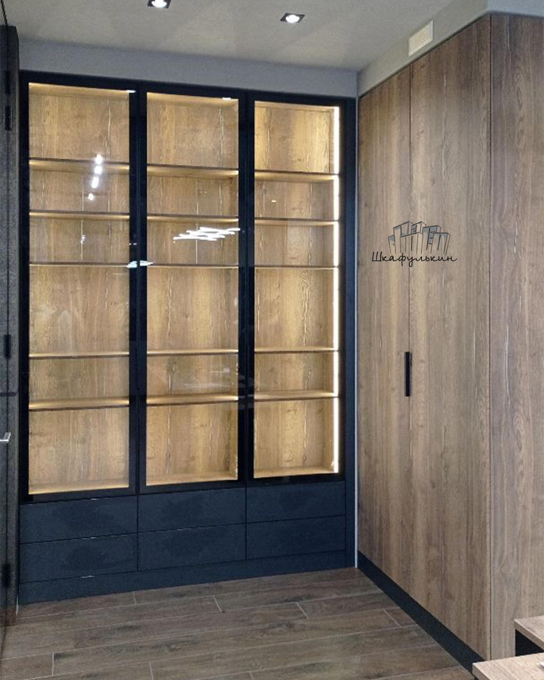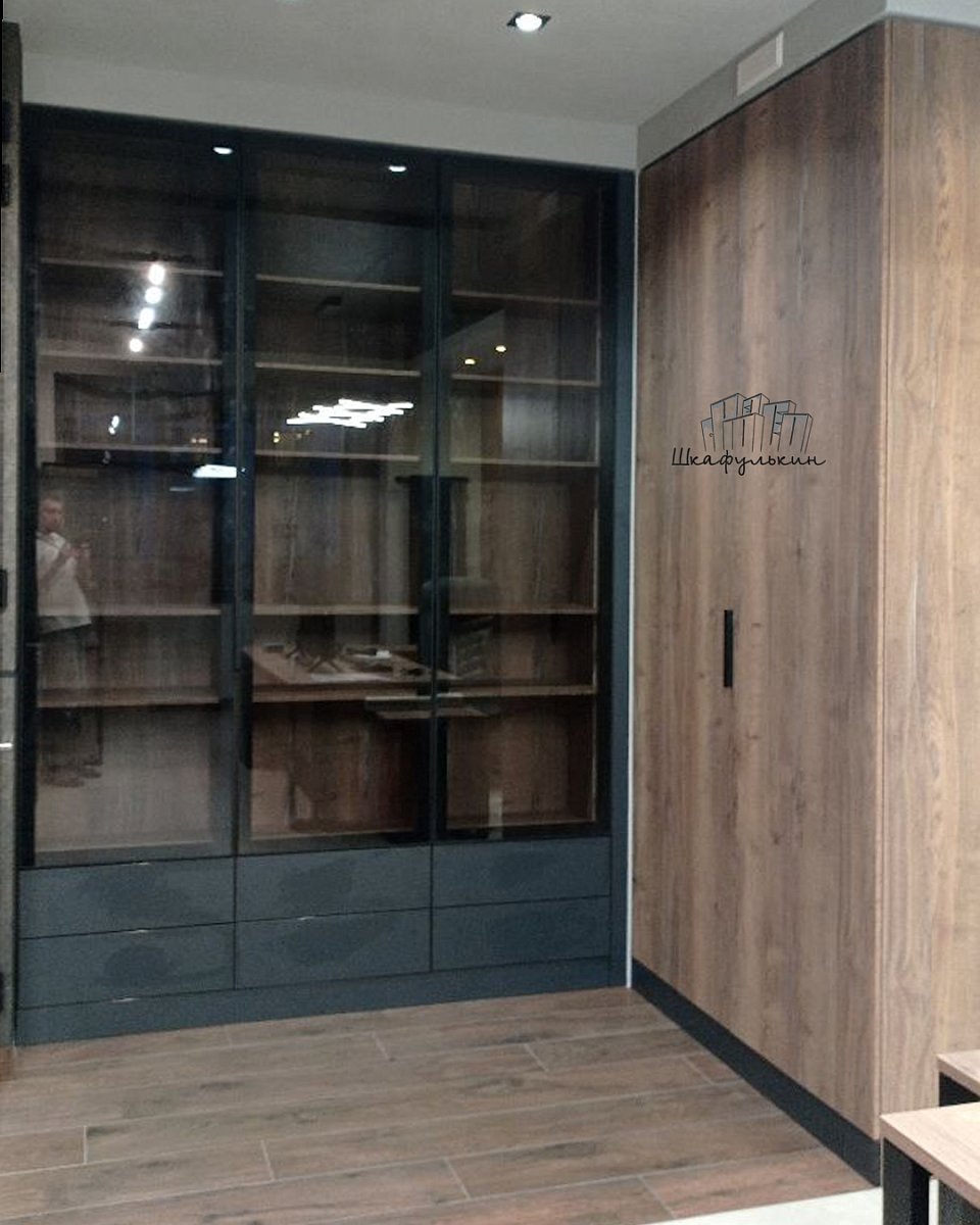 Фасад распашной: рамочный / AL профиль ФБМ 8 / декор: чёрный / вставка: стекло серое.