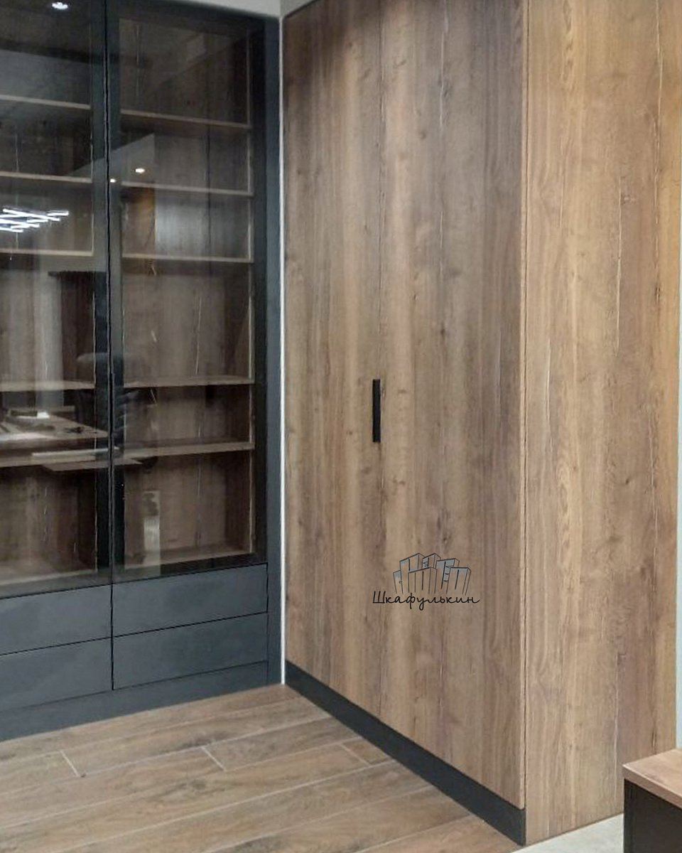 Двери-купе: MODUS MS 163, декор: Черный браш A25 / вставка: ЛДСП H3176 08 мм Дуб Галифакс олово ST37 треки: Черный браш A25 / нижний трек: Черный браш A25.