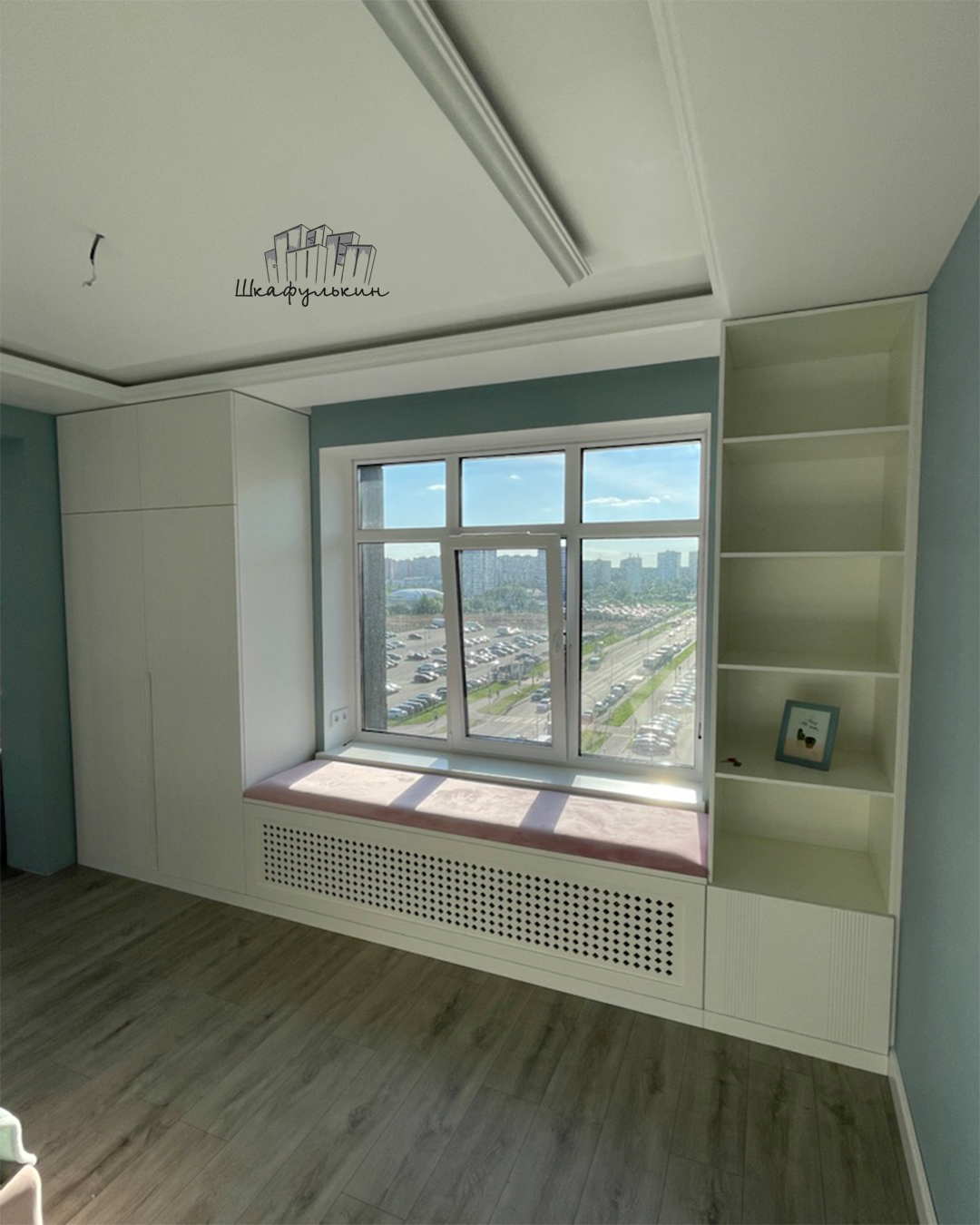 Фасад "фальш-фасад": 1 шт. / МДФ 19мм / витрина / покраска: RAL 9016 односторонняя матовая / вставка: МДФ 8 мм сквозная фрезеровка / RAL 9016.