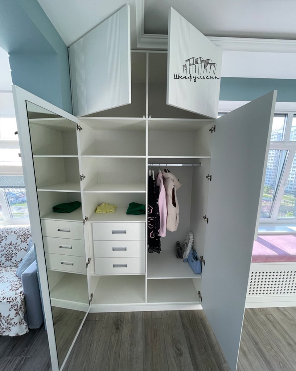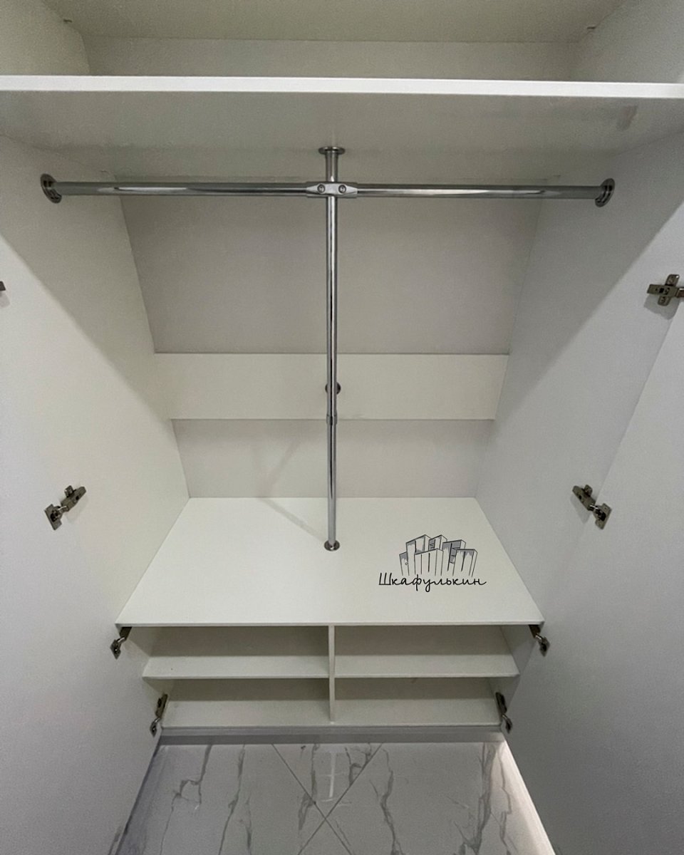 Фасад распашной: 2 шт. / МДФ 19мм / плоский / покраска: RAL 9016 односторонняя матовая /ручка интегрированная: в цвет фасада /зеркало серебро наклеенное на внутреннюю часть фасада.