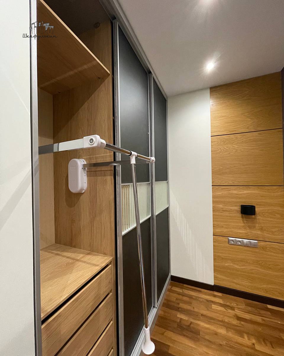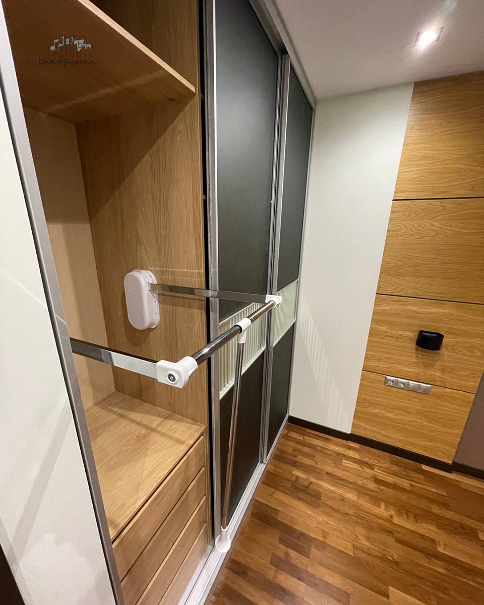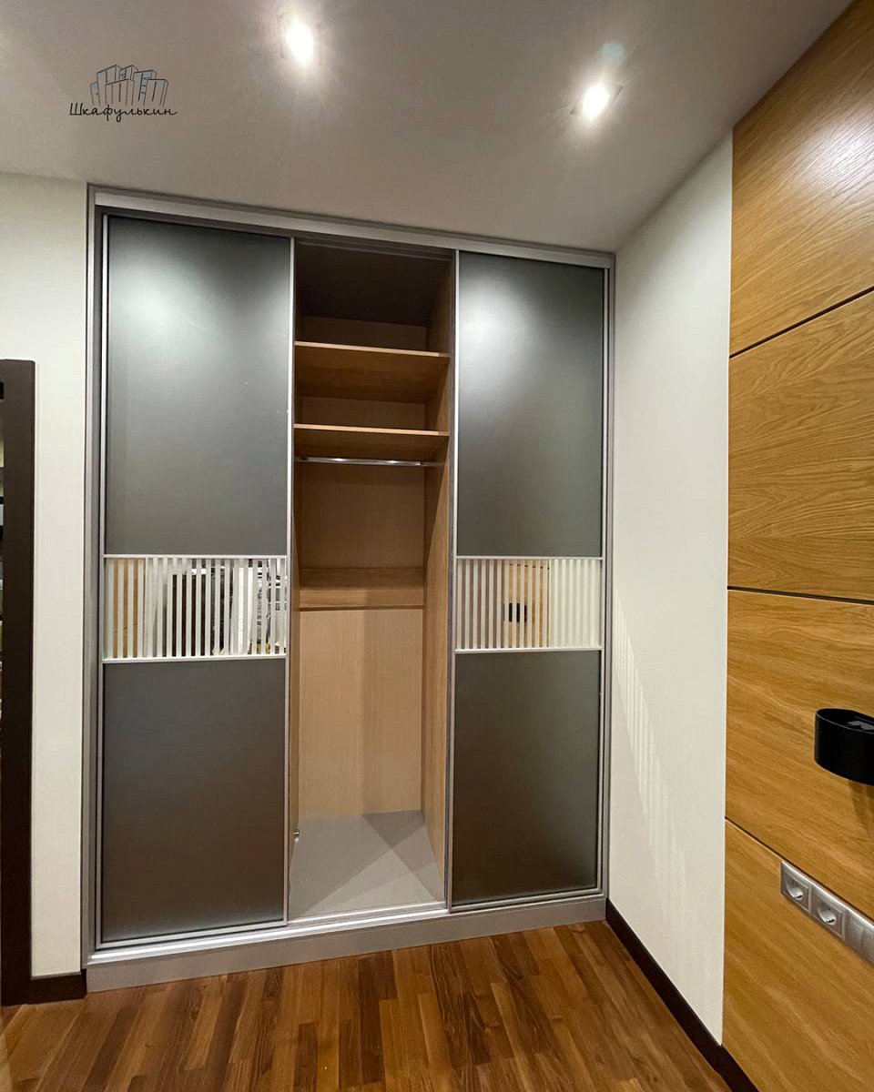 Двери-купе: 3 шт. / MODUS MS 163, декор: Серебро А00 / вставка 1: зеркало графит / вставка 2: зеркало серебро пескоструйный рисунок /вставка 3: зеркало графит / треки: Серебро А00 / нижний трек: Серебро А00.