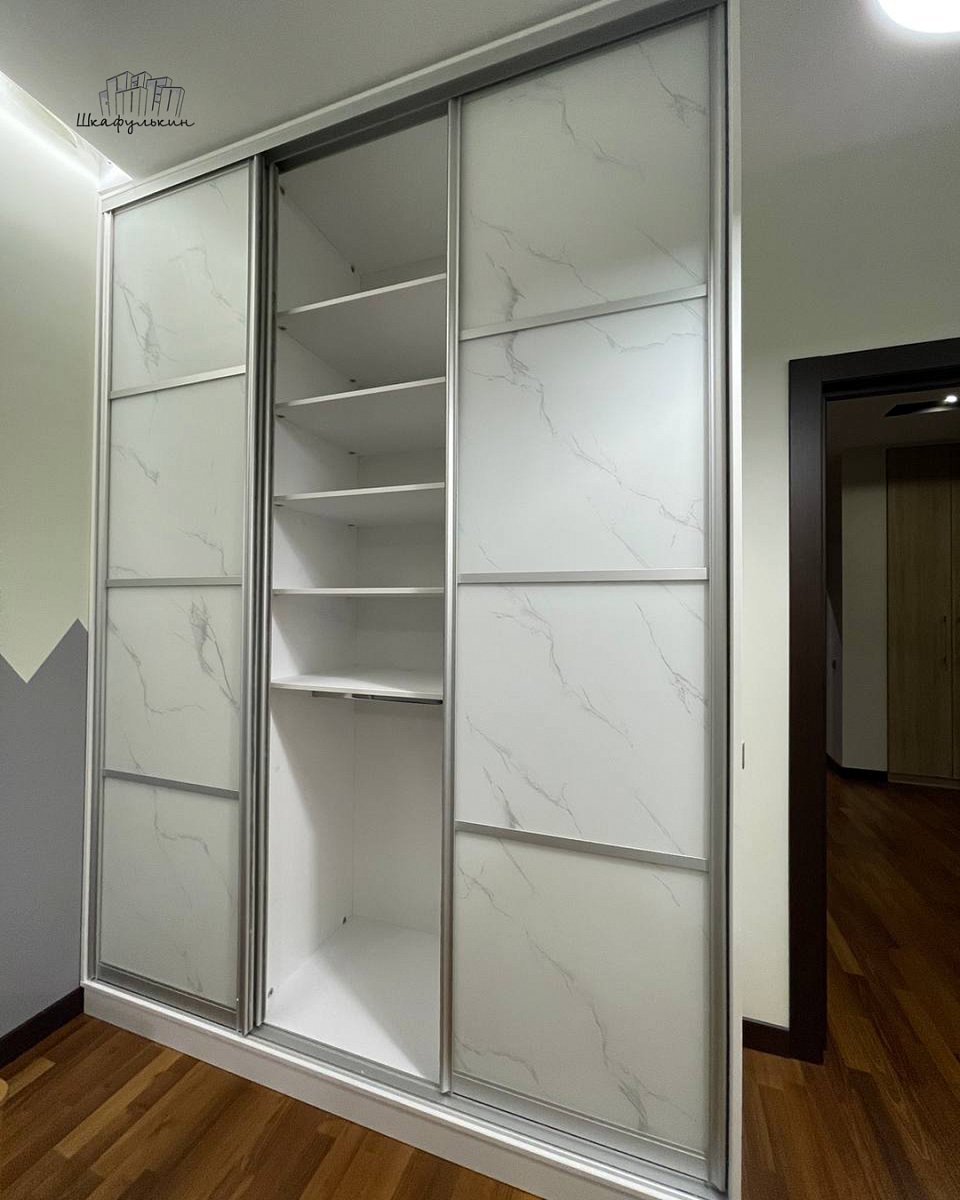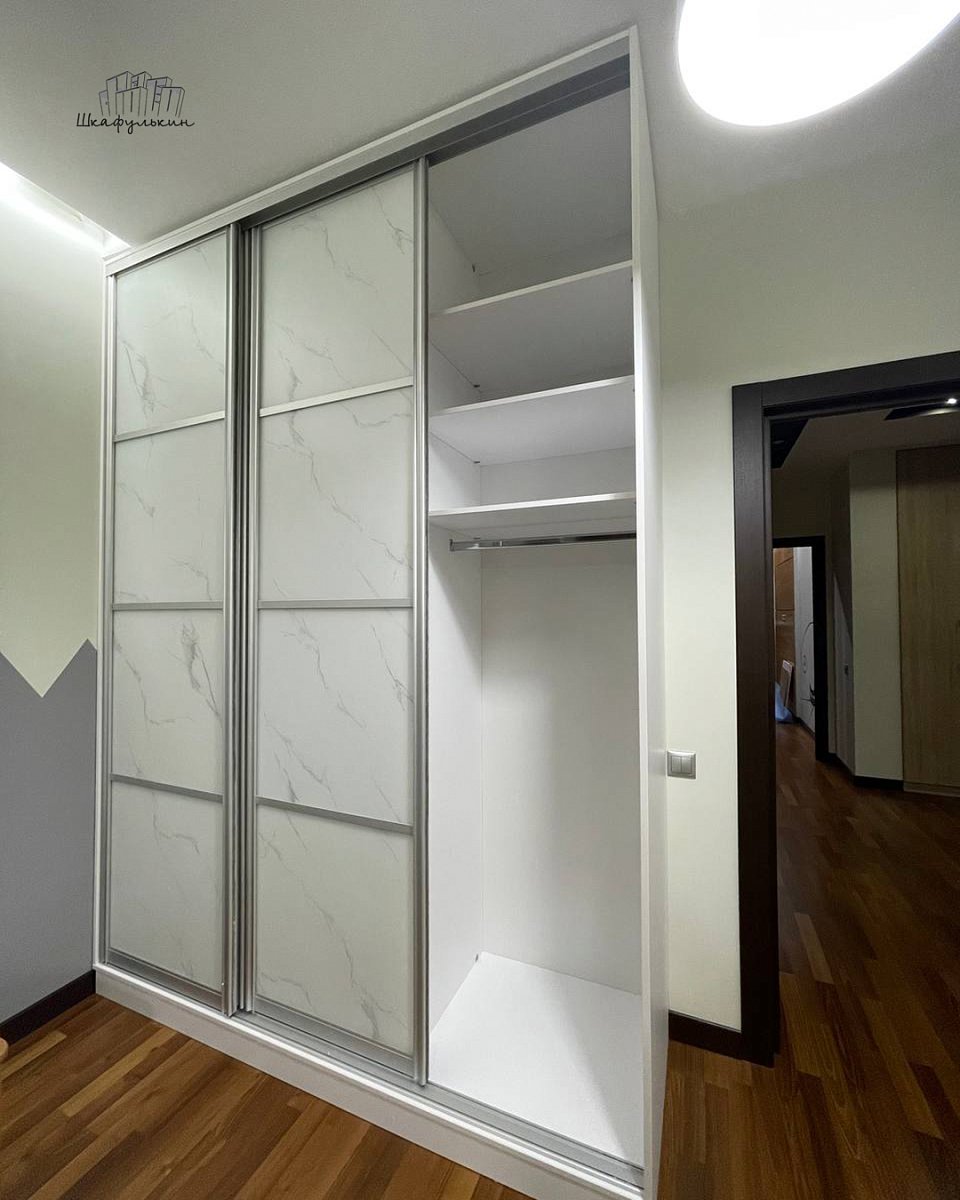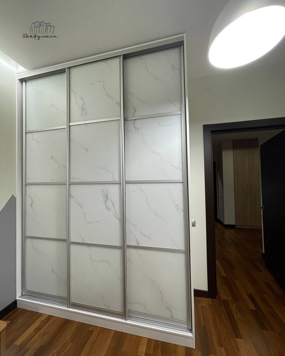 Двери-купе: 3 шт. / ITALUM CLASSIC-S, декор: Серебро / вставка 1: стекло Loft ML01 White / вставка 2: стекло Loft ML01 White /вставка 3: стекло Loft ML01 White / вставка 4: стекло Loft ML01 White / треки: Серебро / нижний трек: Серебро.