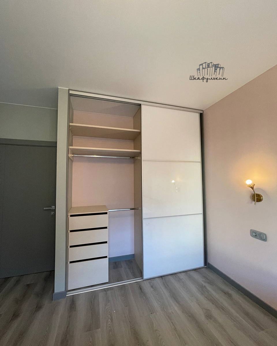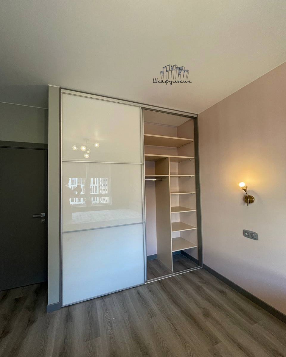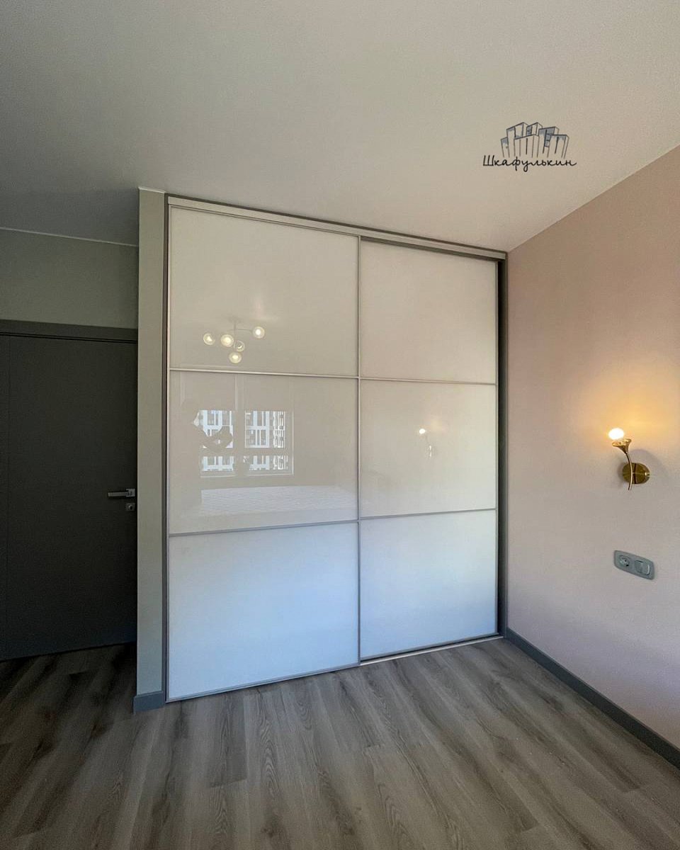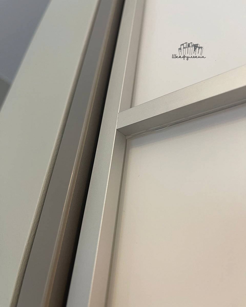 Двери-купе: 2 шт. / MODUS MS 163, декор: Серебро А00 / вставка 1: стекло LACOBEL 9003 White Pure / / вставка 2: стекло LACOBEL 9003 White Pure / вставка 3: стекло LACOBEL 9003 White Pure.