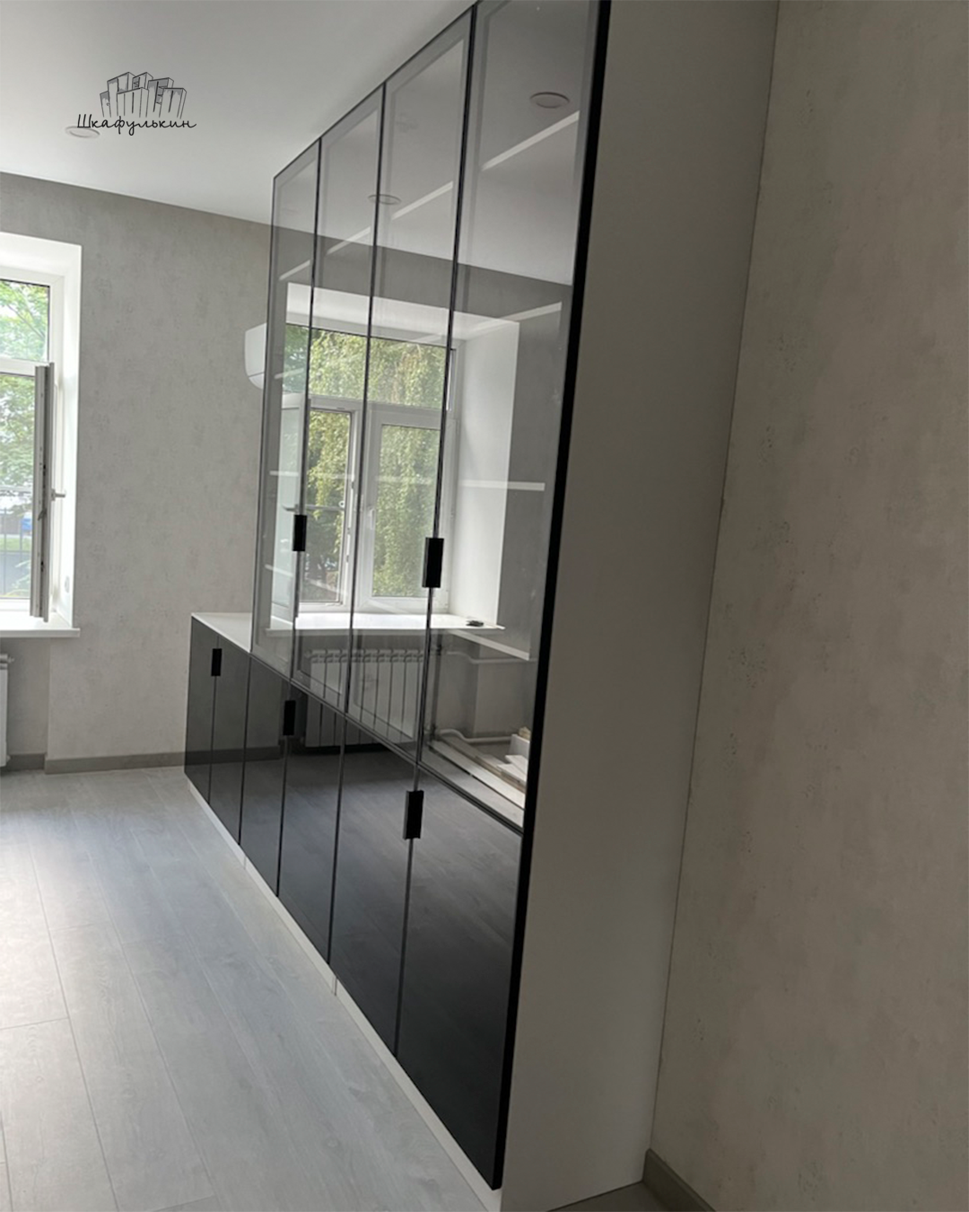 Фасад распашной: 4 шт. / рамочный / AL профиль ФБМ 8 / декор: чёрный / вставка: стекло прозрачное б/цв.